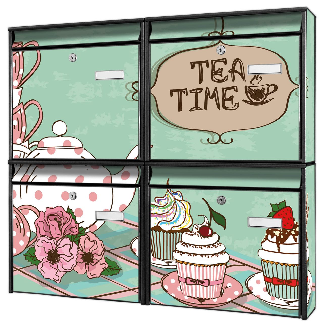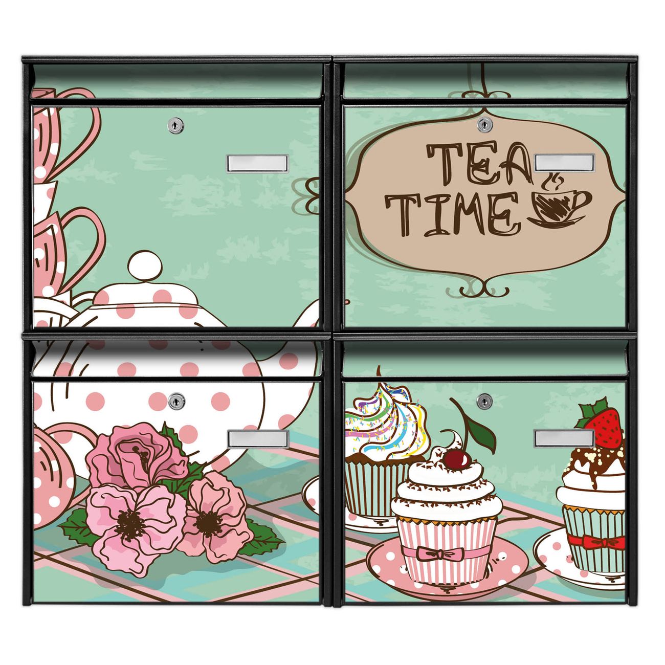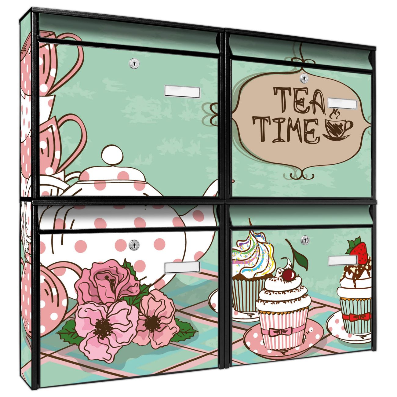 FUNKTION: Die Burg-Wächter Briefkastenanlage mit Motiv Tea Time bietet Ihnen ausreichend Fassungsvermögen um auch A4 und C4 Sendungen zu empfangen. Das integrierte Namensschild lässt sich individuell beschriften. Wählen Sie aus den Grundfarben weiß, silber und schwarz. DESIGN: Die 4 Briefkästen haben ein ansprechendes und zeitloses Design, ohne dabei auf Funktionalität zu verzichten. Das Material ist sehr stabil, wetterfest und rostfrei. Durch das Motiv Tea Time werden die Postkästen zu einem Blickfang. DETAILS: Die Postkästen bestehen aus verzinktem Stahl der zusätzlich mit Klarlack versiegelt wurde. Die Kästen sind gesamt 64,5cm hoch, 72,5cm breit und 10cm tief. Das Motiv besteht aus einer wetter- und UV-festen Folie, die Ihren Briefkasten zusätzlich vor Kratzern schützt. Die Postkästen werden mit Montagematerial, je einem Namensschild und je zwei Schlüsseln geliefert. NUTZEN: Das Briefkastenset eignet sich für die Wandmontage, die Größe bietet genügend Platz für Sendungen aller Art. Das zeitlose Design sowie die stabile Bauart bieten Ihnen einen treuen Begleiter für Ihre Post. BANJADO: