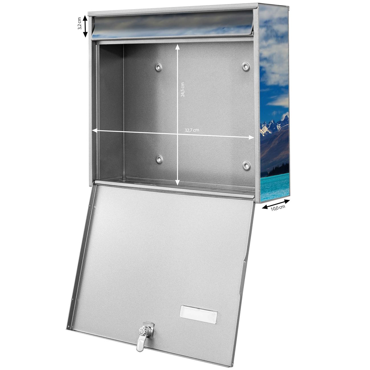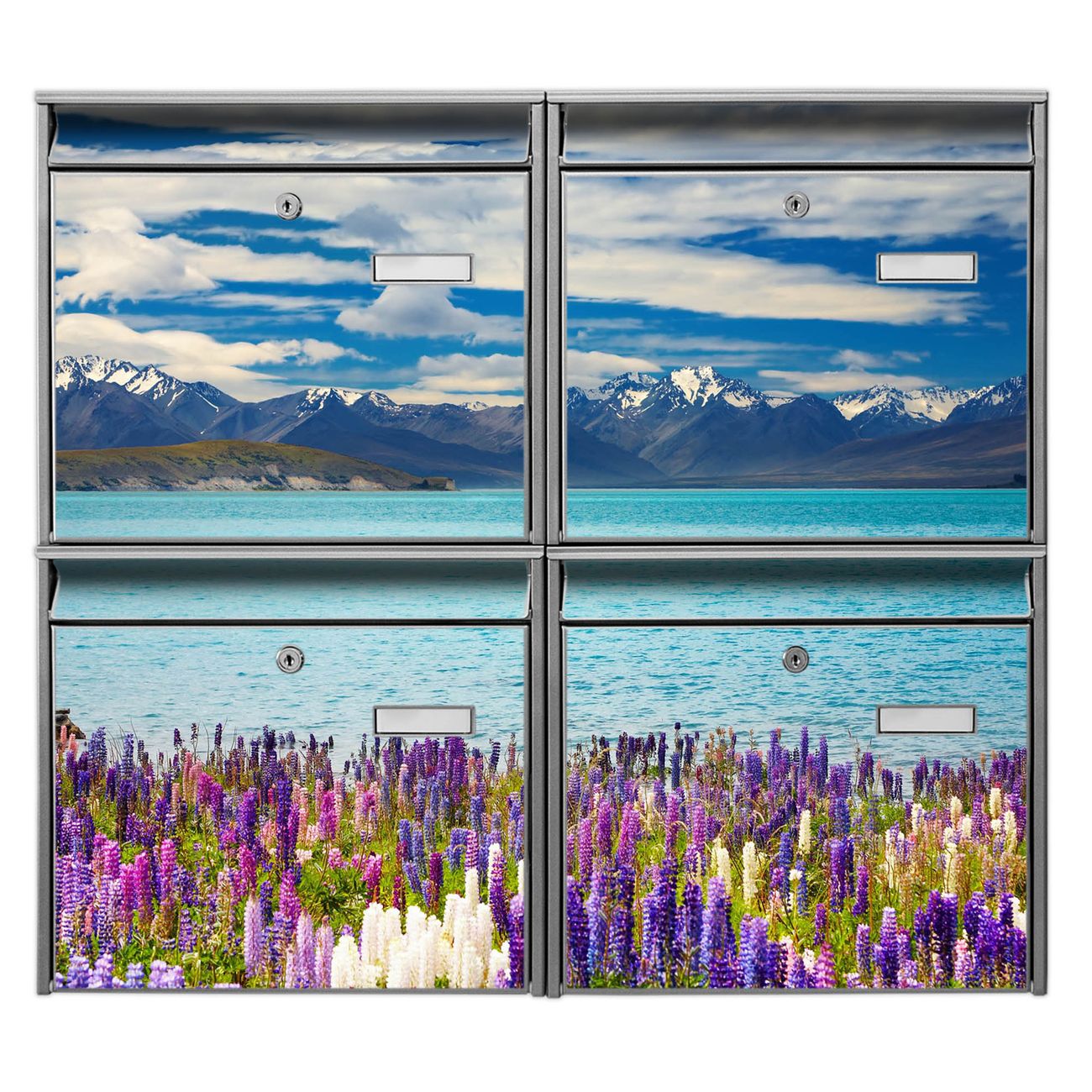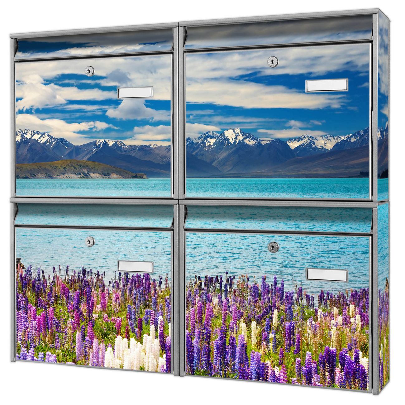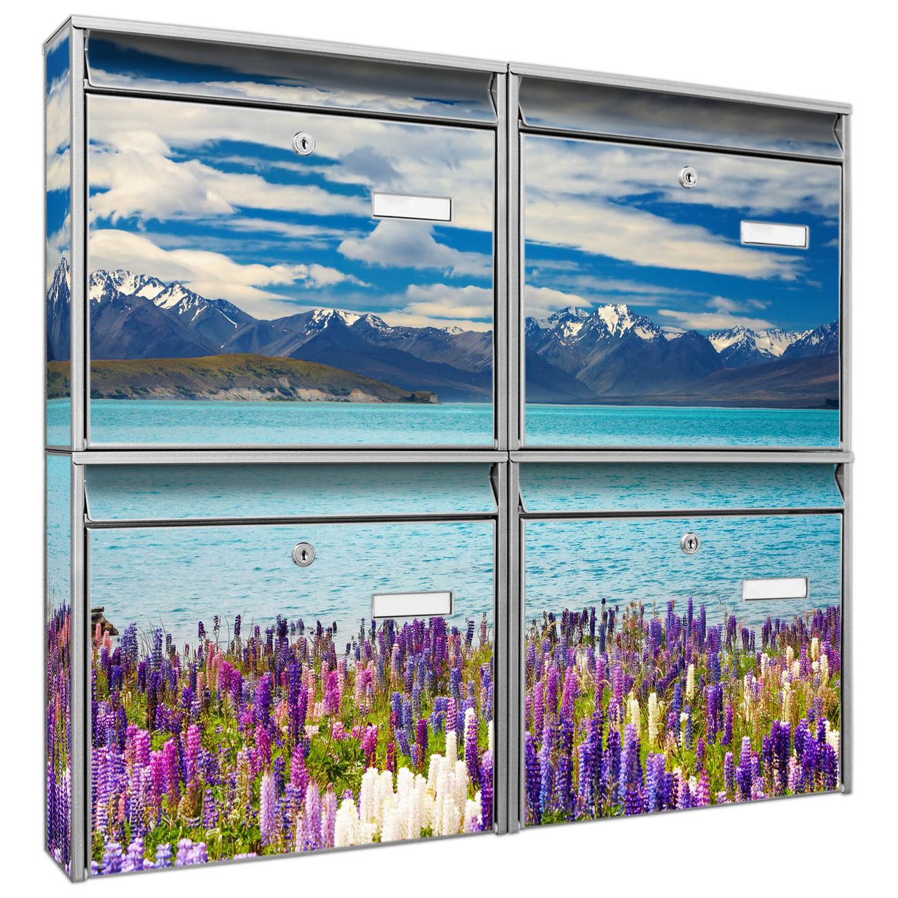 FUNKTION: Die Burg-Wächter Briefkastenanlage mit Motiv Tekapo See bietet Ihnen ausreichend Fassungsvermögen um auch A4 und C4 Sendungen zu empfangen. Das integrierte Namensschild lässt sich individuell beschriften. Wählen Sie aus den Grundfarben weiß, silber und schwarz. DESIGN: Die 4 Briefkästen haben ein ansprechendes und zeitloses Design, ohne dabei auf Funktionalität zu verzichten. Das Material ist sehr stabil, wetterfest und rostfrei. Durch das Motiv Tekapo See werden die Postkästen zu einem Blickfang. DETAILS: Die Postkästen bestehen aus verzinktem Stahl der zusätzlich mit Klarlack versiegelt wurde. Die Kästen sind gesamt 64,5cm hoch, 72,5cm breit und 10cm tief. Das Motiv besteht aus einer wetter- und UV-festen Folie, die Ihren Briefkasten zusätzlich vor Kratzern schützt. Die Postkästen werden mit Montagematerial, je einem Namensschild und je zwei Schlüsseln geliefert. NUTZEN: Das Briefkastenset eignet sich für die Wandmontage, die Größe bietet genügend Platz für Sendungen aller Art. Das zeitlose Design sowie die stabile Bauart bieten Ihnen einen treuen Begleiter für Ihre Post. BANJADO: