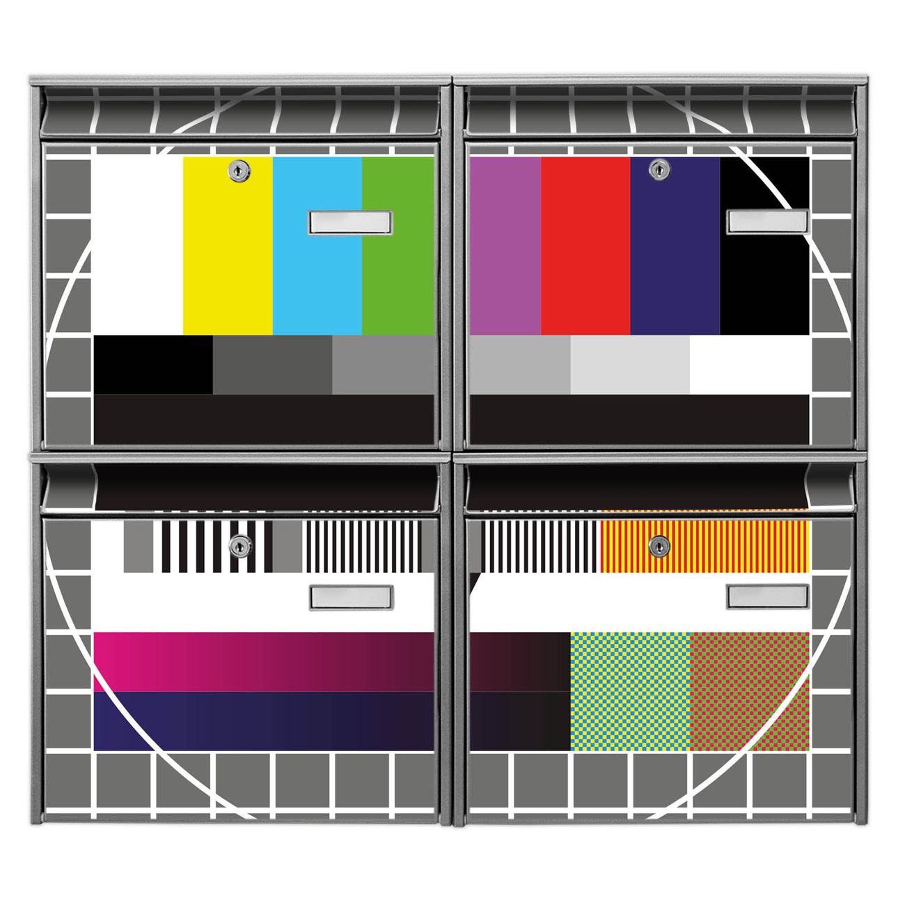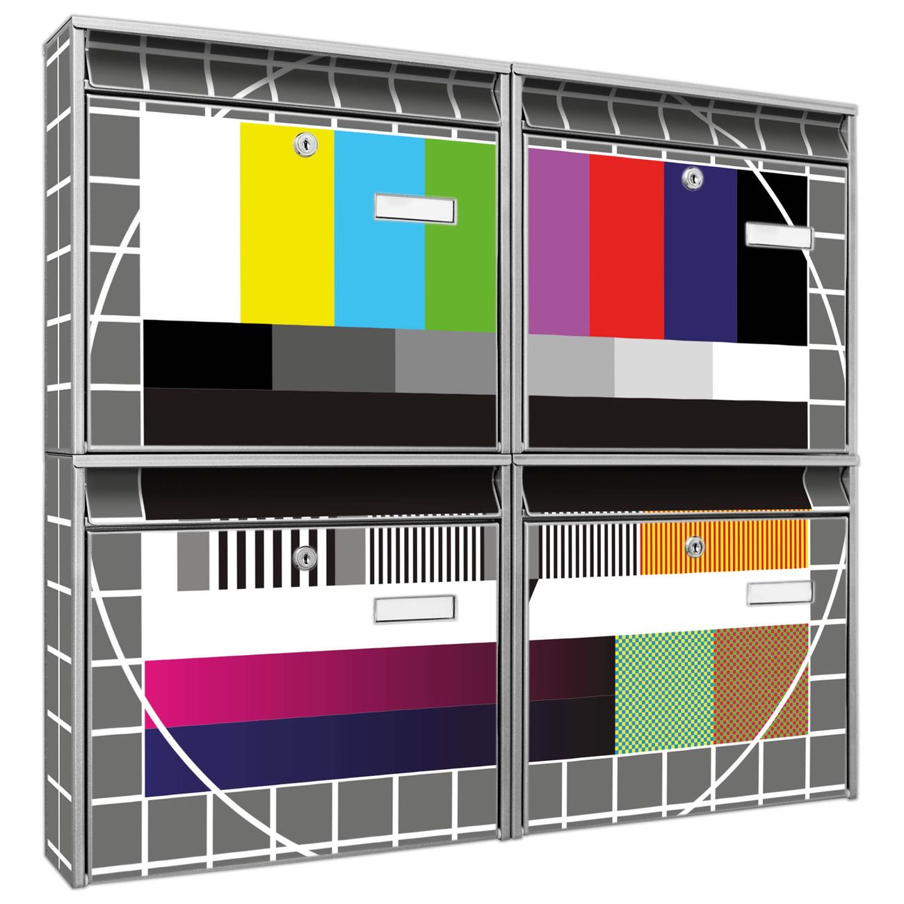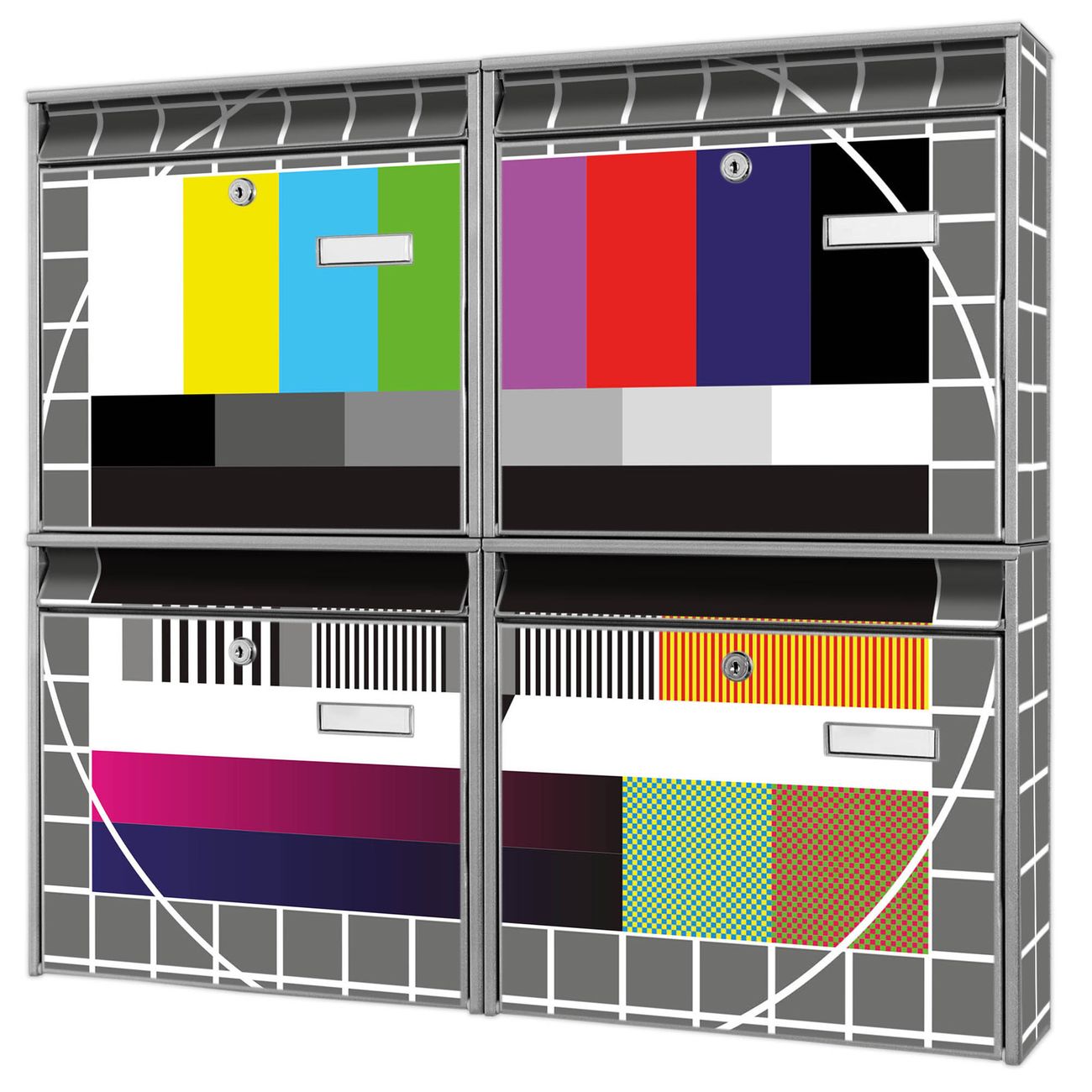 FUNKTION: Die Burg-Wächter Briefkastenanlage mit Motiv Testbild bietet Ihnen ausreichend Fassungsvermögen um auch A4 und C4 Sendungen zu empfangen. Das integrierte Namensschild lässt sich individuell beschriften. Wählen Sie aus den Grundfarben weiß, silber und schwarz. DESIGN: Die 4 Briefkästen haben ein ansprechendes und zeitloses Design, ohne dabei auf Funktionalität zu verzichten. Das Material ist sehr stabil, wetterfest und rostfrei. Durch das Motiv Testbild werden die Postkästen zu einem Blickfang. DETAILS: Die Postkästen bestehen aus verzinktem Stahl der zusätzlich mit Klarlack versiegelt wurde. Die Kästen sind gesamt 64,5cm hoch, 72,5cm breit und 10cm tief. Das Motiv besteht aus einer wetter- und UV-festen Folie, die Ihren Briefkasten zusätzlich vor Kratzern schützt. Die Postkästen werden mit Montagematerial, je einem Namensschild und je zwei Schlüsseln geliefert. NUTZEN: Das Briefkastenset eignet sich für die Wandmontage, die Größe bietet genügend Platz für Sendungen aller Art. Das zeitlose Design sowie die stabile Bauart bieten Ihnen einen treuen Begleiter für Ihre Post. BANJADO: