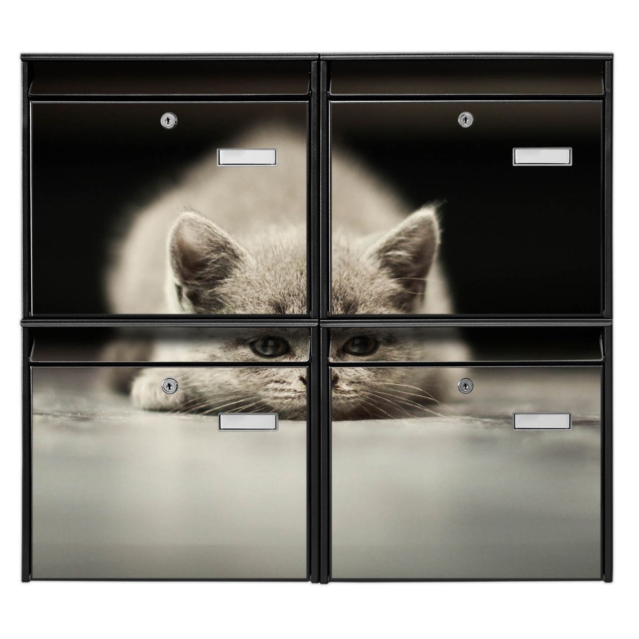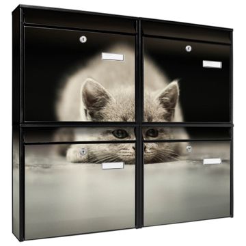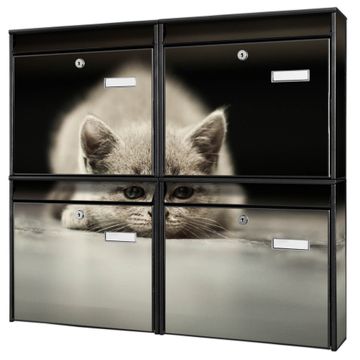 FUNKTION: Die Burg-Wächter Briefkastenanlage mit Motiv Theodor bietet Ihnen ausreichend Fassungsvermögen um auch A4 und C4 Sendungen zu empfangen. Das integrierte Namensschild lässt sich individuell beschriften. Wählen Sie aus den Grundfarben weiß, silber und schwarz. DESIGN: Die 4 Briefkästen haben ein ansprechendes und zeitloses Design, ohne dabei auf Funktionalität zu verzichten. Das Material ist sehr stabil, wetterfest und rostfrei. Durch das Motiv Theodor werden die Postkästen zu einem Blickfang. DETAILS: Die Postkästen bestehen aus verzinktem Stahl der zusätzlich mit Klarlack versiegelt wurde. Die Kästen sind gesamt 64,5cm hoch, 72,5cm breit und 10cm tief. Das Motiv besteht aus einer wetter- und UV-festen Folie, die Ihren Briefkasten zusätzlich vor Kratzern schützt. Die Postkästen werden mit Montagematerial, je einem Namensschild und je zwei Schlüsseln geliefert. NUTZEN: Das Briefkastenset eignet sich für die Wandmontage, die Größe bietet genügend Platz für Sendungen aller Art. Das zeitlose Design sowie die stabile Bauart bieten Ihnen einen treuen Begleiter für Ihre Post. BANJADO: