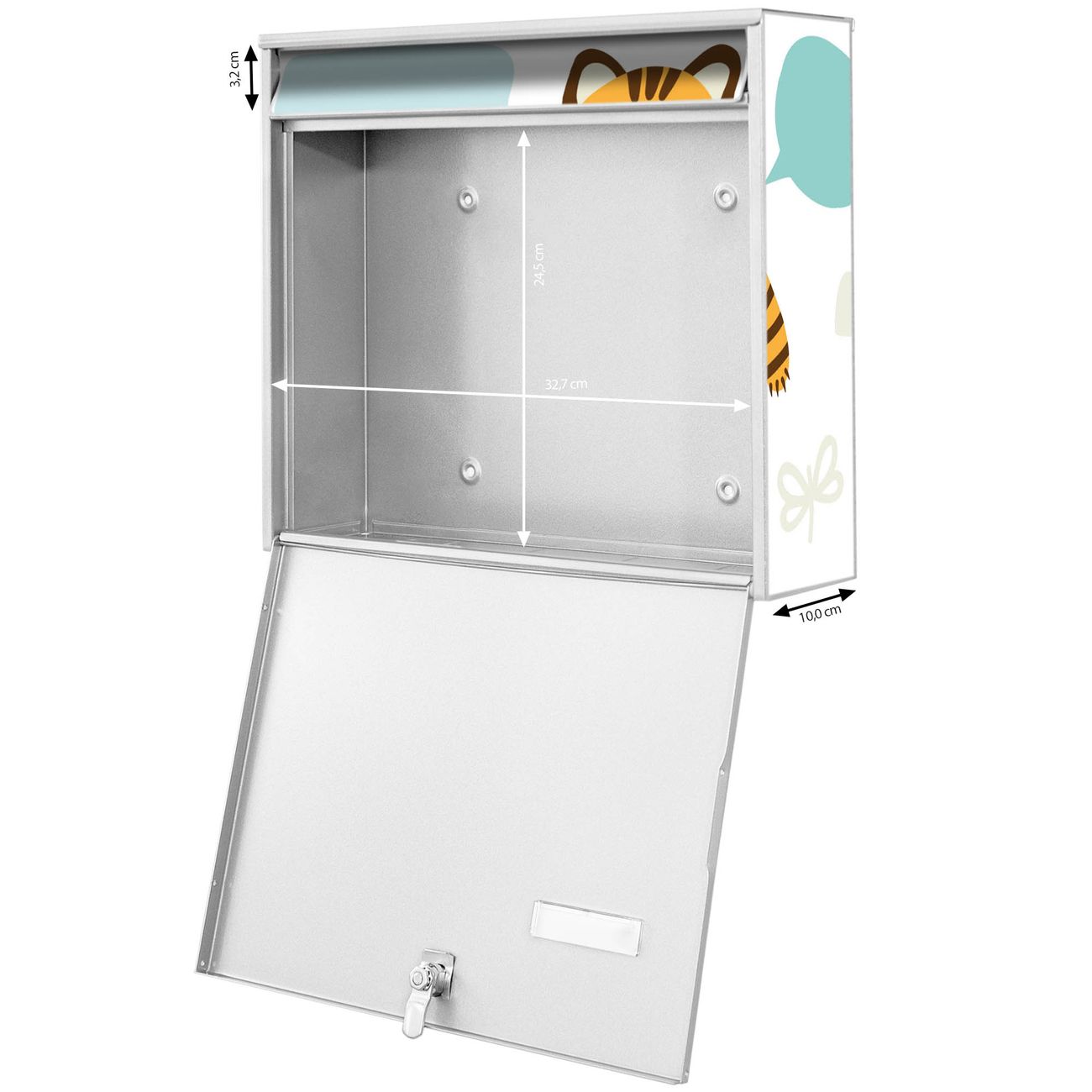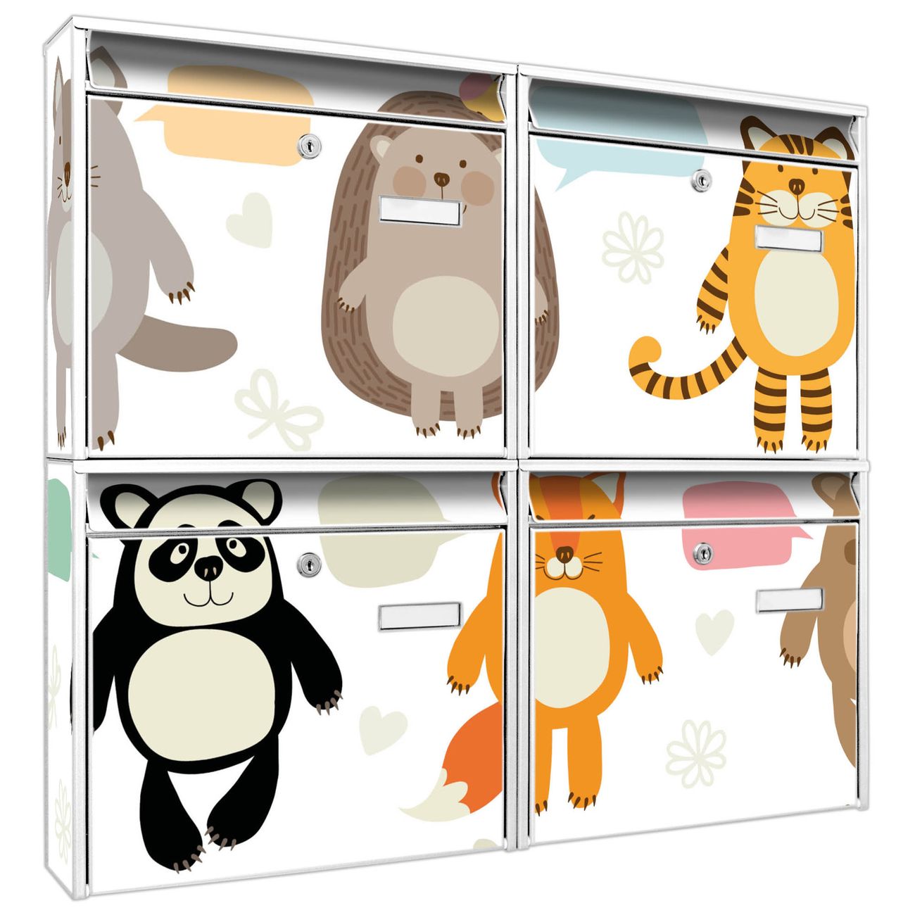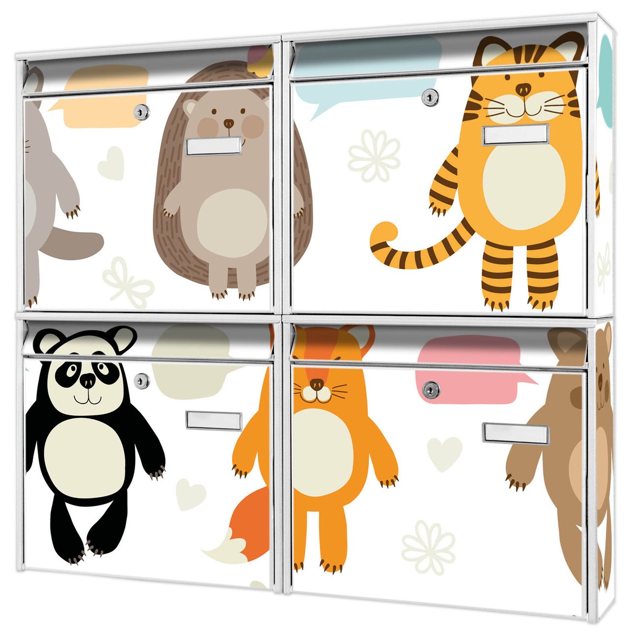 FUNKTION: Die Burg-Wächter Briefkastenanlage mit Motiv Tierfreunde bietet Ihnen ausreichend Fassungsvermögen um auch A4 und C4 Sendungen zu empfangen. Das integrierte Namensschild lässt sich individuell beschriften. Wählen Sie aus den Grundfarben weiß, silber und schwarz. DESIGN: Die 4 Briefkästen haben ein ansprechendes und zeitloses Design, ohne dabei auf Funktionalität zu verzichten. Das Material ist sehr stabil, wetterfest und rostfrei. Durch das Motiv Tierfreunde werden die Postkästen zu einem Blickfang. DETAILS: Die Postkästen bestehen aus verzinktem Stahl der zusätzlich mit Klarlack versiegelt wurde. Die Kästen sind gesamt 64,5cm hoch, 72,5cm breit und 10cm tief. Das Motiv besteht aus einer wetter- und UV-festen Folie, die Ihren Briefkasten zusätzlich vor Kratzern schützt. Die Postkästen werden mit Montagematerial, je einem Namensschild und je zwei Schlüsseln geliefert. NUTZEN: Das Briefkastenset eignet sich für die Wandmontage, die Größe bietet genügend Platz für Sendungen aller Art. Das zeitlose Design sowie die stabile Bauart bieten Ihnen einen treuen Begleiter für Ihre Post. BANJADO: