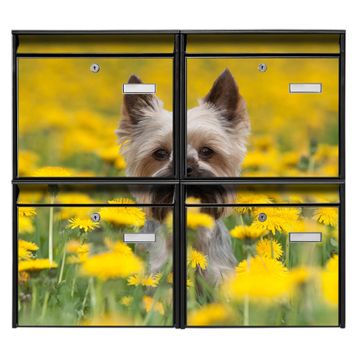 FUNKTION: Die Burg-Wächter Briefkastenanlage mit Motiv Tiffy bietet Ihnen ausreichend Fassungsvermögen um auch A4 und C4 Sendungen zu empfangen. Das integrierte Namensschild lässt sich individuell beschriften. Wählen Sie aus den Grundfarben weiß, silber und schwarz. DESIGN: Die 4 Briefkästen haben ein ansprechendes und zeitloses Design, ohne dabei auf Funktionalität zu verzichten. Das Material ist sehr stabil, wetterfest und rostfrei. Durch das Motiv Tiffy werden die Postkästen zu einem Blickfang. DETAILS: Die Postkästen bestehen aus verzinktem Stahl der zusätzlich mit Klarlack versiegelt wurde. Die Kästen sind gesamt 64,5cm hoch, 72,5cm breit und 10cm tief. Das Motiv besteht aus einer wetter- und UV-festen Folie, die Ihren Briefkasten zusätzlich vor Kratzern schützt. Die Postkästen werden mit Montagematerial, je einem Namensschild und je zwei Schlüsseln geliefert. NUTZEN: Das Briefkastenset eignet sich für die Wandmontage, die Größe bietet genügend Platz für Sendungen aller Art. Das zeitlose Design sowie die stabile Bauart bieten Ihnen einen treuen Begleiter für Ihre Post. BANJADO: