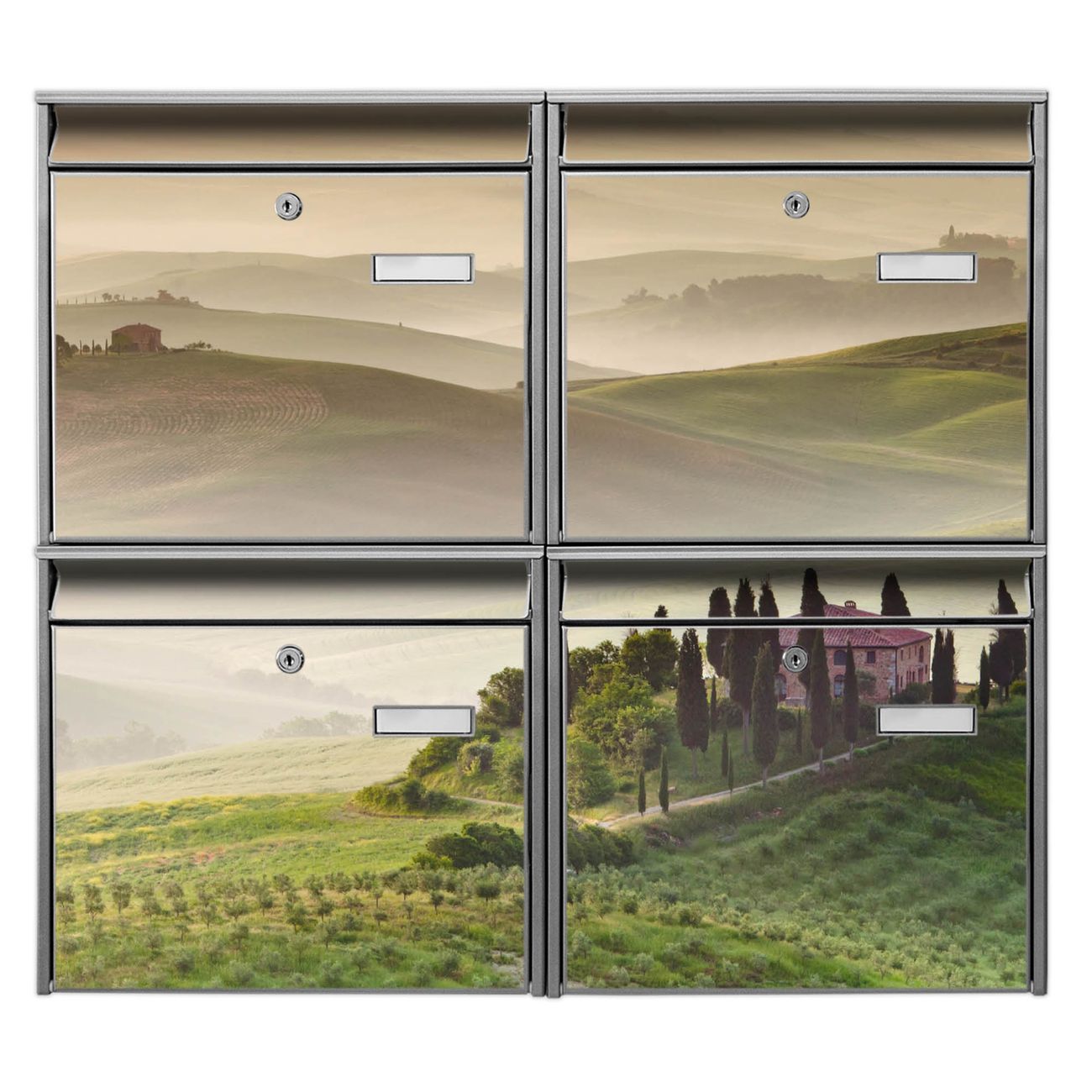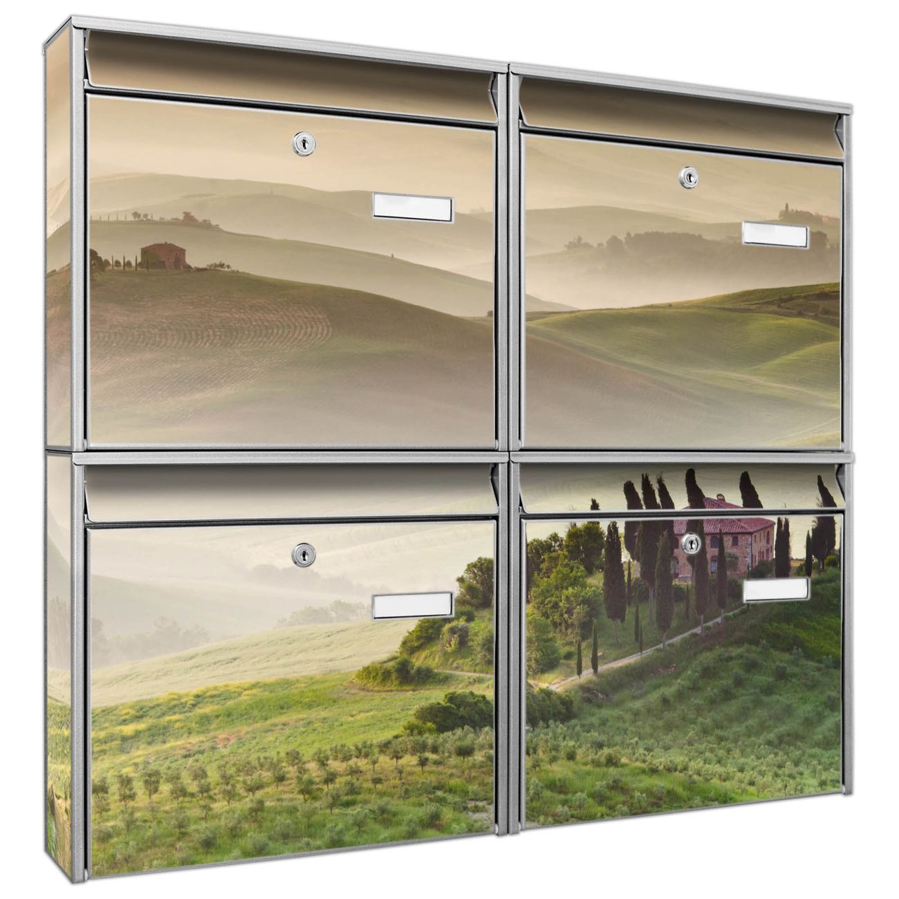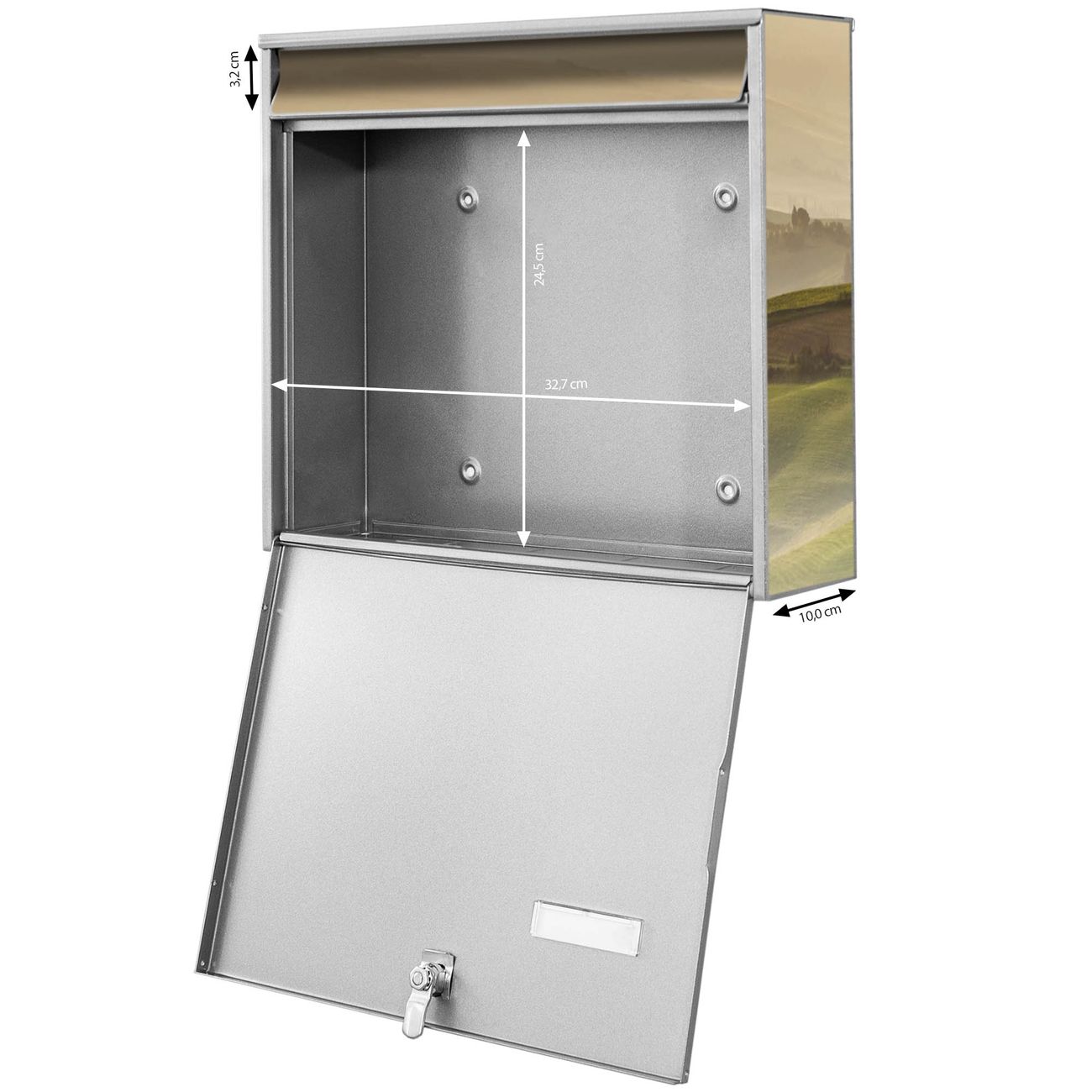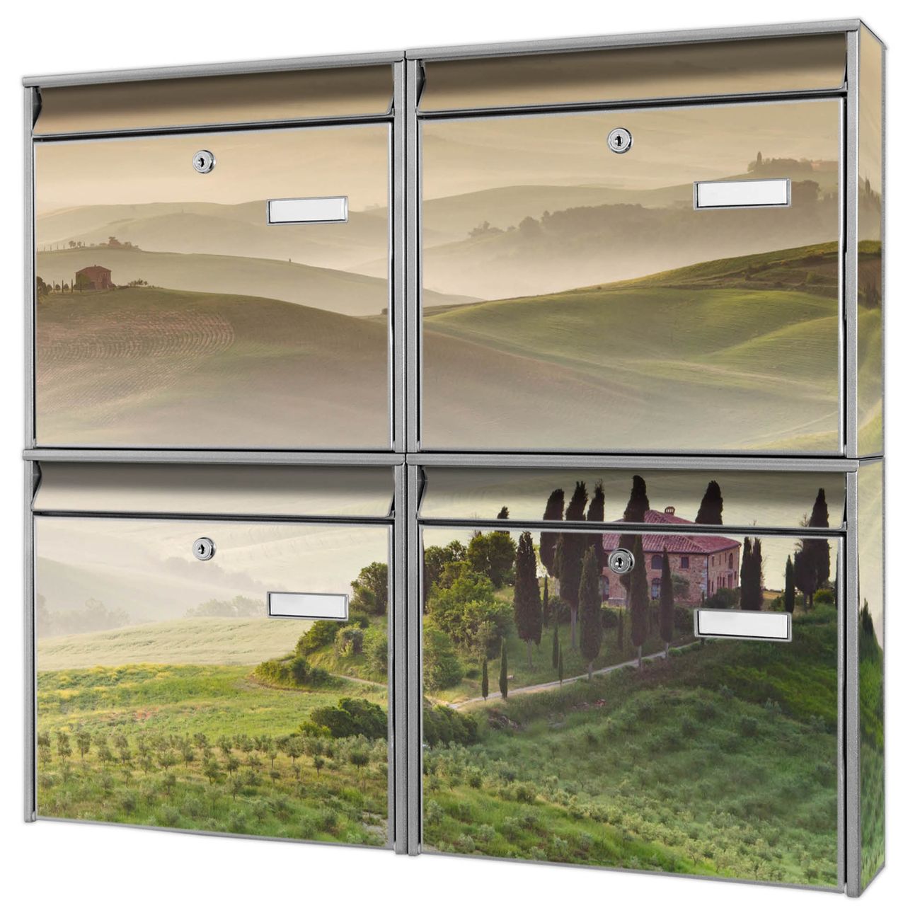 FUNKTION: Die Burg-Wächter Briefkastenanlage mit Motiv Toscana bietet Ihnen ausreichend Fassungsvermögen um auch A4 und C4 Sendungen zu empfangen. Das integrierte Namensschild lässt sich individuell beschriften. Wählen Sie aus den Grundfarben weiß, silber und schwarz. DESIGN: Die 4 Briefkästen haben ein ansprechendes und zeitloses Design, ohne dabei auf Funktionalität zu verzichten. Das Material ist sehr stabil, wetterfest und rostfrei. Durch das Motiv Toscana werden die Postkästen zu einem Blickfang. DETAILS: Die Postkästen bestehen aus verzinktem Stahl der zusätzlich mit Klarlack versiegelt wurde. Die Kästen sind gesamt 64,5cm hoch, 72,5cm breit und 10cm tief. Das Motiv besteht aus einer wetter- und UV-festen Folie, die Ihren Briefkasten zusätzlich vor Kratzern schützt. Die Postkästen werden mit Montagematerial, je einem Namensschild und je zwei Schlüsseln geliefert. NUTZEN: Das Briefkastenset eignet sich für die Wandmontage, die Größe bietet genügend Platz für Sendungen aller Art. Das zeitlose Design sowie die stabile Bauart bieten Ihnen einen treuen Begleiter für Ihre Post. BANJADO: