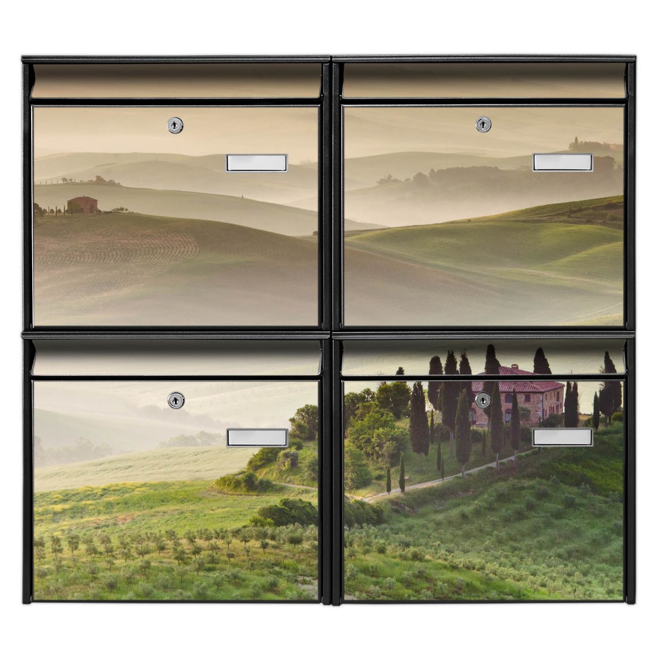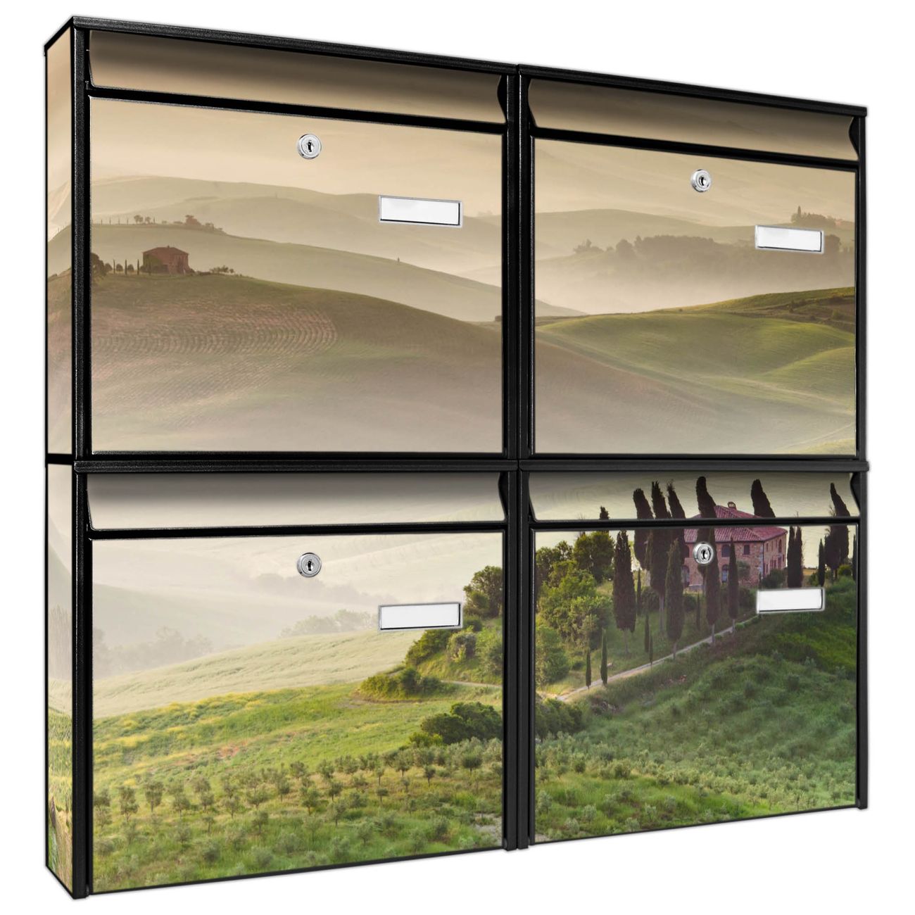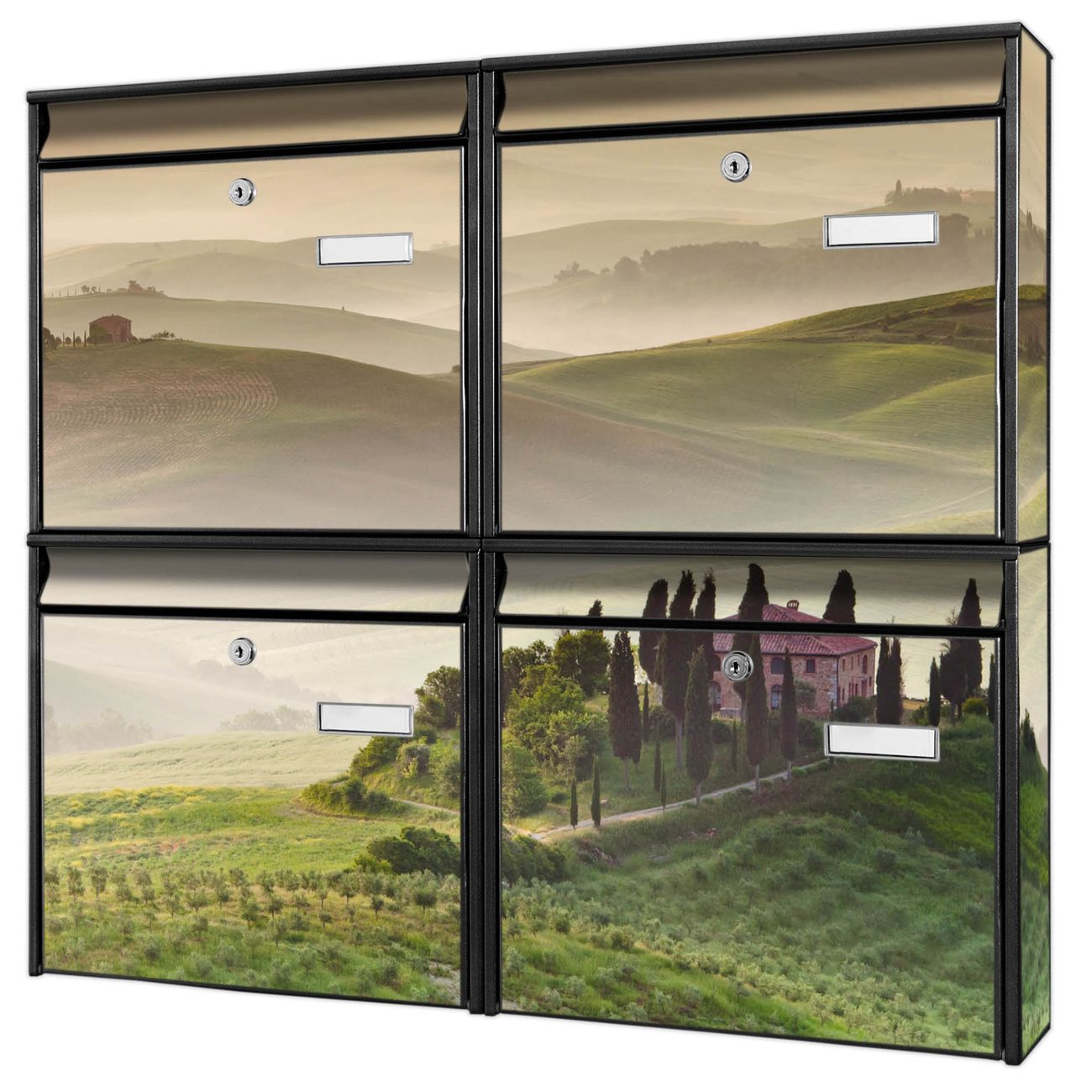 FUNKTION: Die Burg-Wächter Briefkastenanlage mit Motiv Toscana bietet Ihnen ausreichend Fassungsvermögen um auch A4 und C4 Sendungen zu empfangen. Das integrierte Namensschild lässt sich individuell beschriften. Wählen Sie aus den Grundfarben weiß, silber und schwarz. DESIGN: Die 4 Briefkästen haben ein ansprechendes und zeitloses Design, ohne dabei auf Funktionalität zu verzichten. Das Material ist sehr stabil, wetterfest und rostfrei. Durch das Motiv Toscana werden die Postkästen zu einem Blickfang. DETAILS: Die Postkästen bestehen aus verzinktem Stahl der zusätzlich mit Klarlack versiegelt wurde. Die Kästen sind gesamt 64,5cm hoch, 72,5cm breit und 10cm tief. Das Motiv besteht aus einer wetter- und UV-festen Folie, die Ihren Briefkasten zusätzlich vor Kratzern schützt. Die Postkästen werden mit Montagematerial, je einem Namensschild und je zwei Schlüsseln geliefert. NUTZEN: Das Briefkastenset eignet sich für die Wandmontage, die Größe bietet genügend Platz für Sendungen aller Art. Das zeitlose Design sowie die stabile Bauart bieten Ihnen einen treuen Begleiter für Ihre Post. BANJADO: