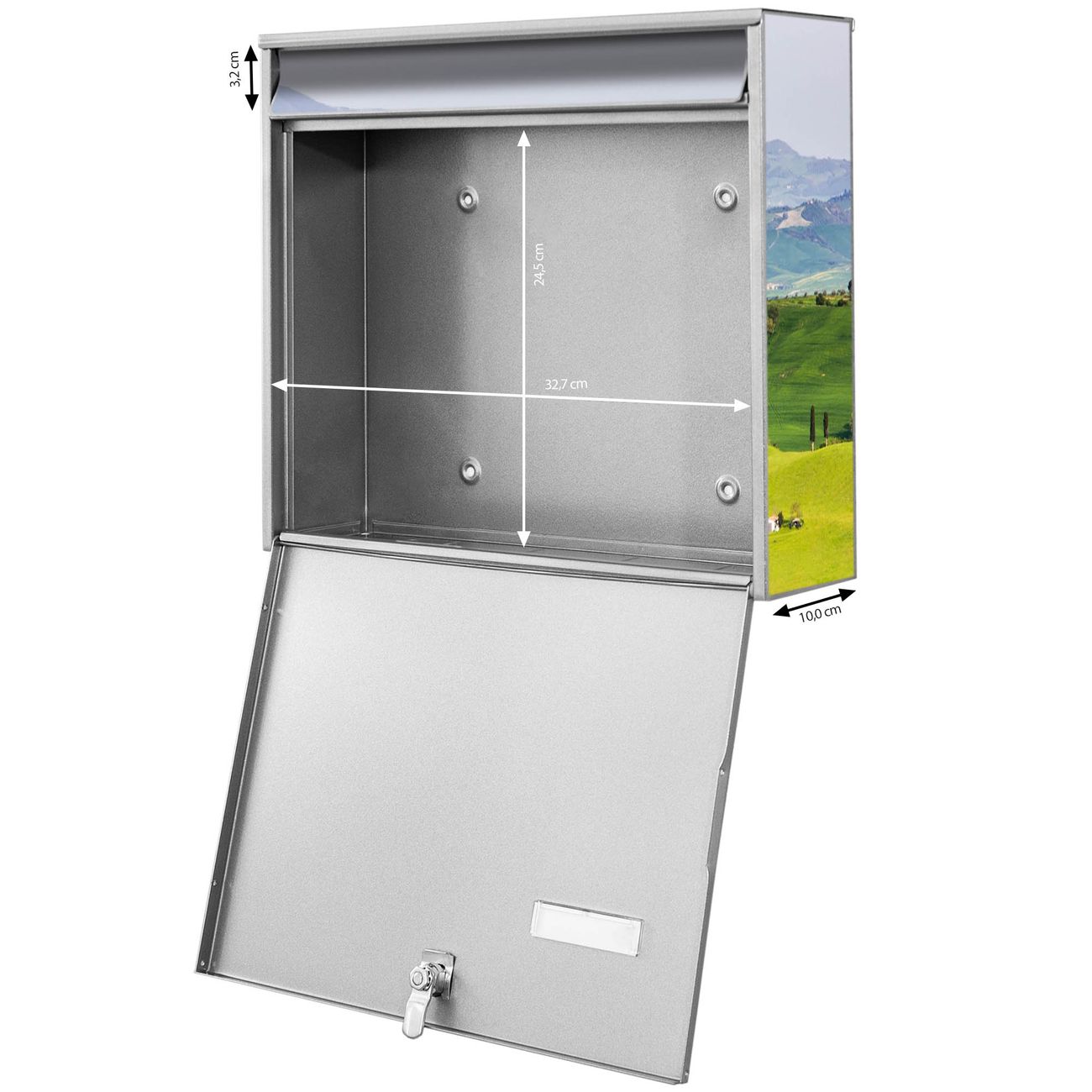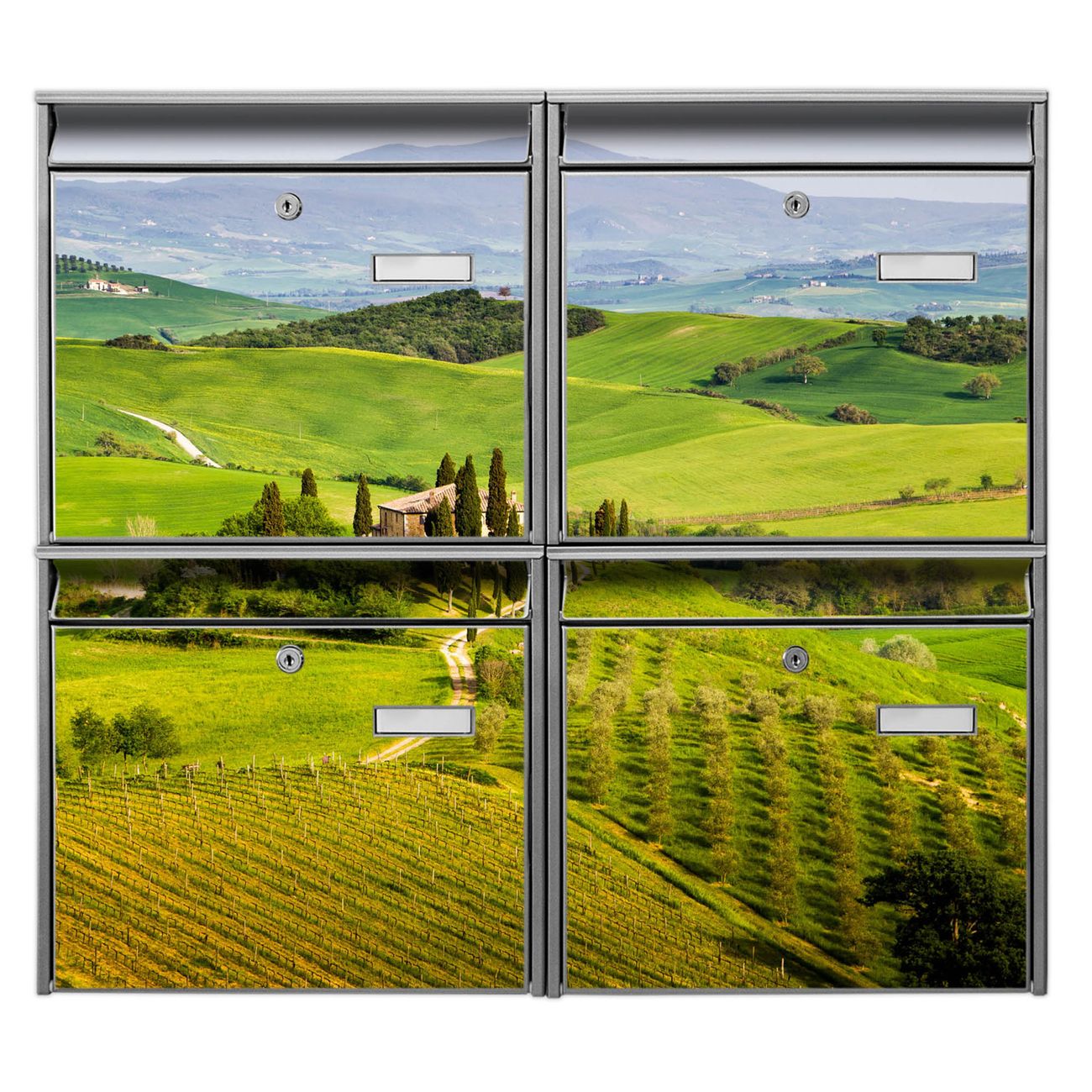 FUNKTION: Die Burg-Wächter Briefkastenanlage mit Motiv Toskana bietet Ihnen ausreichend Fassungsvermögen um auch A4 und C4 Sendungen zu empfangen. Das integrierte Namensschild lässt sich individuell beschriften. Wählen Sie aus den Grundfarben weiß, silber und schwarz. DESIGN: Die 4 Briefkästen haben ein ansprechendes und zeitloses Design, ohne dabei auf Funktionalität zu verzichten. Das Material ist sehr stabil, wetterfest und rostfrei. Durch das Motiv Toskana werden die Postkästen zu einem Blickfang. DETAILS: Die Postkästen bestehen aus verzinktem Stahl der zusätzlich mit Klarlack versiegelt wurde. Die Kästen sind gesamt 64,5cm hoch, 72,5cm breit und 10cm tief. Das Motiv besteht aus einer wetter- und UV-festen Folie, die Ihren Briefkasten zusätzlich vor Kratzern schützt. Die Postkästen werden mit Montagematerial, je einem Namensschild und je zwei Schlüsseln geliefert. NUTZEN: Das Briefkastenset eignet sich für die Wandmontage, die Größe bietet genügend Platz für Sendungen aller Art. Das zeitlose Design sowie die stabile Bauart bieten Ihnen einen treuen Begleiter für Ihre Post. BANJADO: