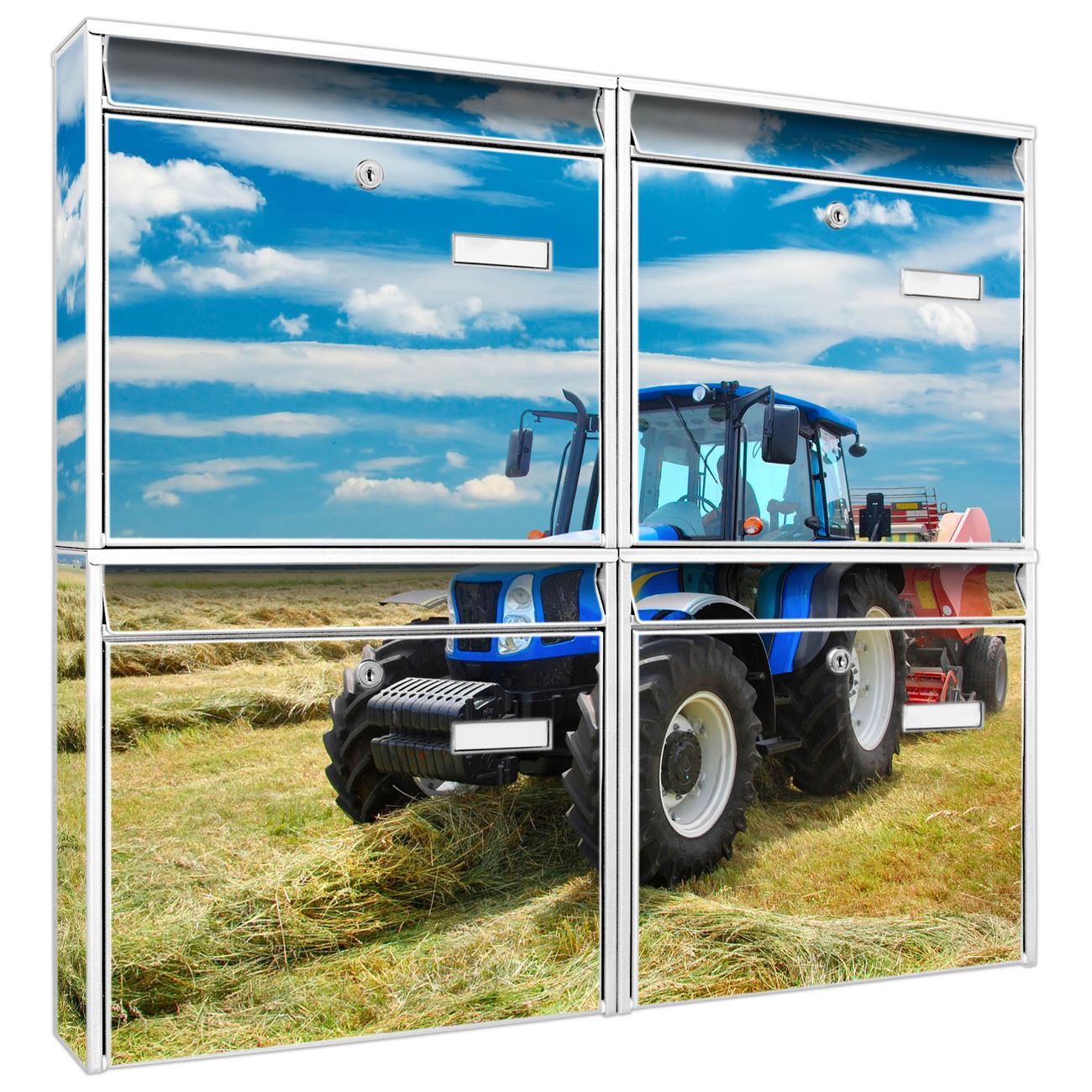 FUNKTION: Die Burg-Wächter Briefkastenanlage mit Motiv Traktor bietet Ihnen ausreichend Fassungsvermögen um auch A4 und C4 Sendungen zu empfangen. Das integrierte Namensschild lässt sich individuell beschriften. Wählen Sie aus den Grundfarben weiß, silber und schwarz. DESIGN: Die 4 Briefkästen haben ein ansprechendes und zeitloses Design, ohne dabei auf Funktionalität zu verzichten. Das Material ist sehr stabil, wetterfest und rostfrei. Durch das Motiv Traktor werden die Postkästen zu einem Blickfang. DETAILS: Die Postkästen bestehen aus verzinktem Stahl der zusätzlich mit Klarlack versiegelt wurde. Die Kästen sind gesamt 64,5cm hoch, 72,5cm breit und 10cm tief. Das Motiv besteht aus einer wetter- und UV-festen Folie, die Ihren Briefkasten zusätzlich vor Kratzern schützt. Die Postkästen werden mit Montagematerial, je einem Namensschild und je zwei Schlüsseln geliefert. NUTZEN: Das Briefkastenset eignet sich für die Wandmontage, die Größe bietet genügend Platz für Sendungen aller Art. Das zeitlose Design sowie die stabile Bauart bieten Ihnen einen treuen Begleiter für Ihre Post. BANJADO: