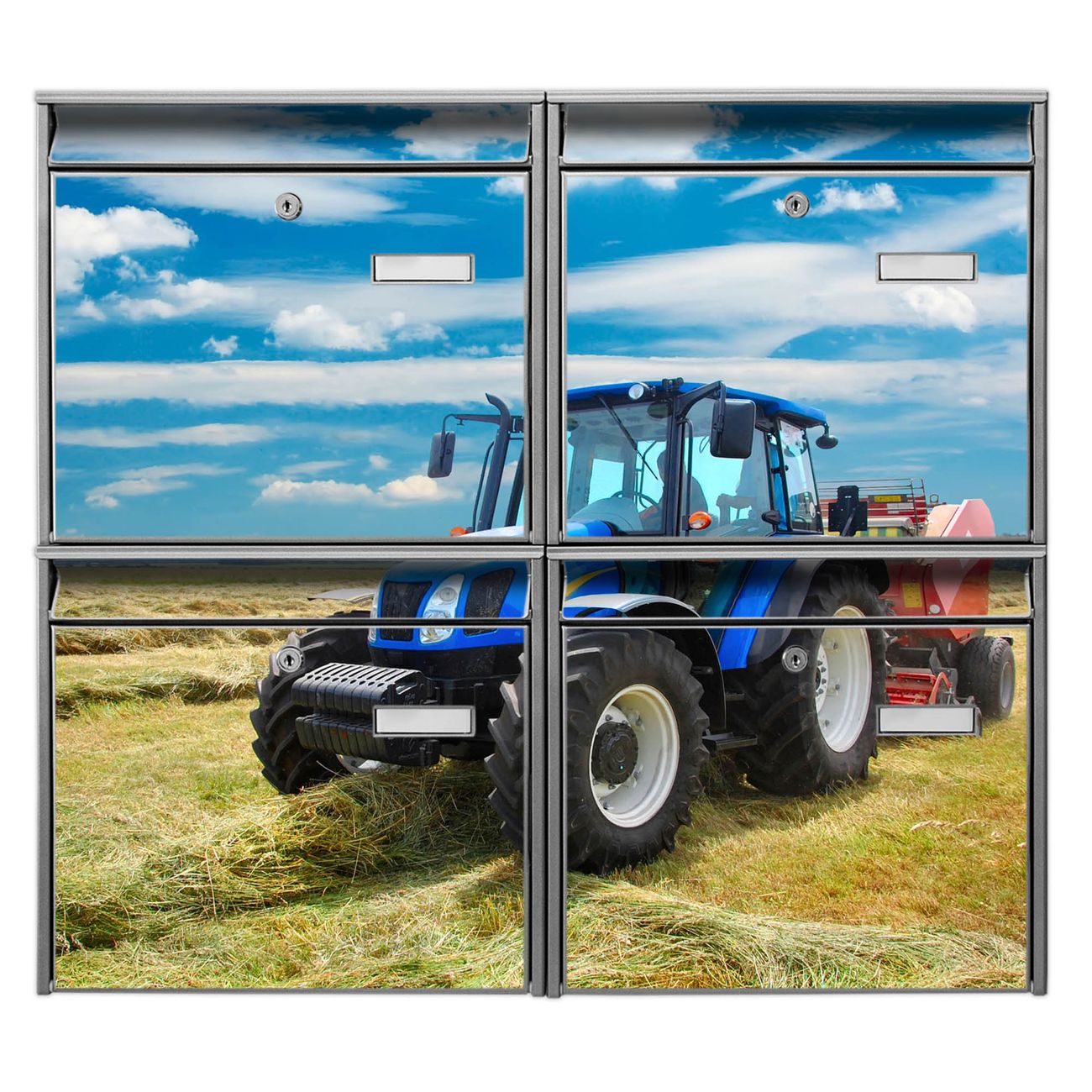 FUNKTION: Die Burg-Wächter Briefkastenanlage mit Motiv Traktor bietet Ihnen ausreichend Fassungsvermögen um auch A4 und C4 Sendungen zu empfangen. Das integrierte Namensschild lässt sich individuell beschriften. Wählen Sie aus den Grundfarben weiß, silber und schwarz. DESIGN: Die 4 Briefkästen haben ein ansprechendes und zeitloses Design, ohne dabei auf Funktionalität zu verzichten. Das Material ist sehr stabil, wetterfest und rostfrei. Durch das Motiv Traktor werden die Postkästen zu einem Blickfang. DETAILS: Die Postkästen bestehen aus verzinktem Stahl der zusätzlich mit Klarlack versiegelt wurde. Die Kästen sind gesamt 64,5cm hoch, 72,5cm breit und 10cm tief. Das Motiv besteht aus einer wetter- und UV-festen Folie, die Ihren Briefkasten zusätzlich vor Kratzern schützt. Die Postkästen werden mit Montagematerial, je einem Namensschild und je zwei Schlüsseln geliefert. NUTZEN: Das Briefkastenset eignet sich für die Wandmontage, die Größe bietet genügend Platz für Sendungen aller Art. Das zeitlose Design sowie die stabile Bauart bieten Ihnen einen treuen Begleiter für Ihre Post. BANJADO: