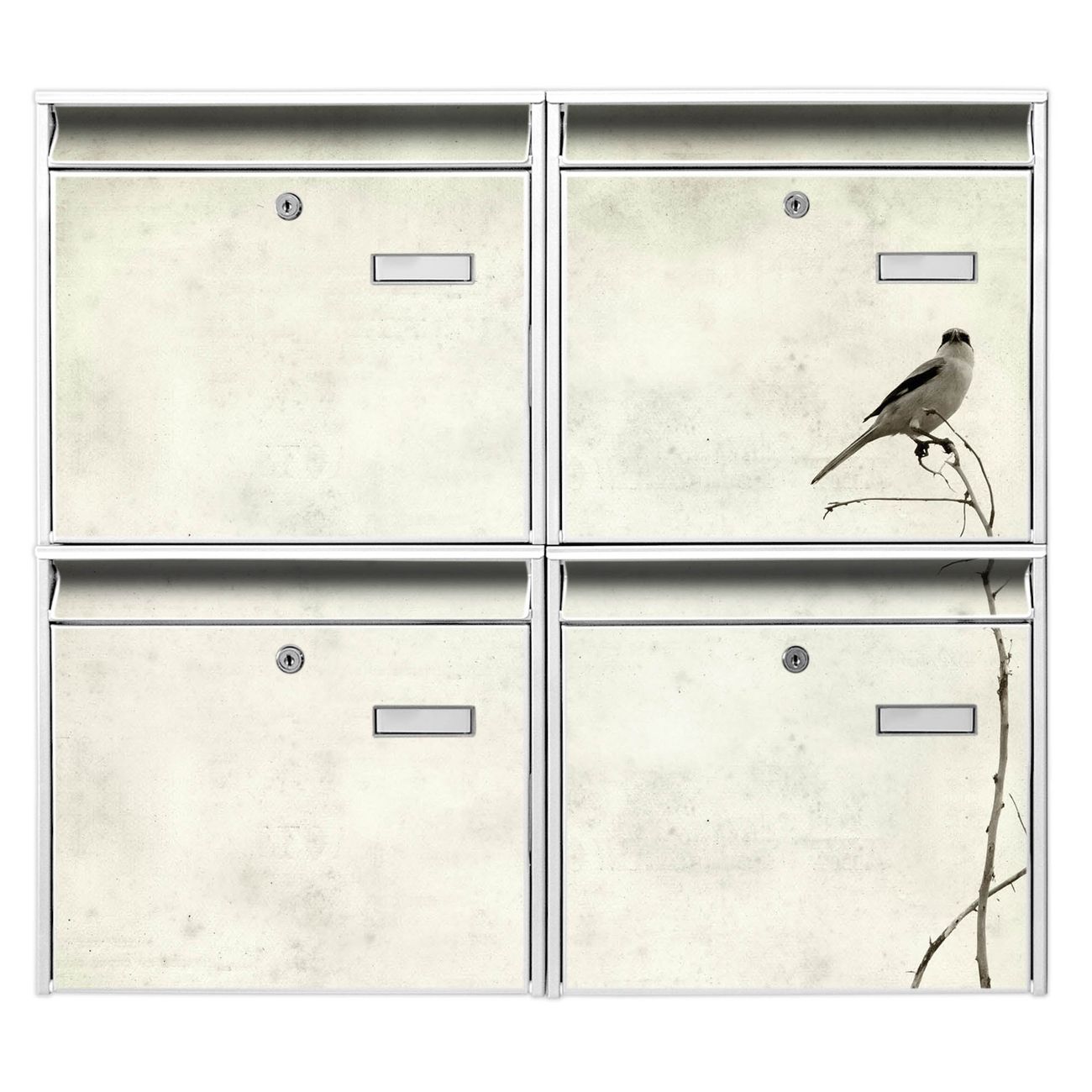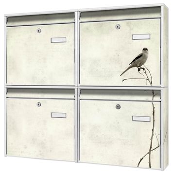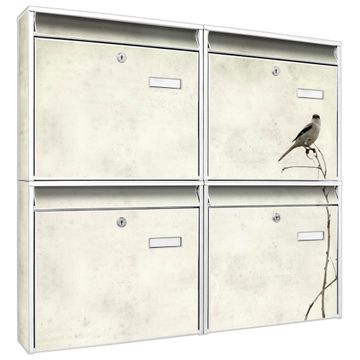 FUNKTION: Die Burg-Wächter Briefkastenanlage mit Motiv Tristessa bietet Ihnen ausreichend Fassungsvermögen um auch A4 und C4 Sendungen zu empfangen. Das integrierte Namensschild lässt sich individuell beschriften. Wählen Sie aus den Grundfarben weiß, silber und schwarz. DESIGN: Die 4 Briefkästen haben ein ansprechendes und zeitloses Design, ohne dabei auf Funktionalität zu verzichten. Das Material ist sehr stabil, wetterfest und rostfrei. Durch das Motiv Tristessa werden die Postkästen zu einem Blickfang. DETAILS: Die Postkästen bestehen aus verzinktem Stahl der zusätzlich mit Klarlack versiegelt wurde. Die Kästen sind gesamt 64,5cm hoch, 72,5cm breit und 10cm tief. Das Motiv besteht aus einer wetter- und UV-festen Folie, die Ihren Briefkasten zusätzlich vor Kratzern schützt. Die Postkästen werden mit Montagematerial, je einem Namensschild und je zwei Schlüsseln geliefert. NUTZEN: Das Briefkastenset eignet sich für die Wandmontage, die Größe bietet genügend Platz für Sendungen aller Art. Das zeitlose Design sowie die stabile Bauart bieten Ihnen einen treuen Begleiter für Ihre Post. BANJADO: