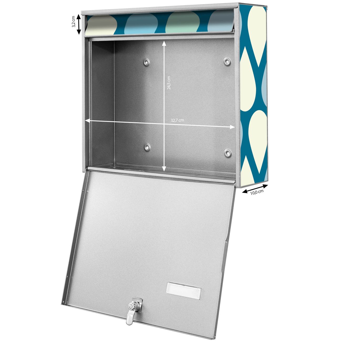 FUNKTION: Die Burg-Wächter Briefkastenanlage mit Motiv Tropfen bietet Ihnen ausreichend Fassungsvermögen um auch A4 und C4 Sendungen zu empfangen. Das integrierte Namensschild lässt sich individuell beschriften. Wählen Sie aus den Grundfarben weiß, silber und schwarz. DESIGN: Die 4 Briefkästen haben ein ansprechendes und zeitloses Design, ohne dabei auf Funktionalität zu verzichten. Das Material ist sehr stabil, wetterfest und rostfrei. Durch das Motiv Tropfen werden die Postkästen zu einem Blickfang. DETAILS: Die Postkästen bestehen aus verzinktem Stahl der zusätzlich mit Klarlack versiegelt wurde. Die Kästen sind gesamt 64,5cm hoch, 72,5cm breit und 10cm tief. Das Motiv besteht aus einer wetter- und UV-festen Folie, die Ihren Briefkasten zusätzlich vor Kratzern schützt. Die Postkästen werden mit Montagematerial, je einem Namensschild und je zwei Schlüsseln geliefert. NUTZEN: Das Briefkastenset eignet sich für die Wandmontage, die Größe bietet genügend Platz für Sendungen aller Art. Das zeitlose Design sowie die stabile Bauart bieten Ihnen einen treuen Begleiter für Ihre Post. BANJADO:
