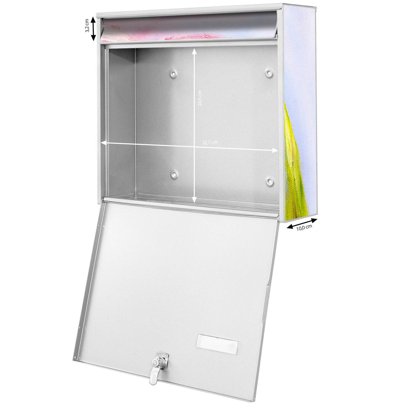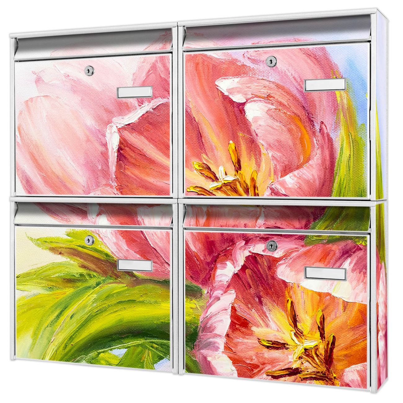 FUNKTION: Die Burg-Wächter Briefkastenanlage mit Motiv Tulpen Detail bietet Ihnen ausreichend Fassungsvermögen um auch A4 und C4 Sendungen zu empfangen. Das integrierte Namensschild lässt sich individuell beschriften. Wählen Sie aus den Grundfarben weiß, silber und schwarz. DESIGN: Die 4 Briefkästen haben ein ansprechendes und zeitloses Design, ohne dabei auf Funktionalität zu verzichten. Das Material ist sehr stabil, wetterfest und rostfrei. Durch das Motiv Tulpen Detail werden die Postkästen zu einem Blickfang. DETAILS: Die Postkästen bestehen aus verzinktem Stahl der zusätzlich mit Klarlack versiegelt wurde. Die Kästen sind gesamt 64,5cm hoch, 72,5cm breit und 10cm tief. Das Motiv besteht aus einer wetter- und UV-festen Folie, die Ihren Briefkasten zusätzlich vor Kratzern schützt. Die Postkästen werden mit Montagematerial, je einem Namensschild und je zwei Schlüsseln geliefert. NUTZEN: Das Briefkastenset eignet sich für die Wandmontage, die Größe bietet genügend Platz für Sendungen aller Art. Das zeitlose Design sowie die stabile Bauart bieten Ihnen einen treuen Begleiter für Ihre Post. BANJADO: