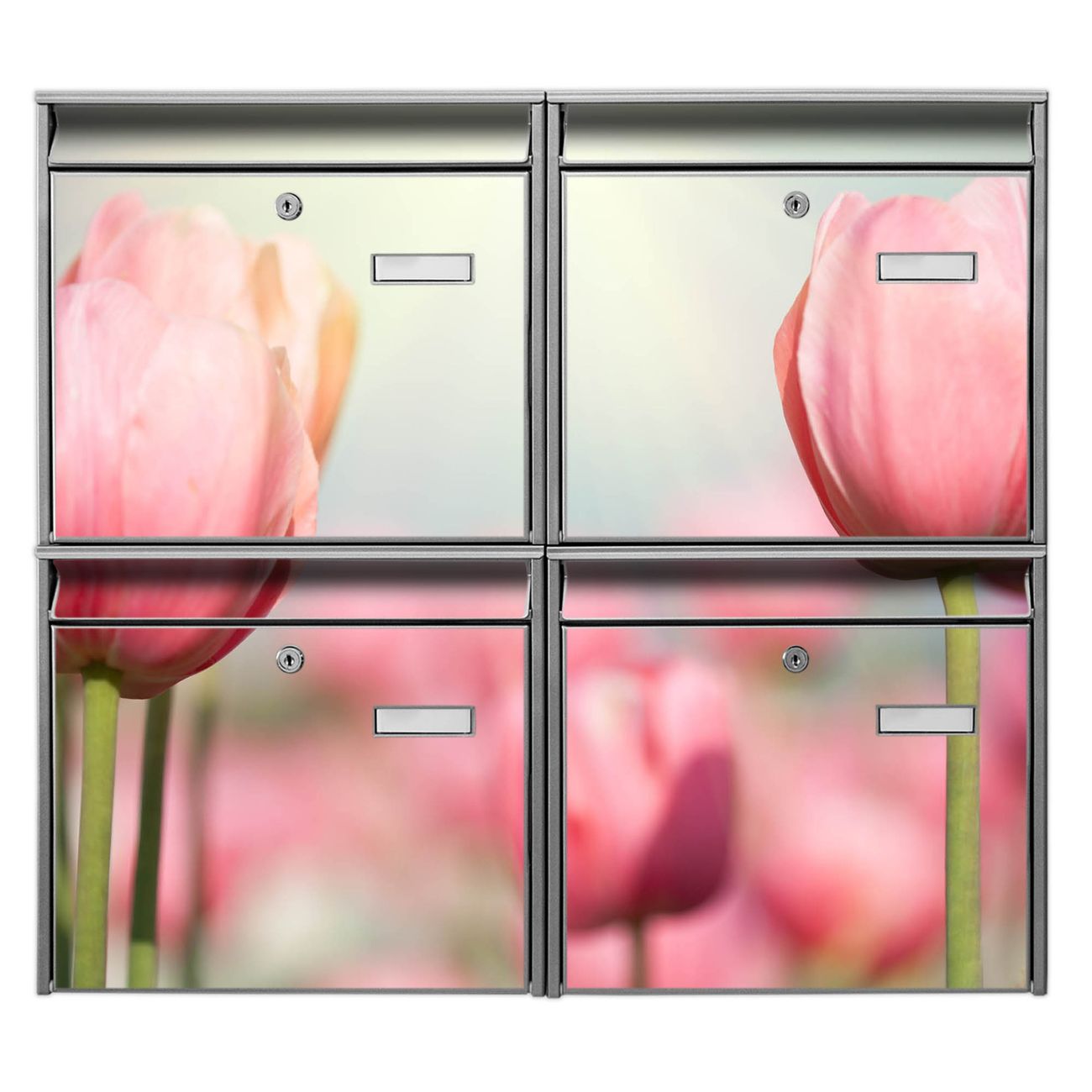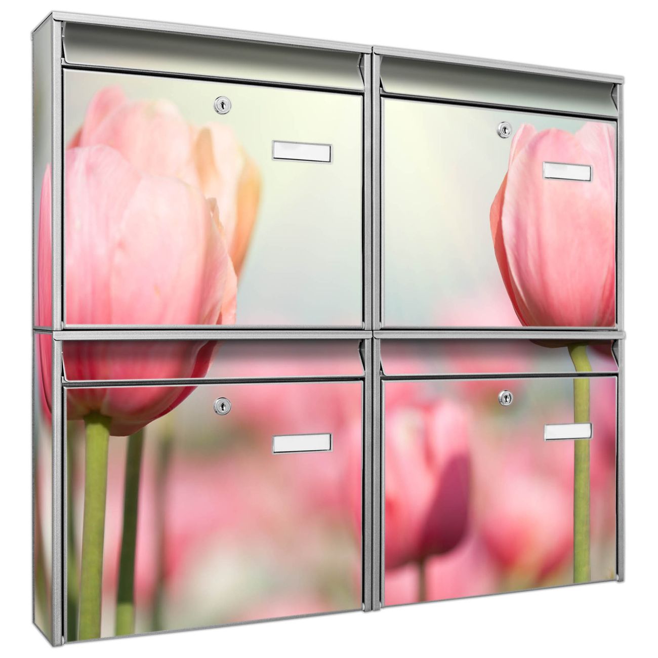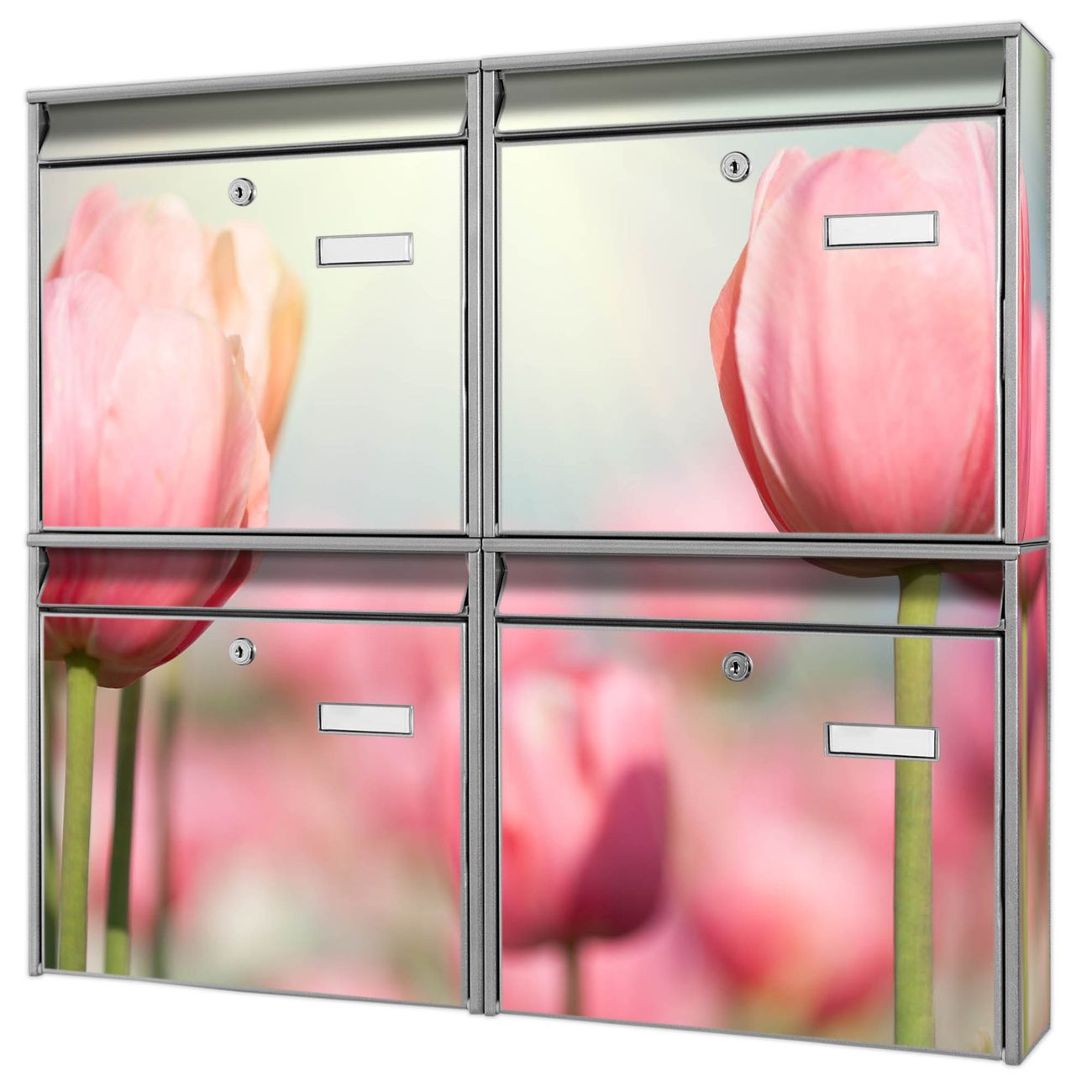 FUNKTION: Die Burg-Wächter Briefkastenanlage mit Motiv Tulpen bietet Ihnen ausreichend Fassungsvermögen um auch A4 und C4 Sendungen zu empfangen. Das integrierte Namensschild lässt sich individuell beschriften. Wählen Sie aus den Grundfarben weiß, silber und schwarz. DESIGN: Die 4 Briefkästen haben ein ansprechendes und zeitloses Design, ohne dabei auf Funktionalität zu verzichten. Das Material ist sehr stabil, wetterfest und rostfrei. Durch das Motiv Tulpen werden die Postkästen zu einem Blickfang. DETAILS: Die Postkästen bestehen aus verzinktem Stahl der zusätzlich mit Klarlack versiegelt wurde. Die Kästen sind gesamt 64,5cm hoch, 72,5cm breit und 10cm tief. Das Motiv besteht aus einer wetter- und UV-festen Folie, die Ihren Briefkasten zusätzlich vor Kratzern schützt. Die Postkästen werden mit Montagematerial, je einem Namensschild und je zwei Schlüsseln geliefert. NUTZEN: Das Briefkastenset eignet sich für die Wandmontage, die Größe bietet genügend Platz für Sendungen aller Art. Das zeitlose Design sowie die stabile Bauart bieten Ihnen einen treuen Begleiter für Ihre Post. BANJADO: