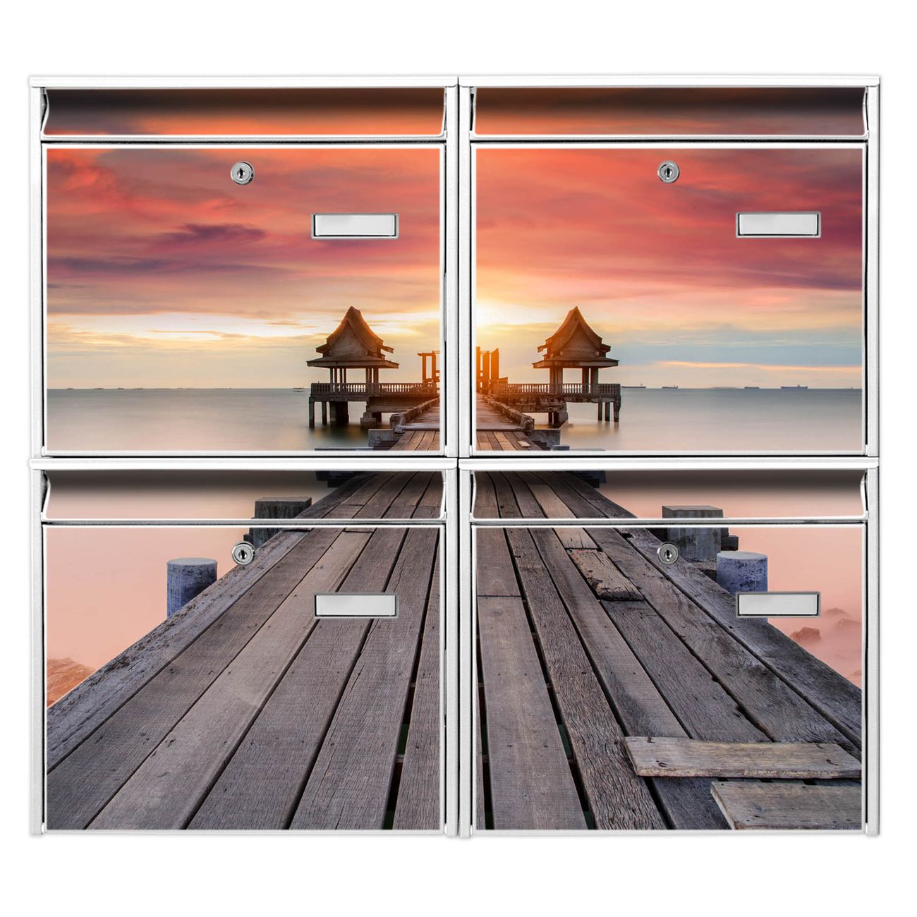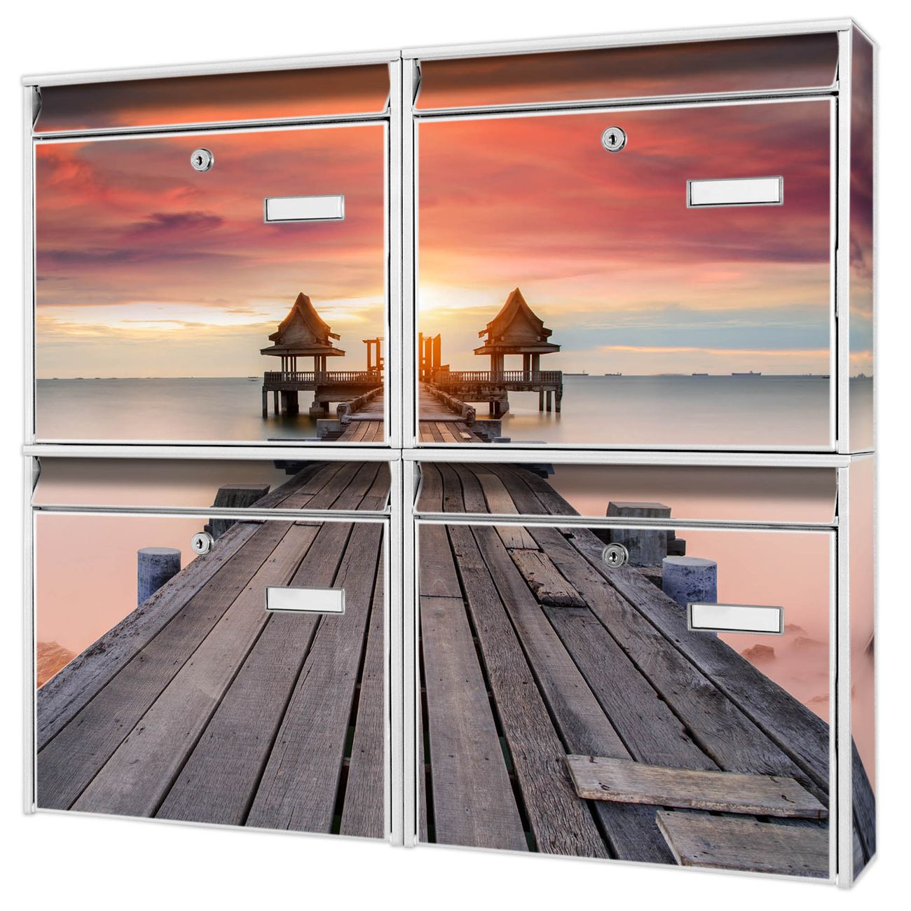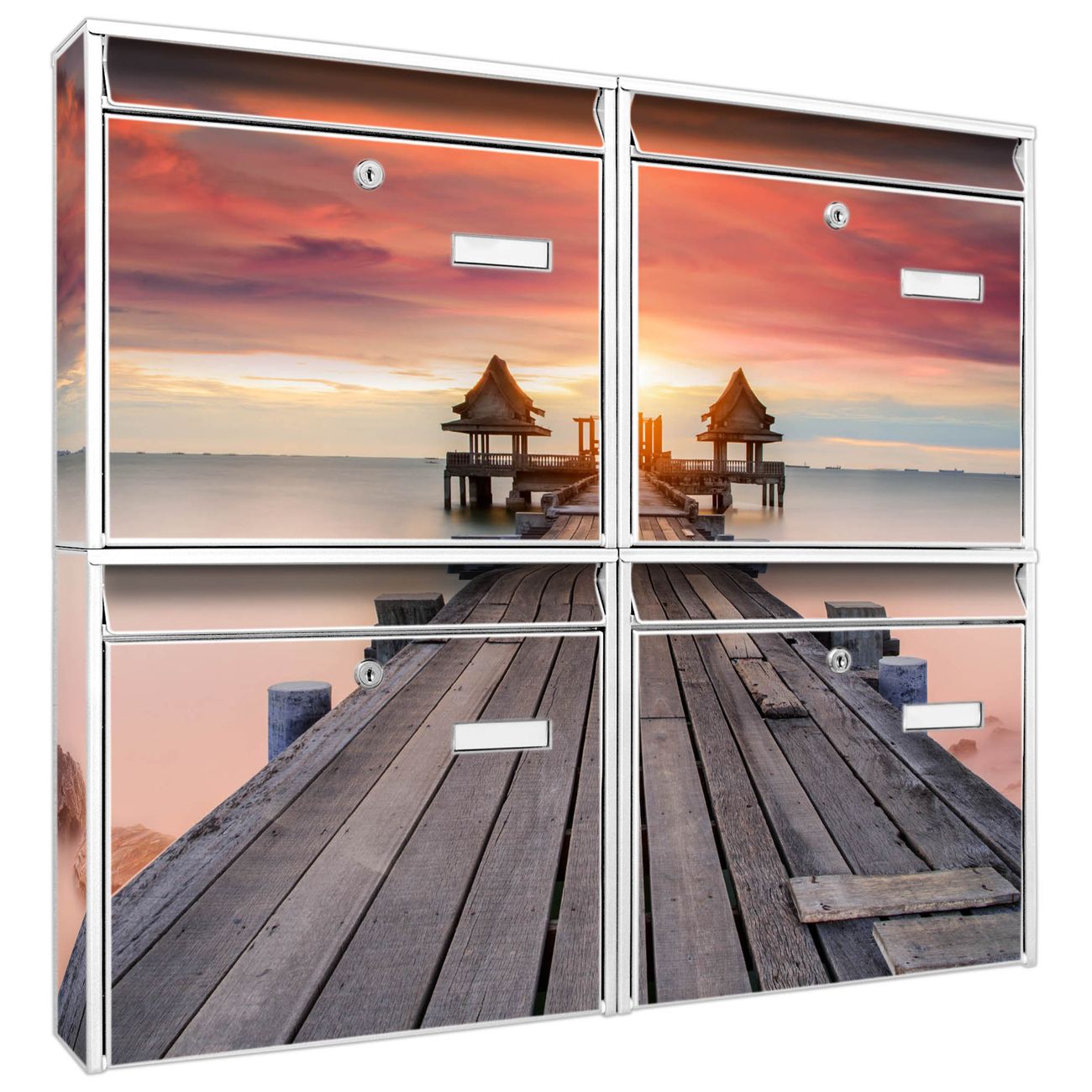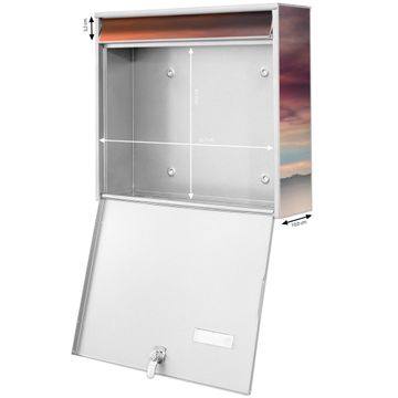 FUNKTION: Die Burg-Wächter Briefkastenanlage mit Motiv Überm Nebelmeer bietet Ihnen ausreichend Fassungsvermögen um auch A4 und C4 Sendungen zu empfangen. Das integrierte Namensschild lässt sich individuell beschriften. Wählen Sie aus den Grundfarben weiß, silber und schwarz. DESIGN: Die 4 Briefkästen haben ein ansprechendes und zeitloses Design, ohne dabei auf Funktionalität zu verzichten. Das Material ist sehr stabil, wetterfest und rostfrei. Durch das Motiv Überm Nebelmeer werden die Postkästen zu einem Blickfang. DETAILS: Die Postkästen bestehen aus verzinktem Stahl der zusätzlich mit Klarlack versiegelt wurde. Die Kästen sind gesamt 64,5cm hoch, 72,5cm breit und 10cm tief. Das Motiv besteht aus einer wetter- und UV-festen Folie, die Ihren Briefkasten zusätzlich vor Kratzern schützt. Die Postkästen werden mit Montagematerial, je einem Namensschild und je zwei Schlüsseln geliefert. NUTZEN: Das Briefkastenset eignet sich für die Wandmontage, die Größe bietet genügend Platz für Sendungen aller Art. Das zeitlose Design sowie die stabile Bauart bieten Ihnen einen treuen Begleiter für Ihre Post. BANJADO: