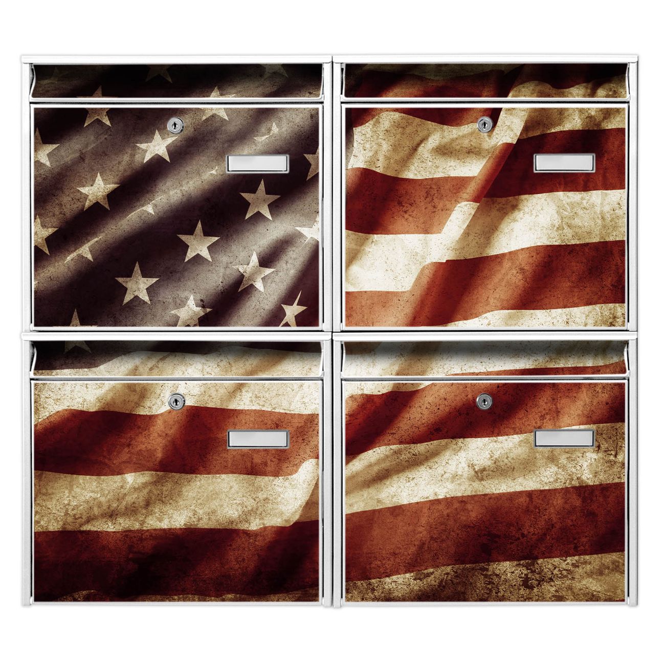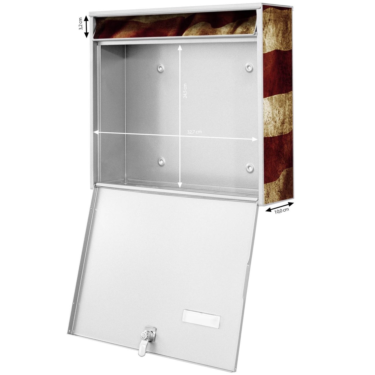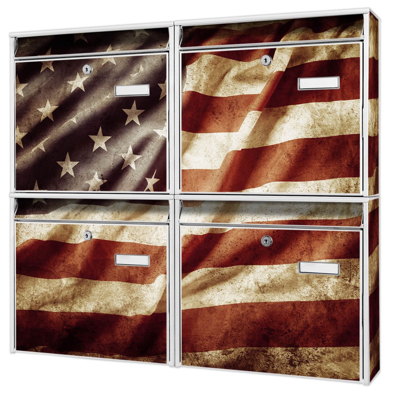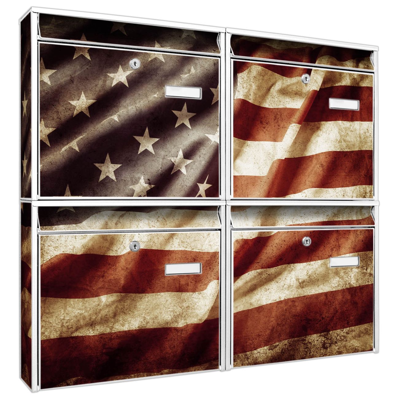 FUNKTION: Die Burg-Wächter Briefkastenanlage mit Motiv United States bietet Ihnen ausreichend Fassungsvermögen um auch A4 und C4 Sendungen zu empfangen. Das integrierte Namensschild lässt sich individuell beschriften. Wählen Sie aus den Grundfarben weiß, silber und schwarz. DESIGN: Die 4 Briefkästen haben ein ansprechendes und zeitloses Design, ohne dabei auf Funktionalität zu verzichten. Das Material ist sehr stabil, wetterfest und rostfrei. Durch das Motiv United States werden die Postkästen zu einem Blickfang. DETAILS: Die Postkästen bestehen aus verzinktem Stahl der zusätzlich mit Klarlack versiegelt wurde. Die Kästen sind gesamt 64,5cm hoch, 72,5cm breit und 10cm tief. Das Motiv besteht aus einer wetter- und UV-festen Folie, die Ihren Briefkasten zusätzlich vor Kratzern schützt. Die Postkästen werden mit Montagematerial, je einem Namensschild und je zwei Schlüsseln geliefert. NUTZEN: Das Briefkastenset eignet sich für die Wandmontage, die Größe bietet genügend Platz für Sendungen aller Art. Das zeitlose Design sowie die stabile Bauart bieten Ihnen einen treuen Begleiter für Ihre Post. BANJADO:
