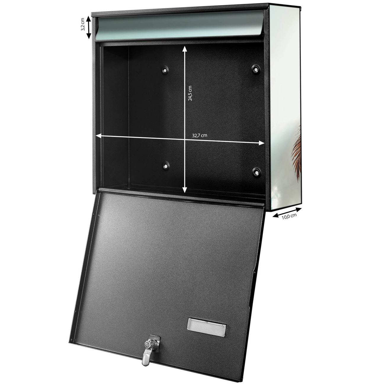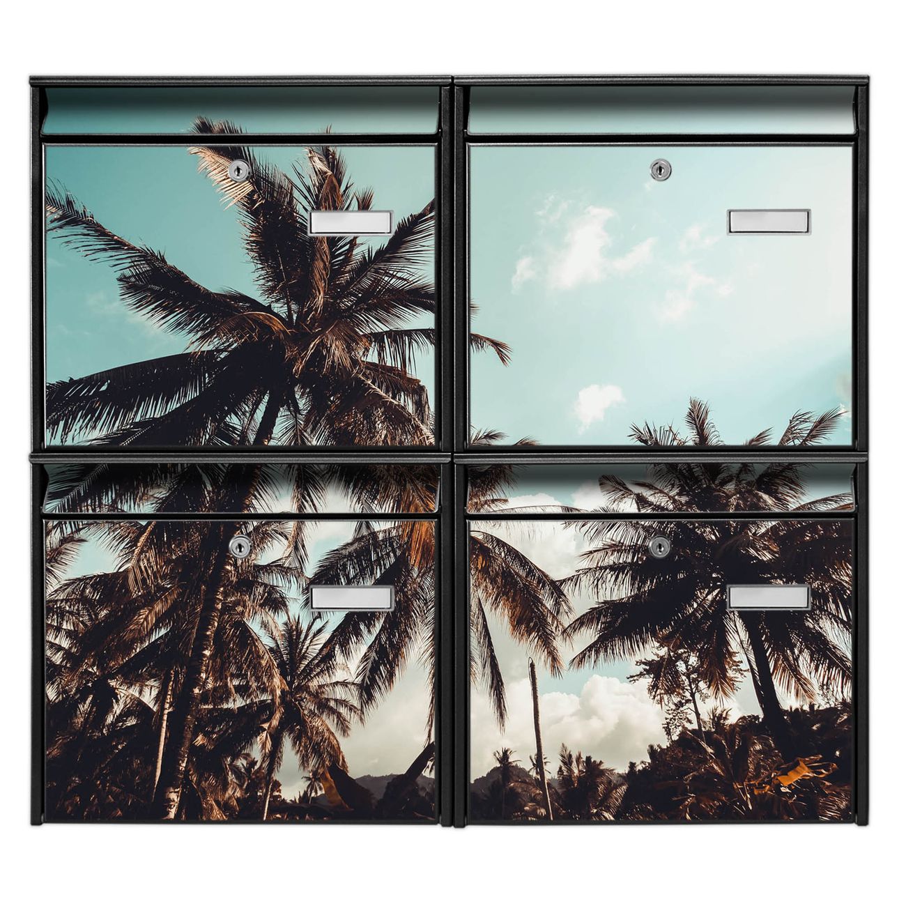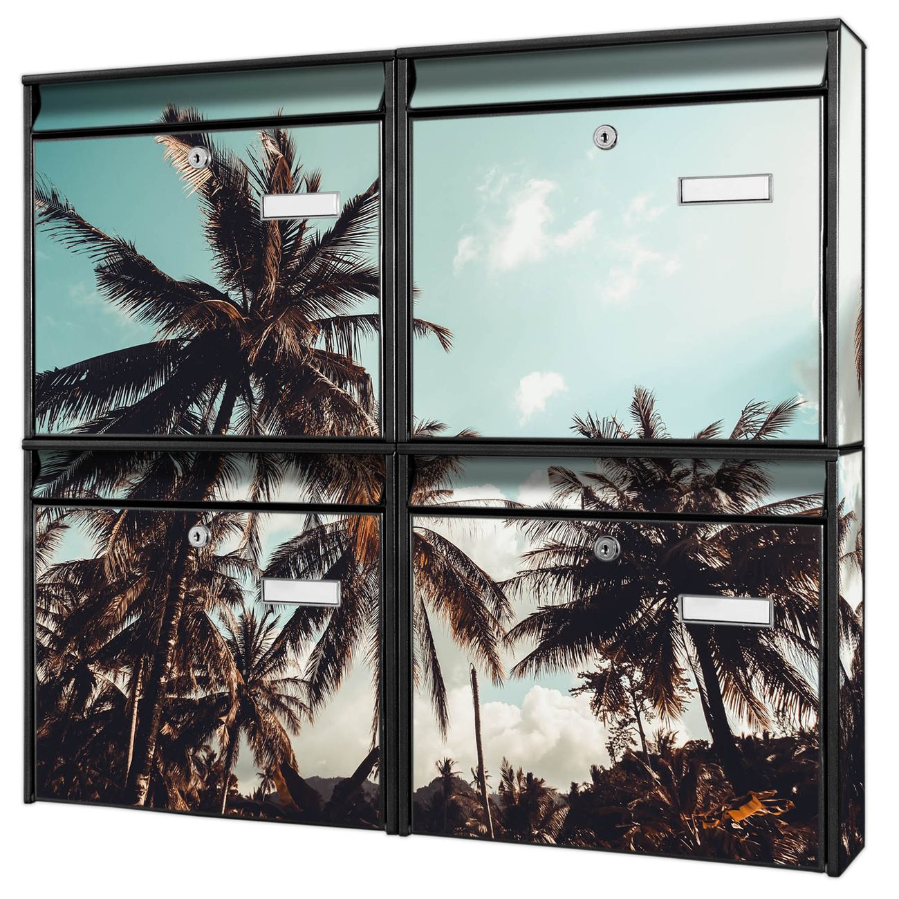 FUNKTION: Die Burg-Wächter Briefkastenanlage mit Motiv Unter Palmen bietet Ihnen ausreichend Fassungsvermögen um auch A4 und C4 Sendungen zu empfangen. Das integrierte Namensschild lässt sich individuell beschriften. Wählen Sie aus den Grundfarben weiß, silber und schwarz. DESIGN: Die 4 Briefkästen haben ein ansprechendes und zeitloses Design, ohne dabei auf Funktionalität zu verzichten. Das Material ist sehr stabil, wetterfest und rostfrei. Durch das Motiv Unter Palmen werden die Postkästen zu einem Blickfang. DETAILS: Die Postkästen bestehen aus verzinktem Stahl der zusätzlich mit Klarlack versiegelt wurde. Die Kästen sind gesamt 64,5cm hoch, 72,5cm breit und 10cm tief. Das Motiv besteht aus einer wetter- und UV-festen Folie, die Ihren Briefkasten zusätzlich vor Kratzern schützt. Die Postkästen werden mit Montagematerial, je einem Namensschild und je zwei Schlüsseln geliefert. NUTZEN: Das Briefkastenset eignet sich für die Wandmontage, die Größe bietet genügend Platz für Sendungen aller Art. Das zeitlose Design sowie die stabile Bauart bieten Ihnen einen treuen Begleiter für Ihre Post. BANJADO: