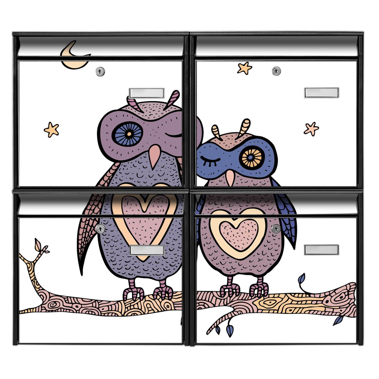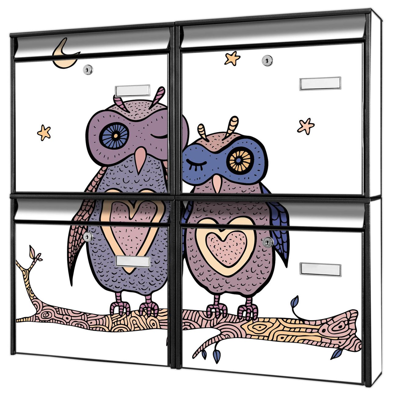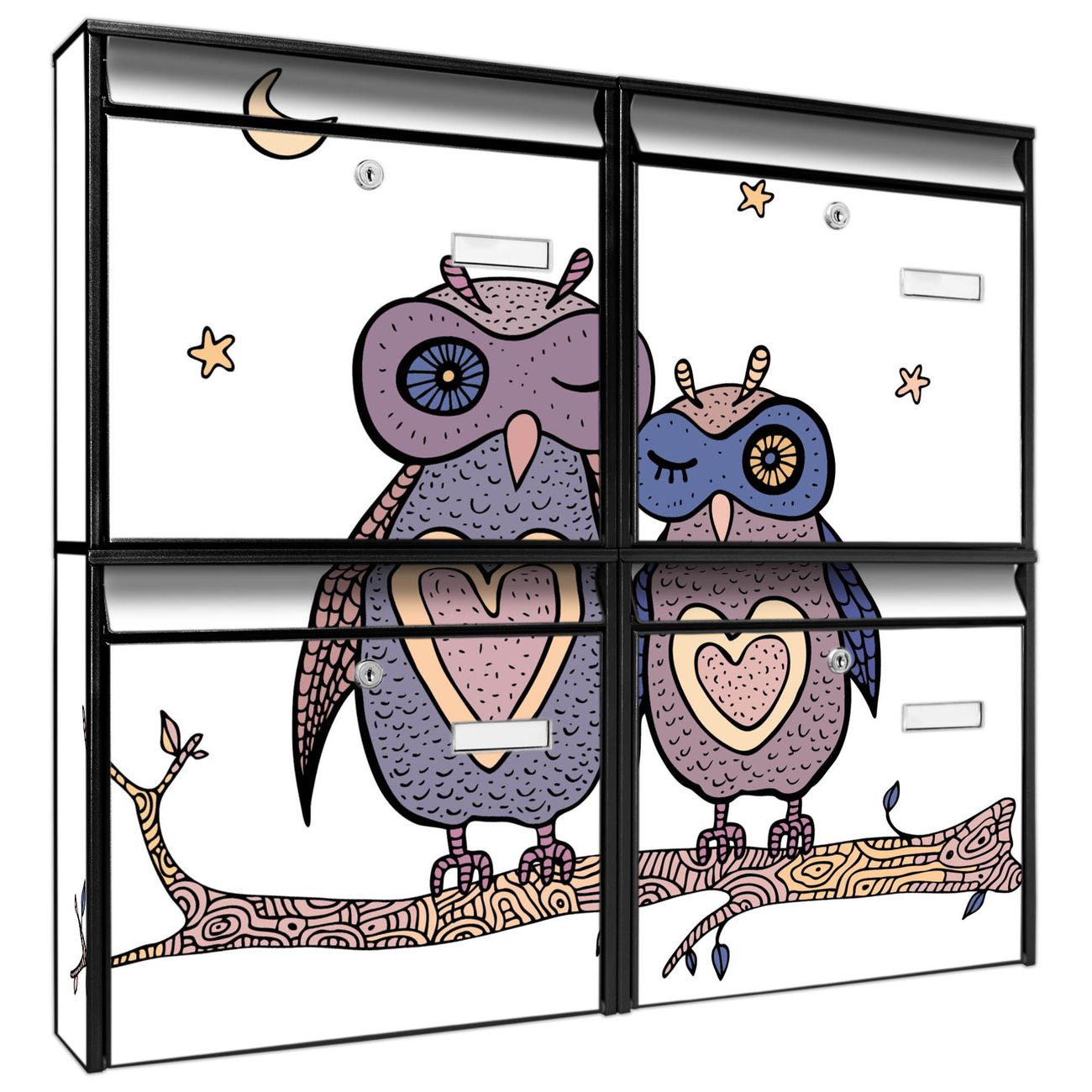 FUNKTION: Die Burg-Wächter Briefkastenanlage mit Motiv Verliebte Eulen bietet Ihnen ausreichend Fassungsvermögen um auch A4 und C4 Sendungen zu empfangen. Das integrierte Namensschild lässt sich individuell beschriften. Wählen Sie aus den Grundfarben weiß, silber und schwarz. DESIGN: Die 4 Briefkästen haben ein ansprechendes und zeitloses Design, ohne dabei auf Funktionalität zu verzichten. Das Material ist sehr stabil, wetterfest und rostfrei. Durch das Motiv Verliebte Eulen werden die Postkästen zu einem Blickfang. DETAILS: Die Postkästen bestehen aus verzinktem Stahl der zusätzlich mit Klarlack versiegelt wurde. Die Kästen sind gesamt 64,5cm hoch, 72,5cm breit und 10cm tief. Das Motiv besteht aus einer wetter- und UV-festen Folie, die Ihren Briefkasten zusätzlich vor Kratzern schützt. Die Postkästen werden mit Montagematerial, je einem Namensschild und je zwei Schlüsseln geliefert. NUTZEN: Das Briefkastenset eignet sich für die Wandmontage, die Größe bietet genügend Platz für Sendungen aller Art. Das zeitlose Design sowie die stabile Bauart bieten Ihnen einen treuen Begleiter für Ihre Post. BANJADO: