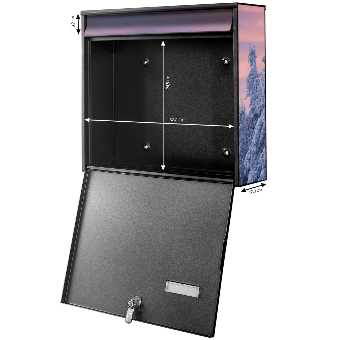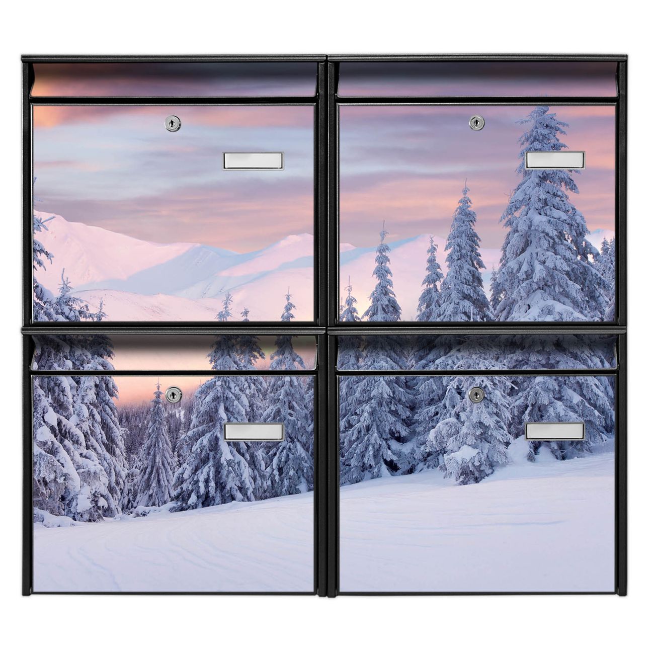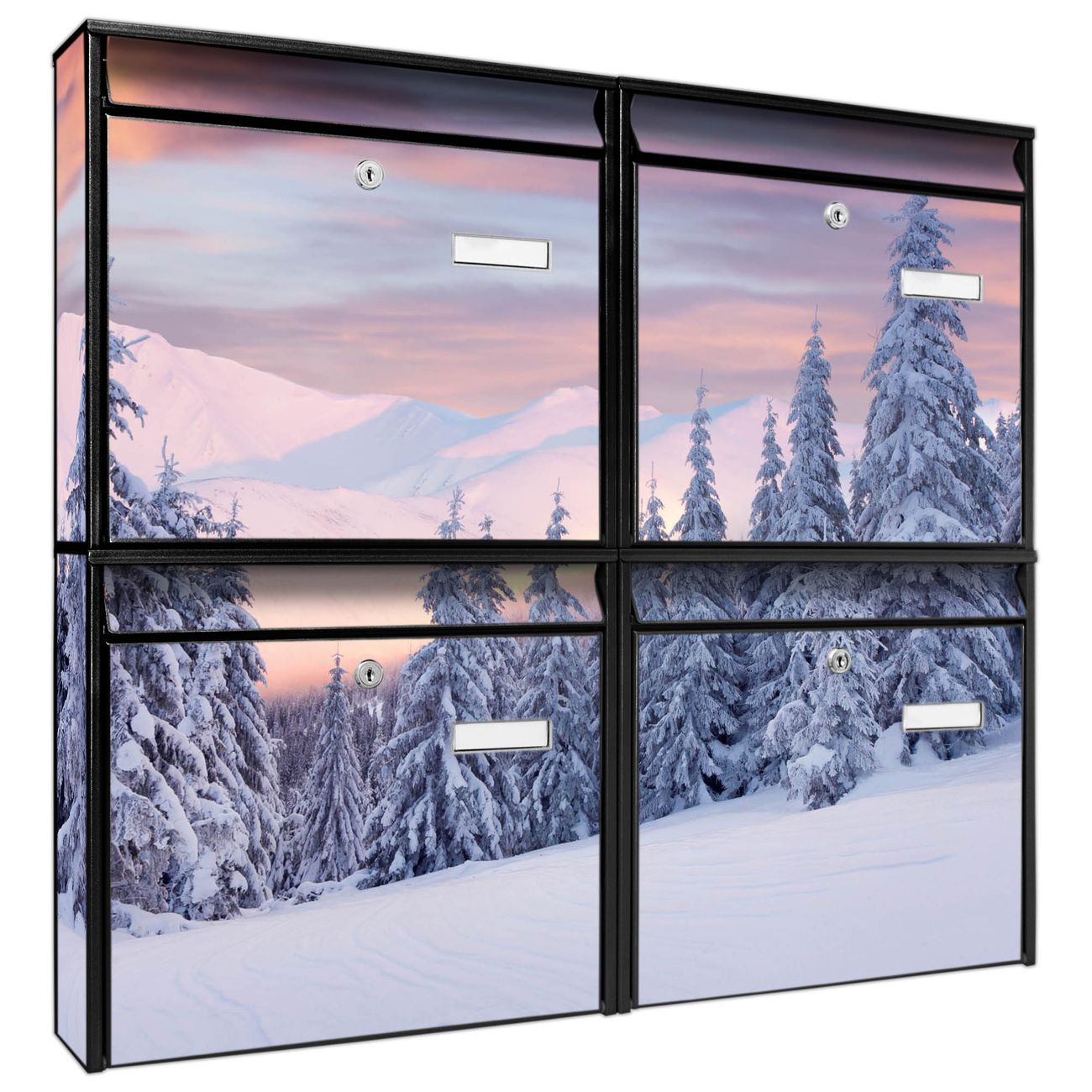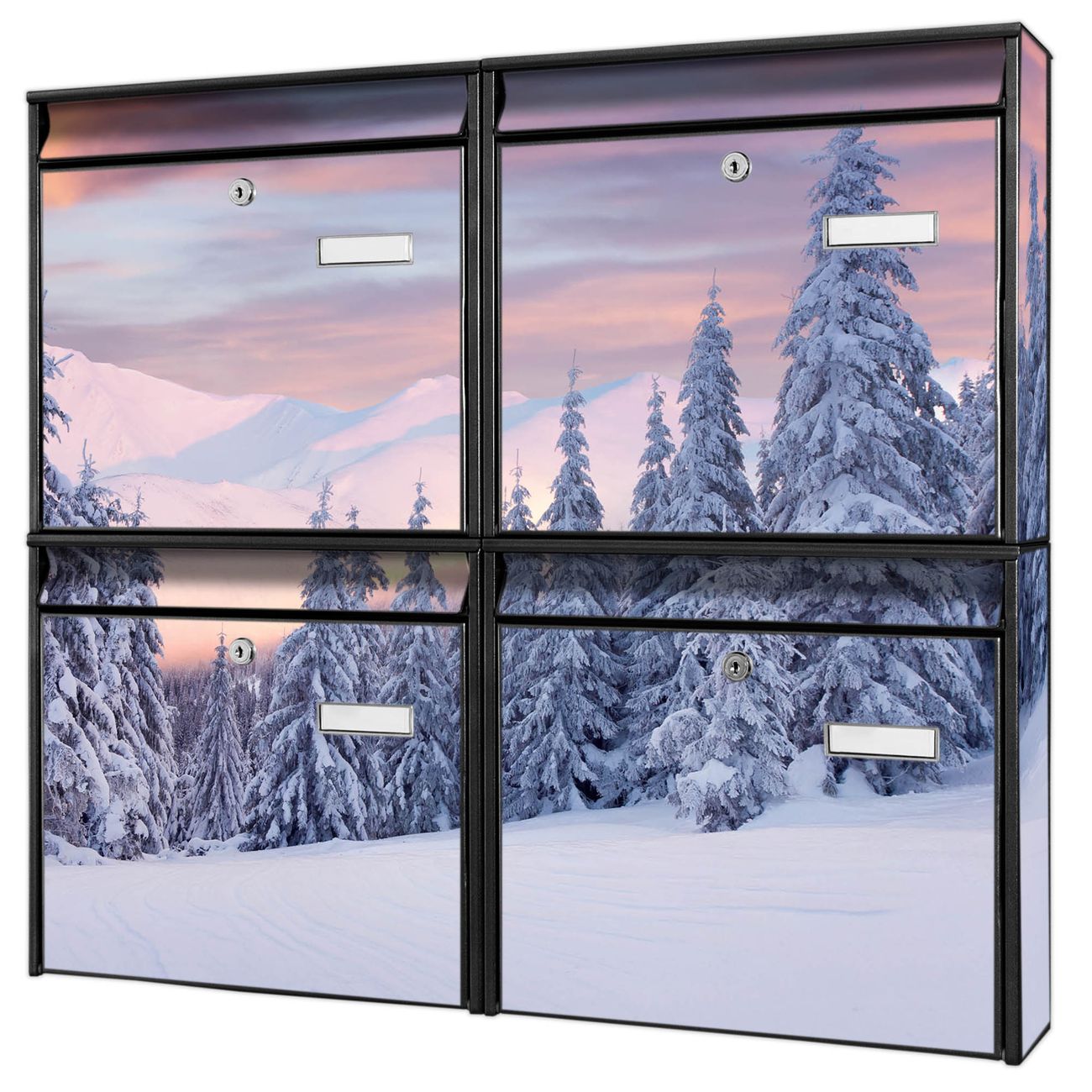 FUNKTION: Die Burg-Wächter Briefkastenanlage mit Motiv Verschneite Berge bietet Ihnen ausreichend Fassungsvermögen um auch A4 und C4 Sendungen zu empfangen. Das integrierte Namensschild lässt sich individuell beschriften. Wählen Sie aus den Grundfarben weiß, silber und schwarz. DESIGN: Die 4 Briefkästen haben ein ansprechendes und zeitloses Design, ohne dabei auf Funktionalität zu verzichten. Das Material ist sehr stabil, wetterfest und rostfrei. Durch das Motiv Verschneite Berge werden die Postkästen zu einem Blickfang. DETAILS: Die Postkästen bestehen aus verzinktem Stahl der zusätzlich mit Klarlack versiegelt wurde. Die Kästen sind gesamt 64,5cm hoch, 72,5cm breit und 10cm tief. Das Motiv besteht aus einer wetter- und UV-festen Folie, die Ihren Briefkasten zusätzlich vor Kratzern schützt. Die Postkästen werden mit Montagematerial, je einem Namensschild und je zwei Schlüsseln geliefert. NUTZEN: Das Briefkastenset eignet sich für die Wandmontage, die Größe bietet genügend Platz für Sendungen aller Art. Das zeitlose Design sowie die stabile Bauart bieten Ihnen einen treuen Begleiter für Ihre Post. BANJADO: