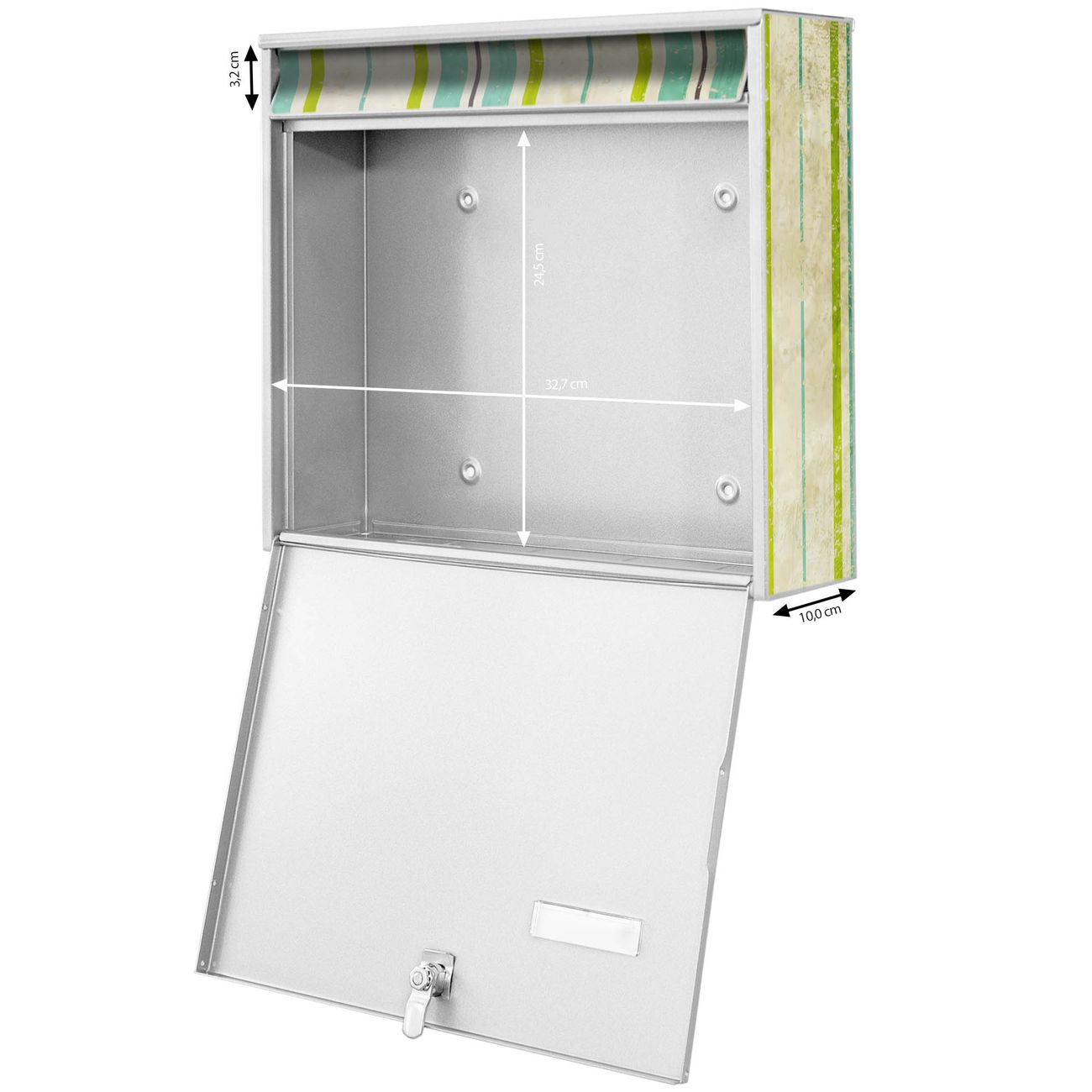 FUNKTION: Die Burg-Wächter Briefkastenanlage mit Motiv Vintage Streifenmuster bietet Ihnen ausreichend Fassungsvermögen um auch A4 und C4 Sendungen zu empfangen. Das integrierte Namensschild lässt sich individuell beschriften. Wählen Sie aus den Grundfarben weiß, silber und schwarz. DESIGN: Die 4 Briefkästen haben ein ansprechendes und zeitloses Design, ohne dabei auf Funktionalität zu verzichten. Das Material ist sehr stabil, wetterfest und rostfrei. Durch das Motiv Vintage Streifenmuster werden die Postkästen zu einem Blickfang. DETAILS: Die Postkästen bestehen aus verzinktem Stahl der zusätzlich mit Klarlack versiegelt wurde. Die Kästen sind gesamt 64,5cm hoch, 72,5cm breit und 10cm tief. Das Motiv besteht aus einer wetter- und UV-festen Folie, die Ihren Briefkasten zusätzlich vor Kratzern schützt. Die Postkästen werden mit Montagematerial, je einem Namensschild und je zwei Schlüsseln geliefert. NUTZEN: Das Briefkastenset eignet sich für die Wandmontage, die Größe bietet genügend Platz für Sendungen aller Art. Das zeitlose Design sowie die stabile Bauart bieten Ihnen einen treuen Begleiter für Ihre Post. BANJADO: