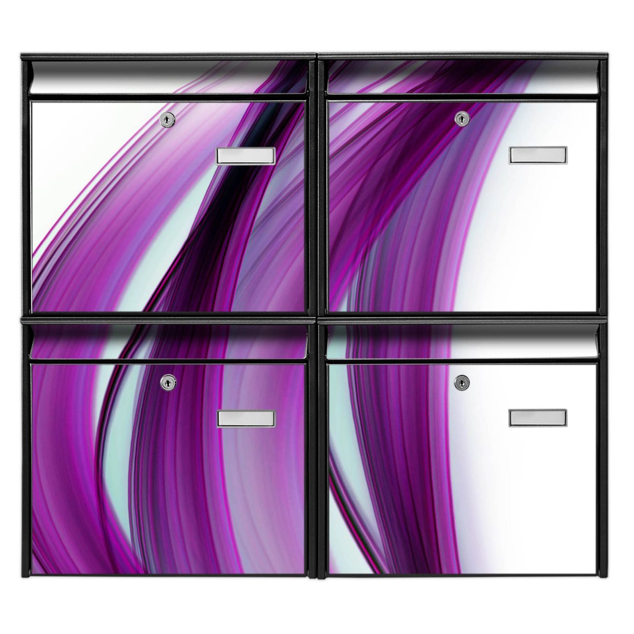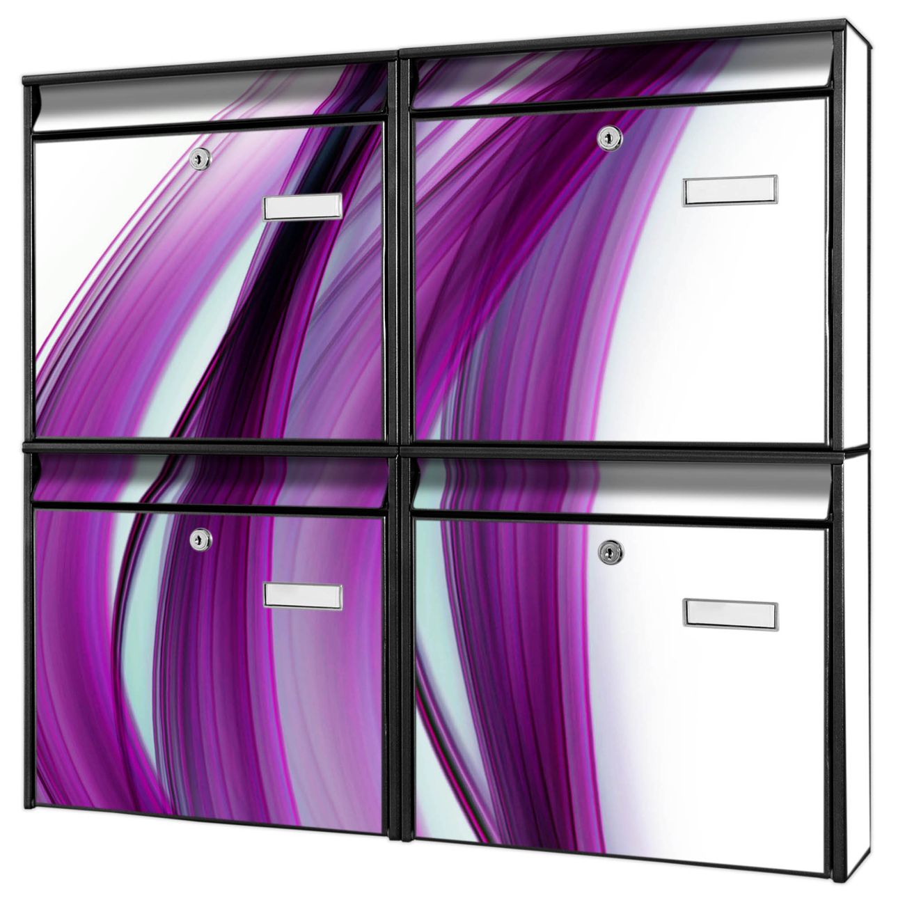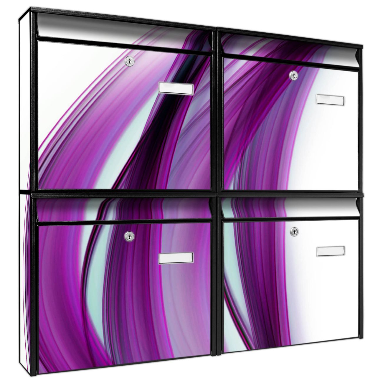 FUNKTION: Die Burg-Wächter Briefkastenanlage mit Motiv Violet Element bietet Ihnen ausreichend Fassungsvermögen um auch A4 und C4 Sendungen zu empfangen. Das integrierte Namensschild lässt sich individuell beschriften. Wählen Sie aus den Grundfarben weiß, silber und schwarz. DESIGN: Die 4 Briefkästen haben ein ansprechendes und zeitloses Design, ohne dabei auf Funktionalität zu verzichten. Das Material ist sehr stabil, wetterfest und rostfrei. Durch das Motiv Violet Element werden die Postkästen zu einem Blickfang. DETAILS: Die Postkästen bestehen aus verzinktem Stahl der zusätzlich mit Klarlack versiegelt wurde. Die Kästen sind gesamt 64,5cm hoch, 72,5cm breit und 10cm tief. Das Motiv besteht aus einer wetter- und UV-festen Folie, die Ihren Briefkasten zusätzlich vor Kratzern schützt. Die Postkästen werden mit Montagematerial, je einem Namensschild und je zwei Schlüsseln geliefert. NUTZEN: Das Briefkastenset eignet sich für die Wandmontage, die Größe bietet genügend Platz für Sendungen aller Art. Das zeitlose Design sowie die stabile Bauart bieten Ihnen einen treuen Begleiter für Ihre Post. BANJADO: