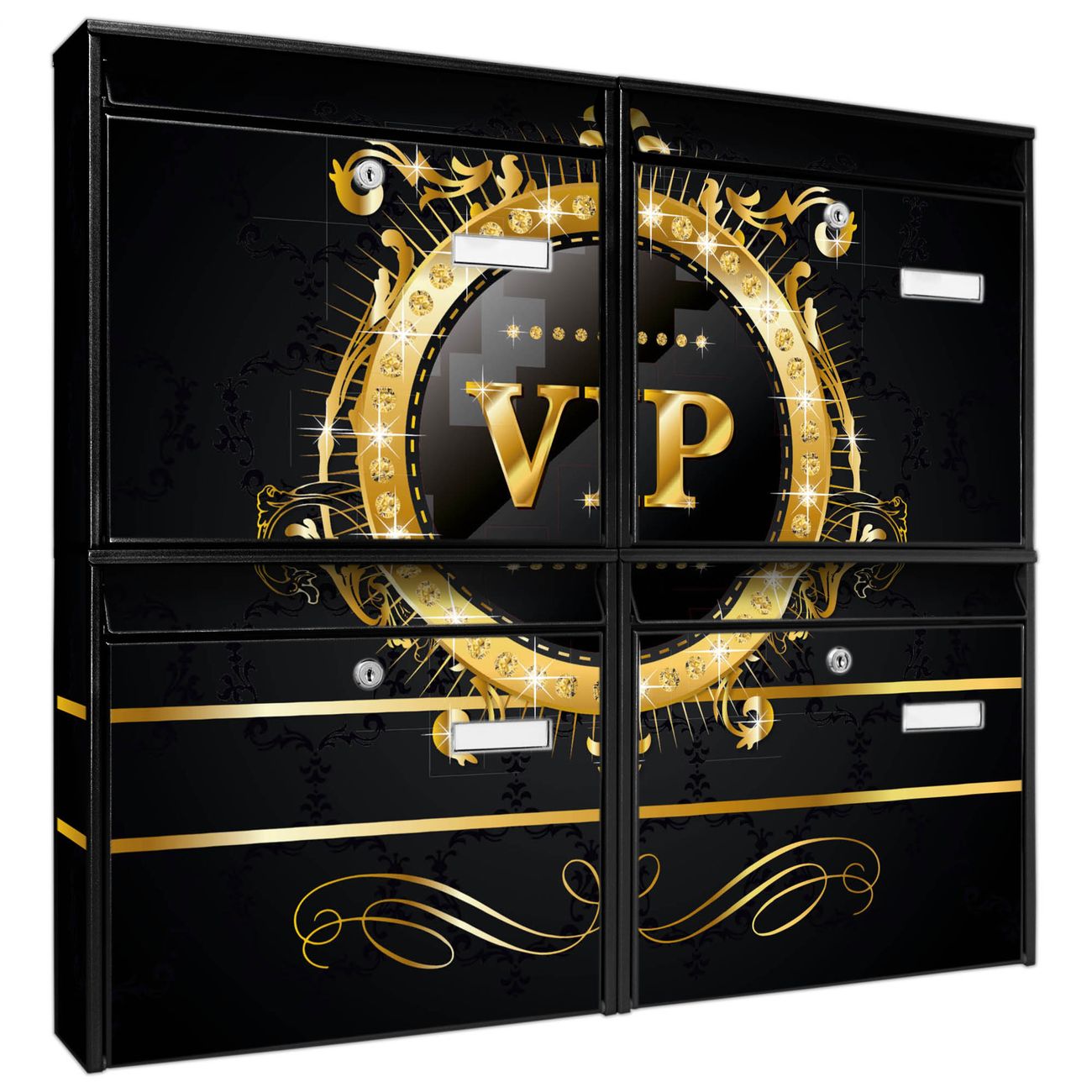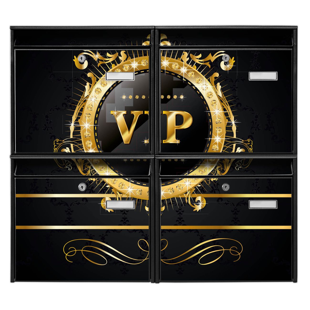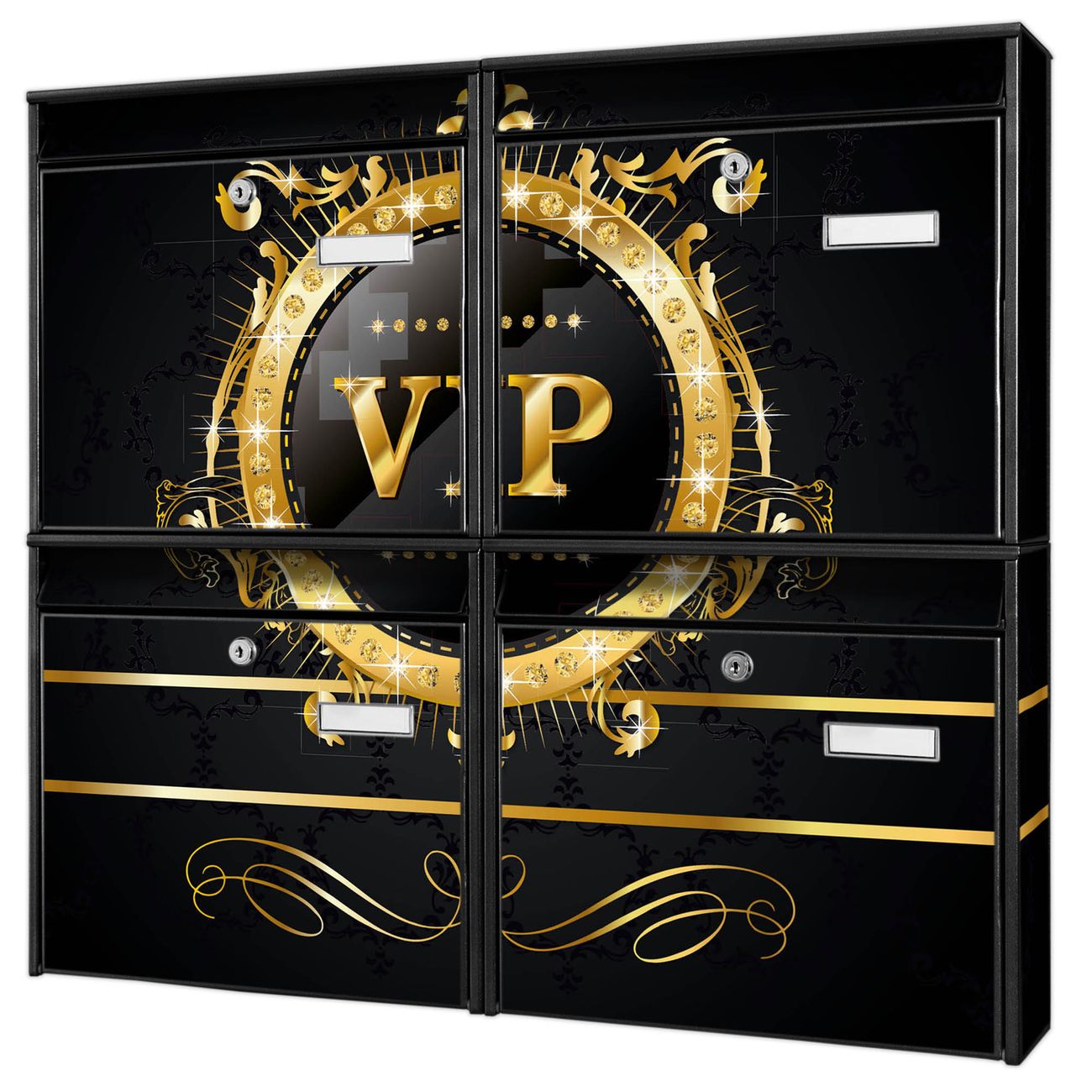 FUNKTION: Die Burg-Wächter Briefkastenanlage mit Motiv VIP bietet Ihnen ausreichend Fassungsvermögen um auch A4 und C4 Sendungen zu empfangen. Das integrierte Namensschild lässt sich individuell beschriften. Wählen Sie aus den Grundfarben weiß, silber und schwarz. DESIGN: Die 4 Briefkästen haben ein ansprechendes und zeitloses Design, ohne dabei auf Funktionalität zu verzichten. Das Material ist sehr stabil, wetterfest und rostfrei. Durch das Motiv VIP werden die Postkästen zu einem Blickfang. DETAILS: Die Postkästen bestehen aus verzinktem Stahl der zusätzlich mit Klarlack versiegelt wurde. Die Kästen sind gesamt 64,5cm hoch, 72,5cm breit und 10cm tief. Das Motiv besteht aus einer wetter- und UV-festen Folie, die Ihren Briefkasten zusätzlich vor Kratzern schützt. Die Postkästen werden mit Montagematerial, je einem Namensschild und je zwei Schlüsseln geliefert. NUTZEN: Das Briefkastenset eignet sich für die Wandmontage, die Größe bietet genügend Platz für Sendungen aller Art. Das zeitlose Design sowie die stabile Bauart bieten Ihnen einen treuen Begleiter für Ihre Post. BANJADO: