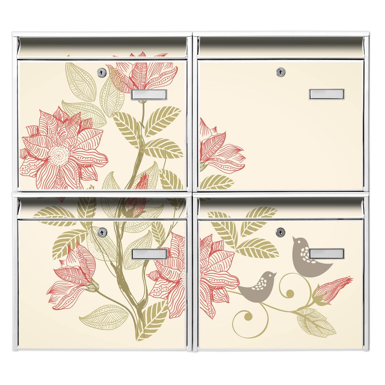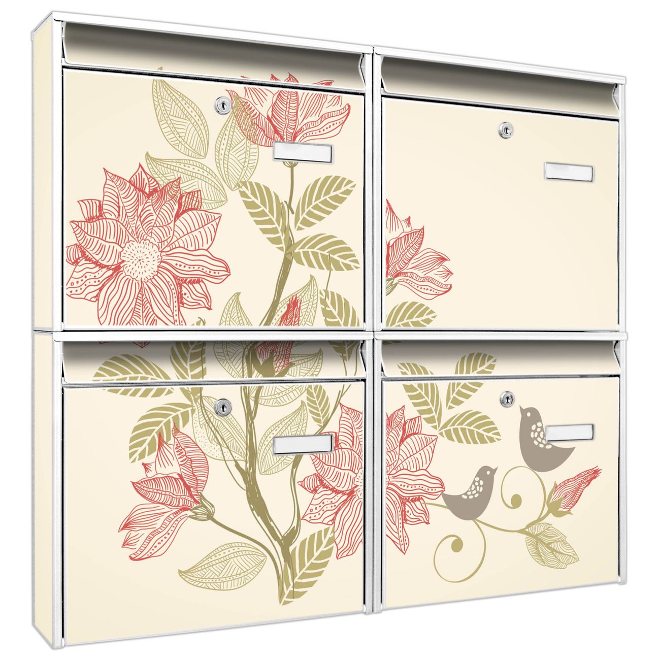 FUNKTION: Die Burg-Wächter Briefkastenanlage mit Motiv Vogelpaar bietet Ihnen ausreichend Fassungsvermögen um auch A4 und C4 Sendungen zu empfangen. Das integrierte Namensschild lässt sich individuell beschriften. Wählen Sie aus den Grundfarben weiß, silber und schwarz. DESIGN: Die 4 Briefkästen haben ein ansprechendes und zeitloses Design, ohne dabei auf Funktionalität zu verzichten. Das Material ist sehr stabil, wetterfest und rostfrei. Durch das Motiv Vogelpaar werden die Postkästen zu einem Blickfang. DETAILS: Die Postkästen bestehen aus verzinktem Stahl der zusätzlich mit Klarlack versiegelt wurde. Die Kästen sind gesamt 64,5cm hoch, 72,5cm breit und 10cm tief. Das Motiv besteht aus einer wetter- und UV-festen Folie, die Ihren Briefkasten zusätzlich vor Kratzern schützt. Die Postkästen werden mit Montagematerial, je einem Namensschild und je zwei Schlüsseln geliefert. NUTZEN: Das Briefkastenset eignet sich für die Wandmontage, die Größe bietet genügend Platz für Sendungen aller Art. Das zeitlose Design sowie die stabile Bauart bieten Ihnen einen treuen Begleiter für Ihre Post. BANJADO: