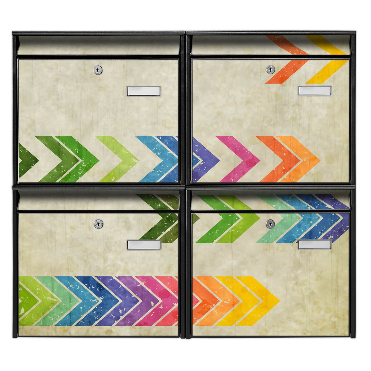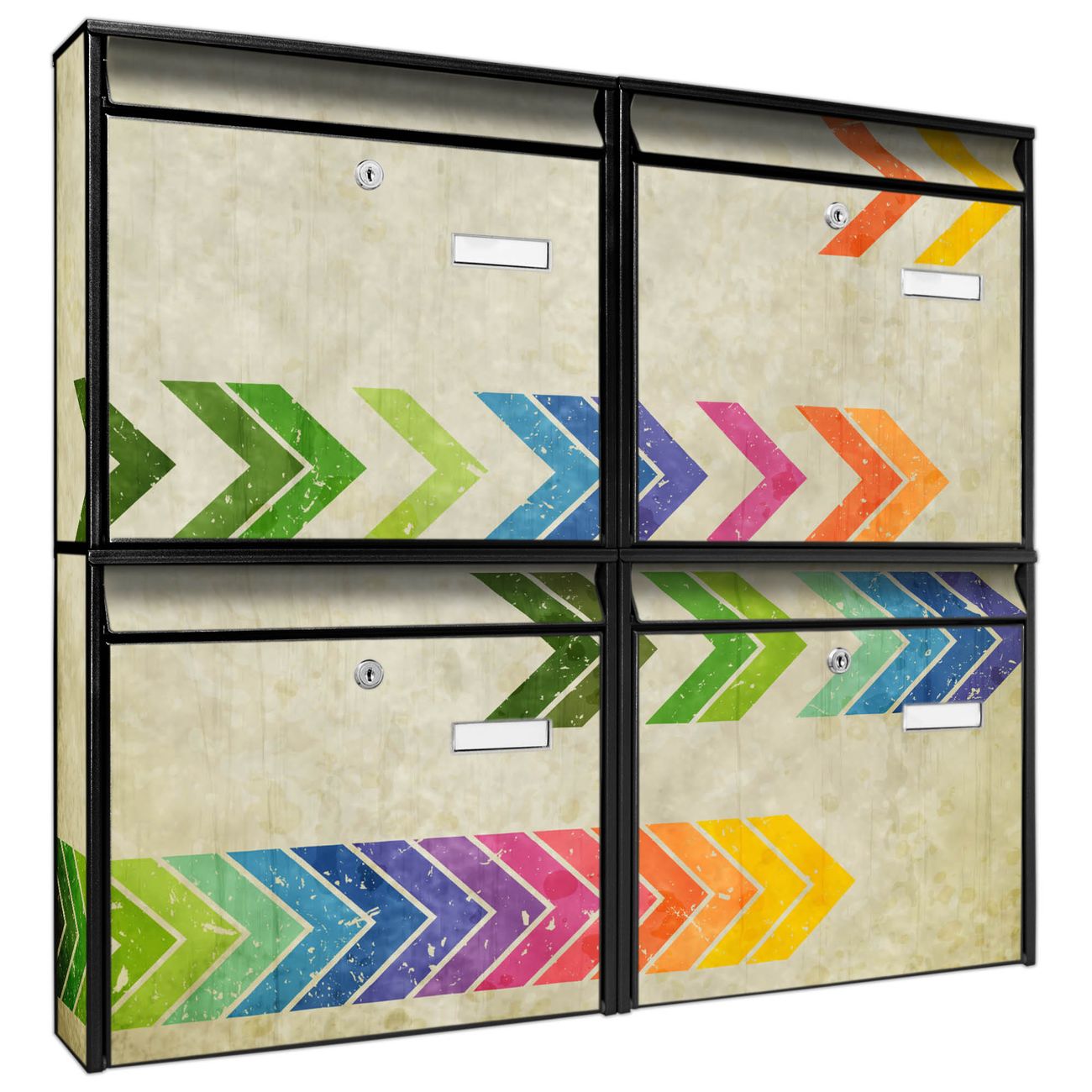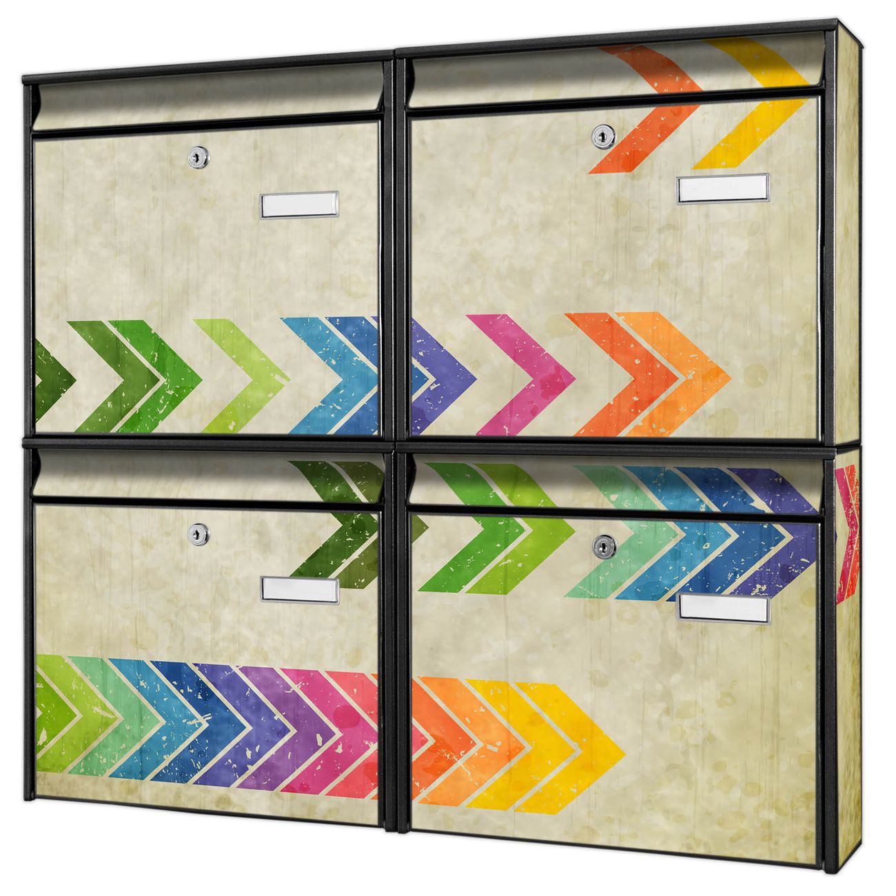 FUNKTION: Die Burg-Wächter Briefkastenanlage mit Motiv Vorspulen bietet Ihnen ausreichend Fassungsvermögen um auch A4 und C4 Sendungen zu empfangen. Das integrierte Namensschild lässt sich individuell beschriften. Wählen Sie aus den Grundfarben weiß, silber und schwarz. DESIGN: Die 4 Briefkästen haben ein ansprechendes und zeitloses Design, ohne dabei auf Funktionalität zu verzichten. Das Material ist sehr stabil, wetterfest und rostfrei. Durch das Motiv Vorspulen werden die Postkästen zu einem Blickfang. DETAILS: Die Postkästen bestehen aus verzinktem Stahl der zusätzlich mit Klarlack versiegelt wurde. Die Kästen sind gesamt 64,5cm hoch, 72,5cm breit und 10cm tief. Das Motiv besteht aus einer wetter- und UV-festen Folie, die Ihren Briefkasten zusätzlich vor Kratzern schützt. Die Postkästen werden mit Montagematerial, je einem Namensschild und je zwei Schlüsseln geliefert. NUTZEN: Das Briefkastenset eignet sich für die Wandmontage, die Größe bietet genügend Platz für Sendungen aller Art. Das zeitlose Design sowie die stabile Bauart bieten Ihnen einen treuen Begleiter für Ihre Post. BANJADO: