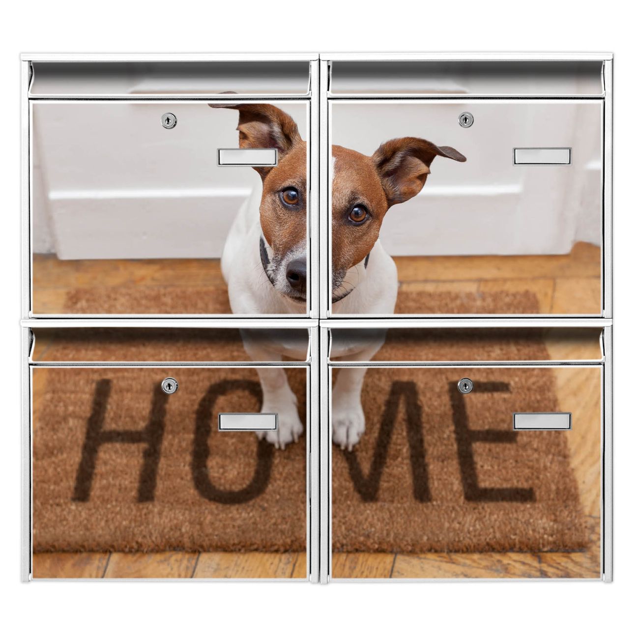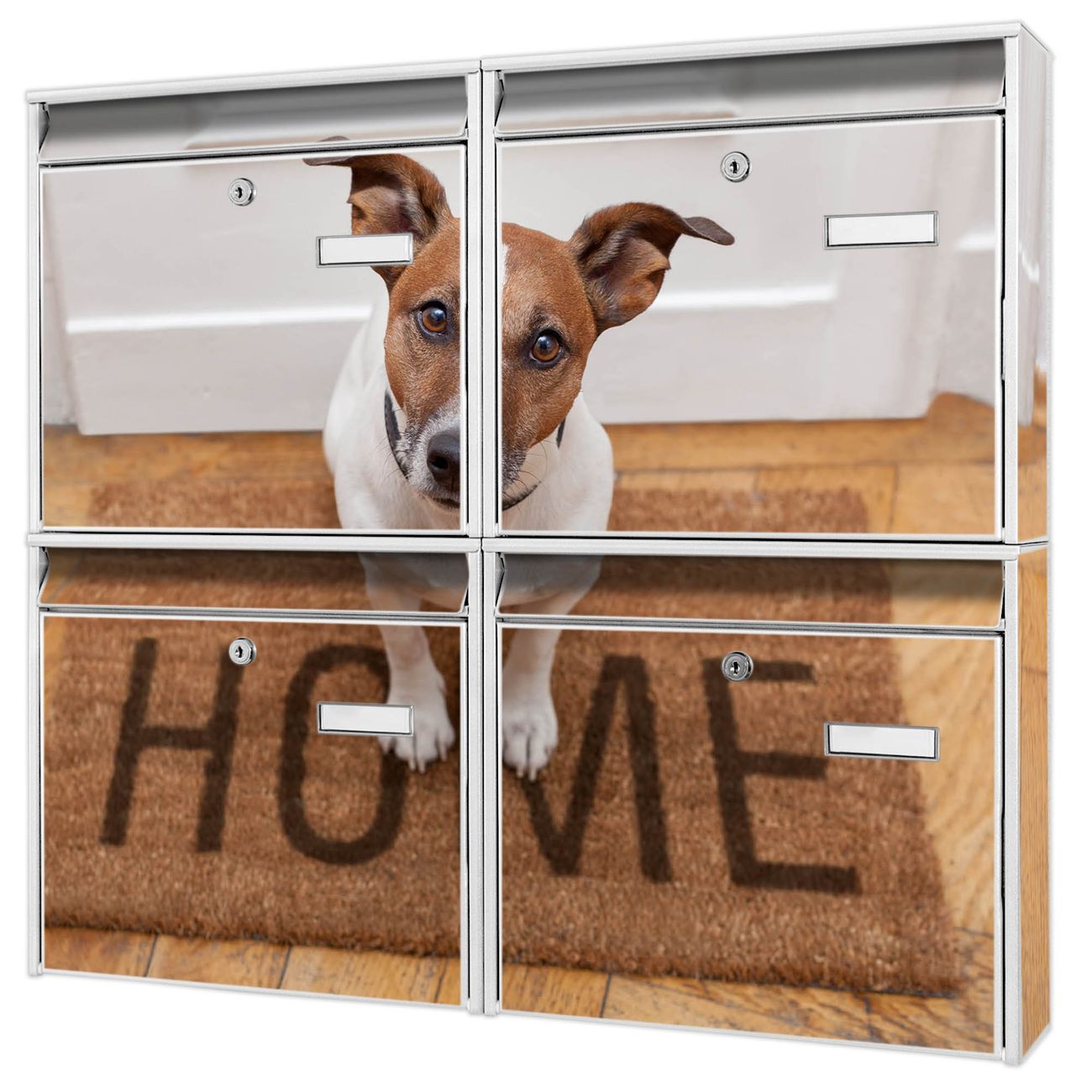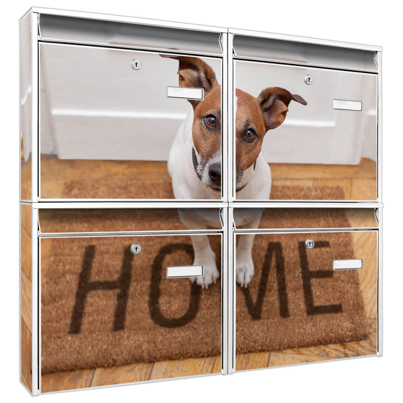 FUNKTION: Die Burg-Wächter Briefkastenanlage mit Motiv Wachhund Jack Russel bietet Ihnen ausreichend Fassungsvermögen um auch A4 und C4 Sendungen zu empfangen. Das integrierte Namensschild lässt sich individuell beschriften. Wählen Sie aus den Grundfarben weiß, silber und schwarz. DESIGN: Die 4 Briefkästen haben ein ansprechendes und zeitloses Design, ohne dabei auf Funktionalität zu verzichten. Das Material ist sehr stabil, wetterfest und rostfrei. Durch das Motiv Wachhund Jack Russel werden die Postkästen zu einem Blickfang. DETAILS: Die Postkästen bestehen aus verzinktem Stahl der zusätzlich mit Klarlack versiegelt wurde. Die Kästen sind gesamt 64,5cm hoch, 72,5cm breit und 10cm tief. Das Motiv besteht aus einer wetter- und UV-festen Folie, die Ihren Briefkasten zusätzlich vor Kratzern schützt. Die Postkästen werden mit Montagematerial, je einem Namensschild und je zwei Schlüsseln geliefert. NUTZEN: Das Briefkastenset eignet sich für die Wandmontage, die Größe bietet genügend Platz für Sendungen aller Art. Das zeitlose Design sowie die stabile Bauart bieten Ihnen einen treuen Begleiter für Ihre Post. BANJADO:
