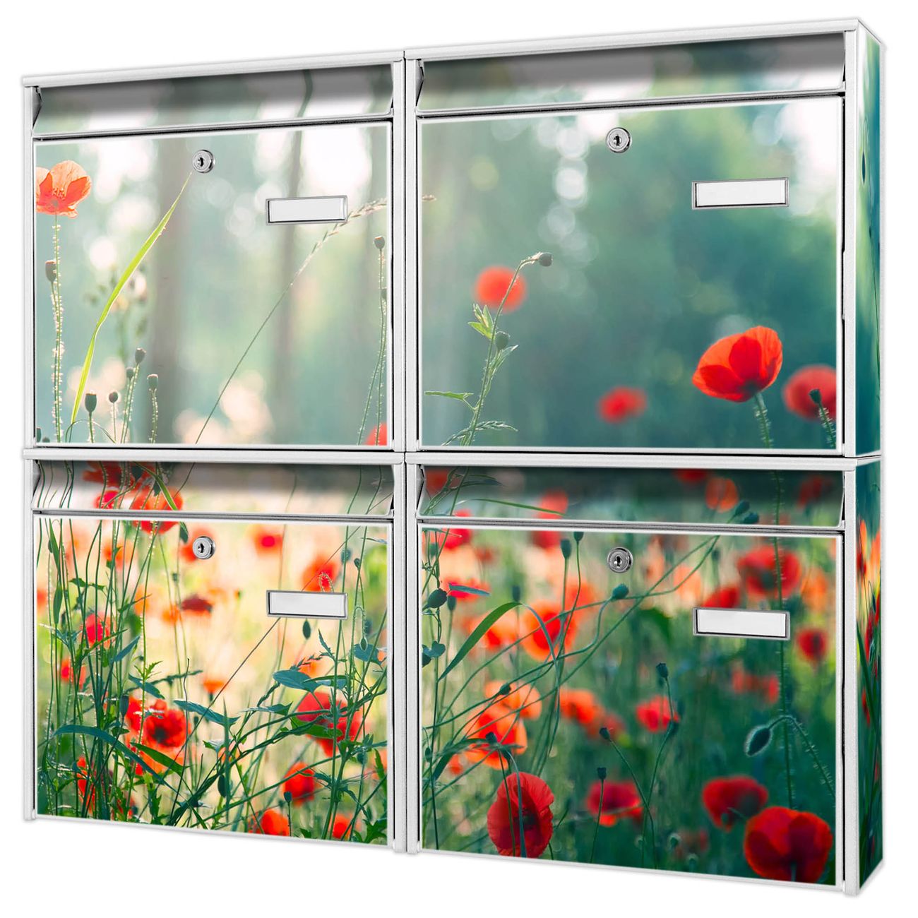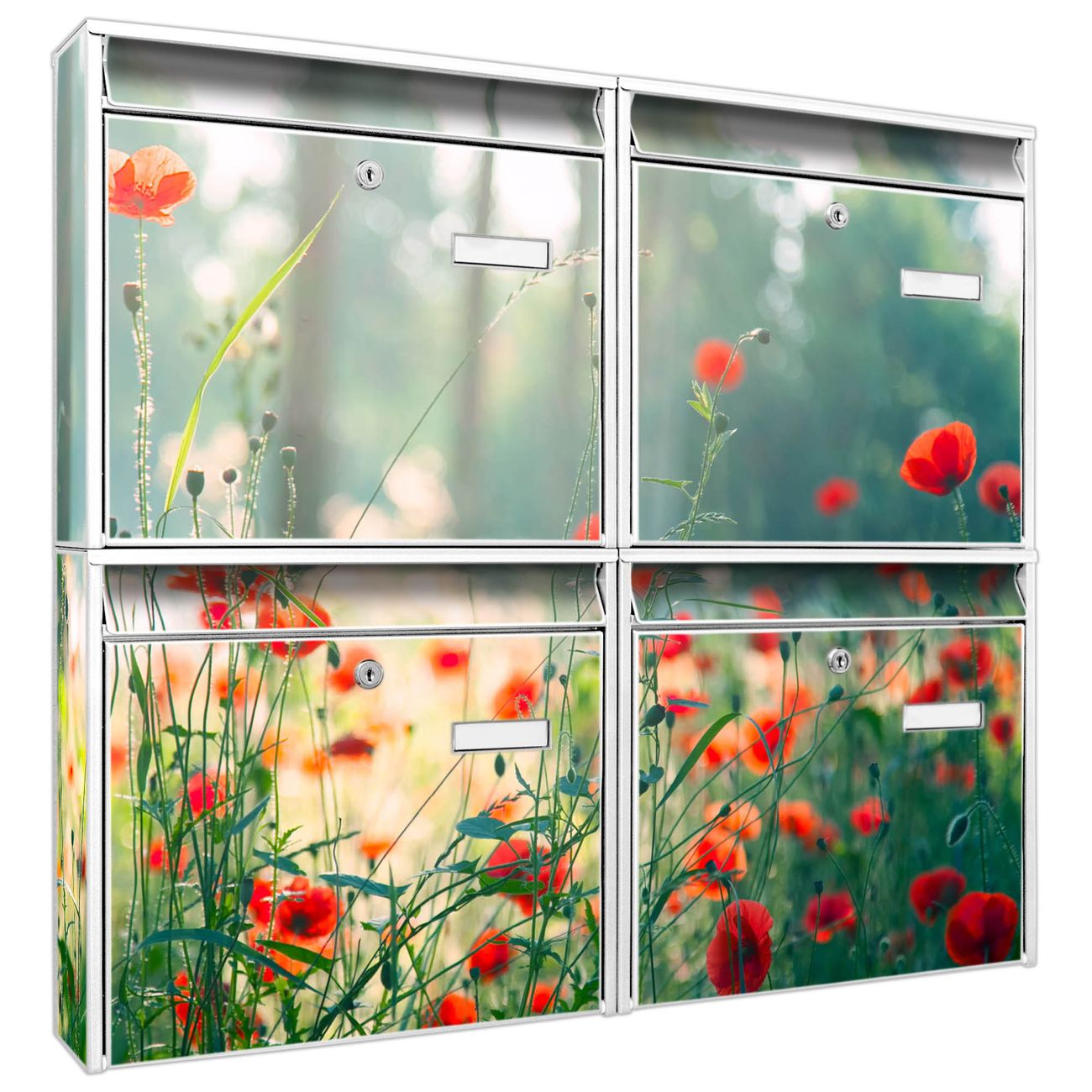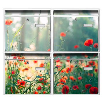FUNKTION: Die Burg-Wächter Briefkastenanlage mit Motiv Waldmohn bietet Ihnen ausreichend Fassungsvermögen um auch A4 und C4 Sendungen zu empfangen. Das integrierte Namensschild lässt sich individuell beschriften. Wählen Sie aus den Grundfarben weiß, silber und schwarz. DESIGN: Die 4 Briefkästen haben ein ansprechendes und zeitloses Design, ohne dabei auf Funktionalität zu verzichten. Das Material ist sehr stabil, wetterfest und rostfrei. Durch das Motiv Waldmohn werden die Postkästen zu einem Blickfang. DETAILS: Die Postkästen bestehen aus verzinktem Stahl der zusätzlich mit Klarlack versiegelt wurde. Die Kästen sind gesamt 64,5cm hoch, 72,5cm breit und 10cm tief. Das Motiv besteht aus einer wetter- und UV-festen Folie, die Ihren Briefkasten zusätzlich vor Kratzern schützt. Die Postkästen werden mit Montagematerial, je einem Namensschild und je zwei Schlüsseln geliefert. NUTZEN: Das Briefkastenset eignet sich für die Wandmontage, die Größe bietet genügend Platz für Sendungen aller Art. Das zeitlose Design sowie die stabile Bauart bieten Ihnen einen treuen Begleiter für Ihre Post. BANJADO: