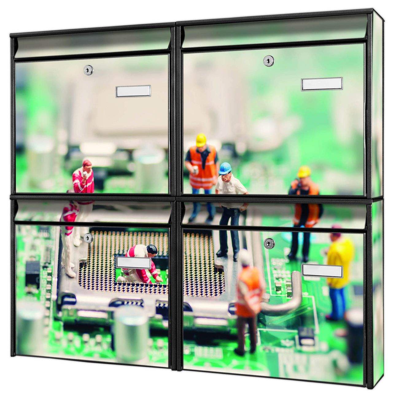 FUNKTION: Die Burg-Wächter Briefkastenanlage mit Motiv Wartungsarbeiten bietet Ihnen ausreichend Fassungsvermögen um auch A4 und C4 Sendungen zu empfangen. Das integrierte Namensschild lässt sich individuell beschriften. Wählen Sie aus den Grundfarben weiß, silber und schwarz. DESIGN: Die 4 Briefkästen haben ein ansprechendes und zeitloses Design, ohne dabei auf Funktionalität zu verzichten. Das Material ist sehr stabil, wetterfest und rostfrei. Durch das Motiv Wartungsarbeiten werden die Postkästen zu einem Blickfang. DETAILS: Die Postkästen bestehen aus verzinktem Stahl der zusätzlich mit Klarlack versiegelt wurde. Die Kästen sind gesamt 64,5cm hoch, 72,5cm breit und 10cm tief. Das Motiv besteht aus einer wetter- und UV-festen Folie, die Ihren Briefkasten zusätzlich vor Kratzern schützt. Die Postkästen werden mit Montagematerial, je einem Namensschild und je zwei Schlüsseln geliefert. NUTZEN: Das Briefkastenset eignet sich für die Wandmontage, die Größe bietet genügend Platz für Sendungen aller Art. Das zeitlose Design sowie die stabile Bauart bieten Ihnen einen treuen Begleiter für Ihre Post. BANJADO: