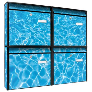 FUNKTION: Die Burg-Wächter Briefkastenanlage mit Motiv Wasseroberfläche bietet Ihnen ausreichend Fassungsvermögen um auch A4 und C4 Sendungen zu empfangen. Das integrierte Namensschild lässt sich individuell beschriften. Wählen Sie aus den Grundfarben weiß, silber und schwarz. DESIGN: Die 4 Briefkästen haben ein ansprechendes und zeitloses Design, ohne dabei auf Funktionalität zu verzichten. Das Material ist sehr stabil, wetterfest und rostfrei. Durch das Motiv Wasseroberfläche werden die Postkästen zu einem Blickfang. DETAILS: Die Postkästen bestehen aus verzinktem Stahl der zusätzlich mit Klarlack versiegelt wurde. Die Kästen sind gesamt 64,5cm hoch, 72,5cm breit und 10cm tief. Das Motiv besteht aus einer wetter- und UV-festen Folie, die Ihren Briefkasten zusätzlich vor Kratzern schützt. Die Postkästen werden mit Montagematerial, je einem Namensschild und je zwei Schlüsseln geliefert. NUTZEN: Das Briefkastenset eignet sich für die Wandmontage, die Größe bietet genügend Platz für Sendungen aller Art. Das zeitlose Design sowie die stabile Bauart bieten Ihnen einen treuen Begleiter für Ihre Post. BANJADO:
