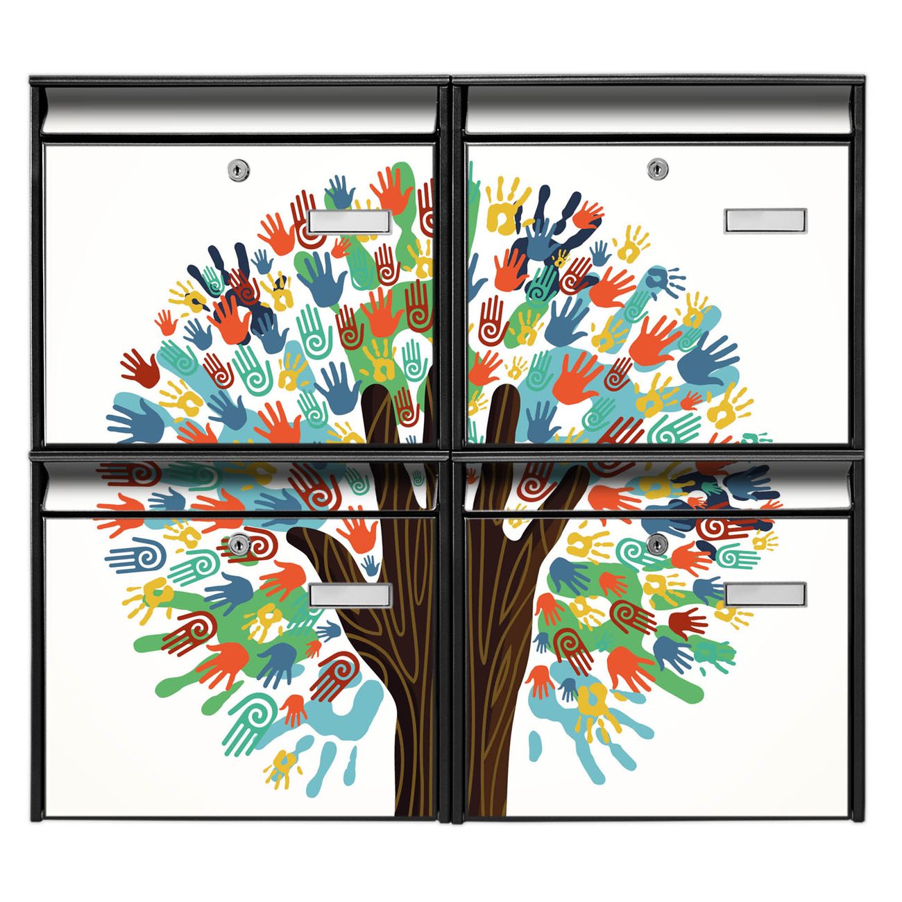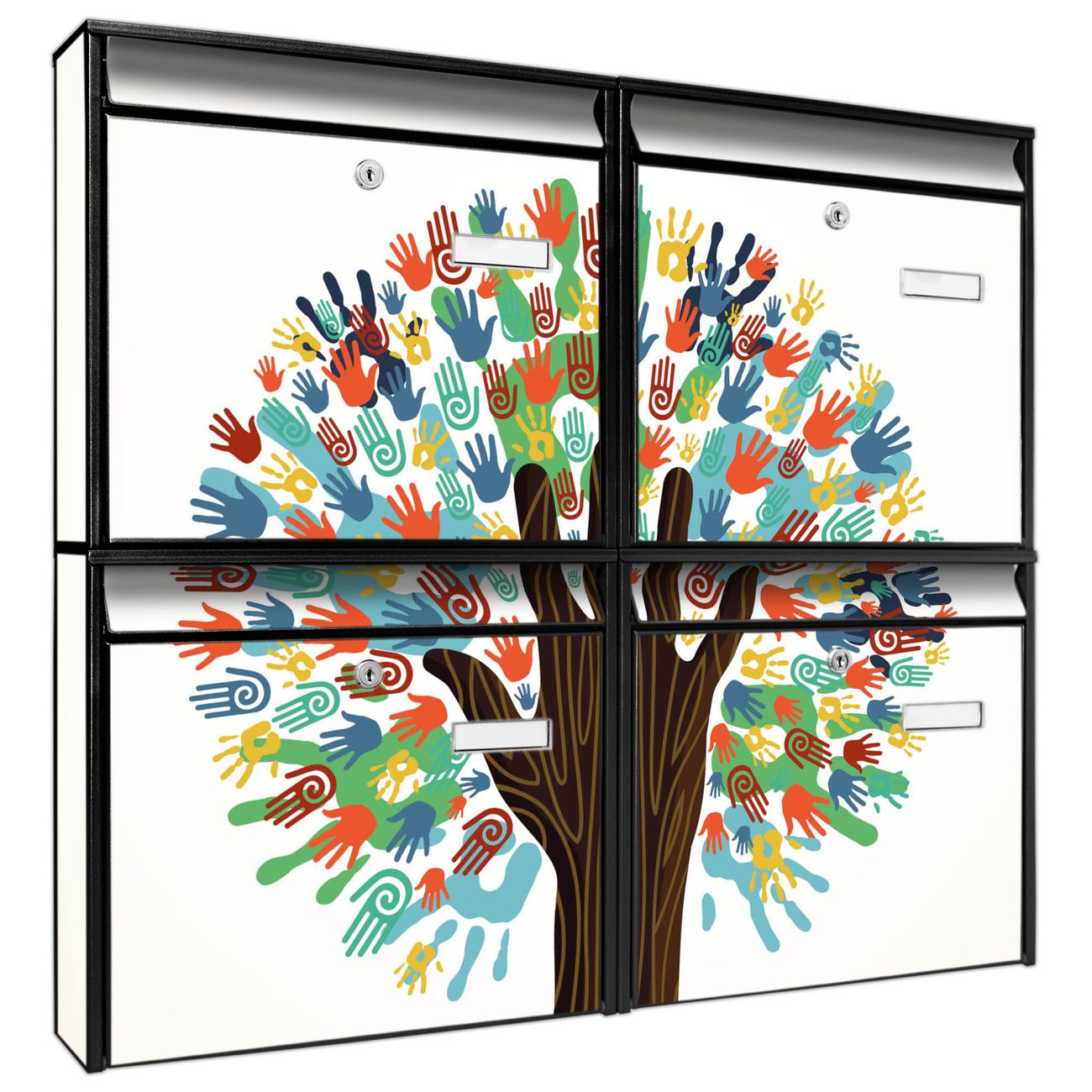 FUNKTION: Die Burg-Wächter Briefkastenanlage mit Motiv We are the World bietet Ihnen ausreichend Fassungsvermögen um auch A4 und C4 Sendungen zu empfangen. Das integrierte Namensschild lässt sich individuell beschriften. Wählen Sie aus den Grundfarben weiß, silber und schwarz. DESIGN: Die 4 Briefkästen haben ein ansprechendes und zeitloses Design, ohne dabei auf Funktionalität zu verzichten. Das Material ist sehr stabil, wetterfest und rostfrei. Durch das Motiv We are the World werden die Postkästen zu einem Blickfang. DETAILS: Die Postkästen bestehen aus verzinktem Stahl der zusätzlich mit Klarlack versiegelt wurde. Die Kästen sind gesamt 64,5cm hoch, 72,5cm breit und 10cm tief. Das Motiv besteht aus einer wetter- und UV-festen Folie, die Ihren Briefkasten zusätzlich vor Kratzern schützt. Die Postkästen werden mit Montagematerial, je einem Namensschild und je zwei Schlüsseln geliefert. NUTZEN: Das Briefkastenset eignet sich für die Wandmontage, die Größe bietet genügend Platz für Sendungen aller Art. Das zeitlose Design sowie die stabile Bauart bieten Ihnen einen treuen Begleiter für Ihre Post. BANJADO: