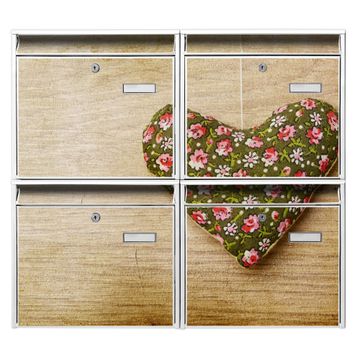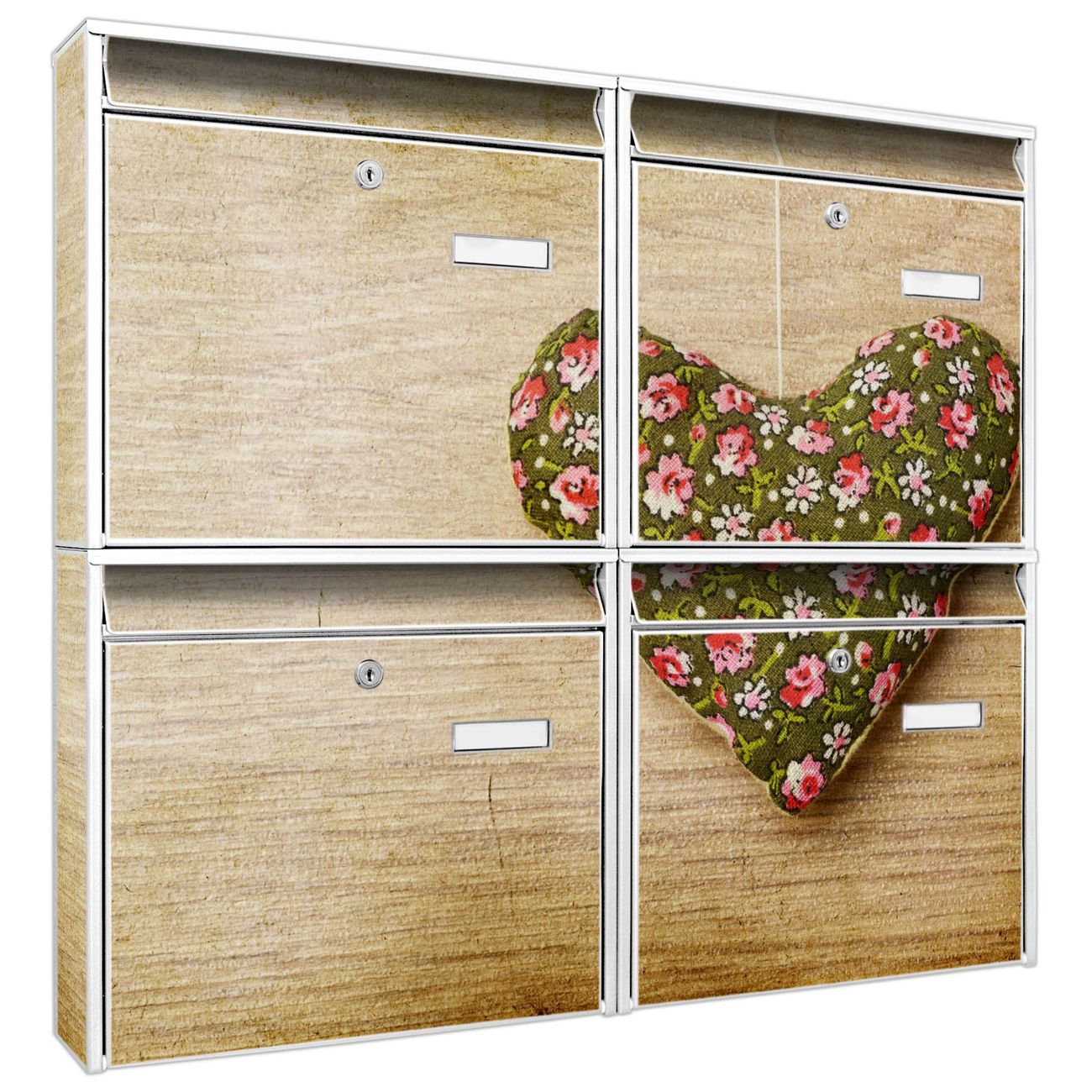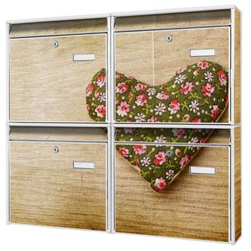 FUNKTION: Die Burg-Wächter Briefkastenanlage mit Motiv Weiches Herz bietet Ihnen ausreichend Fassungsvermögen um auch A4 und C4 Sendungen zu empfangen. Das integrierte Namensschild lässt sich individuell beschriften. Wählen Sie aus den Grundfarben weiß, silber und schwarz. DESIGN: Die 4 Briefkästen haben ein ansprechendes und zeitloses Design, ohne dabei auf Funktionalität zu verzichten. Das Material ist sehr stabil, wetterfest und rostfrei. Durch das Motiv Weiches Herz werden die Postkästen zu einem Blickfang. DETAILS: Die Postkästen bestehen aus verzinktem Stahl der zusätzlich mit Klarlack versiegelt wurde. Die Kästen sind gesamt 64,5cm hoch, 72,5cm breit und 10cm tief. Das Motiv besteht aus einer wetter- und UV-festen Folie, die Ihren Briefkasten zusätzlich vor Kratzern schützt. Die Postkästen werden mit Montagematerial, je einem Namensschild und je zwei Schlüsseln geliefert. NUTZEN: Das Briefkastenset eignet sich für die Wandmontage, die Größe bietet genügend Platz für Sendungen aller Art. Das zeitlose Design sowie die stabile Bauart bieten Ihnen einen treuen Begleiter für Ihre Post. BANJADO: