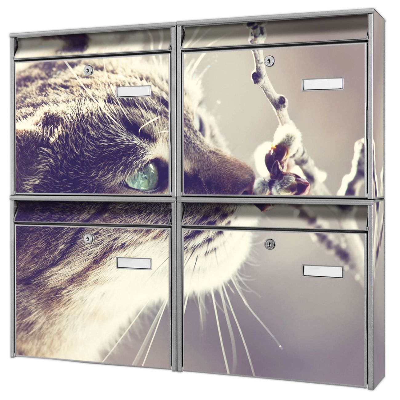 FUNKTION: Die Burg-Wächter Briefkastenanlage mit Motiv Weidenkätzchen bietet Ihnen ausreichend Fassungsvermögen um auch A4 und C4 Sendungen zu empfangen. Das integrierte Namensschild lässt sich individuell beschriften. Wählen Sie aus den Grundfarben weiß, silber und schwarz. DESIGN: Die 4 Briefkästen haben ein ansprechendes und zeitloses Design, ohne dabei auf Funktionalität zu verzichten. Das Material ist sehr stabil, wetterfest und rostfrei. Durch das Motiv Weidenkätzchen werden die Postkästen zu einem Blickfang. DETAILS: Die Postkästen bestehen aus verzinktem Stahl der zusätzlich mit Klarlack versiegelt wurde. Die Kästen sind gesamt 64,5cm hoch, 72,5cm breit und 10cm tief. Das Motiv besteht aus einer wetter- und UV-festen Folie, die Ihren Briefkasten zusätzlich vor Kratzern schützt. Die Postkästen werden mit Montagematerial, je einem Namensschild und je zwei Schlüsseln geliefert. NUTZEN: Das Briefkastenset eignet sich für die Wandmontage, die Größe bietet genügend Platz für Sendungen aller Art. Das zeitlose Design sowie die stabile Bauart bieten Ihnen einen treuen Begleiter für Ihre Post. BANJADO: