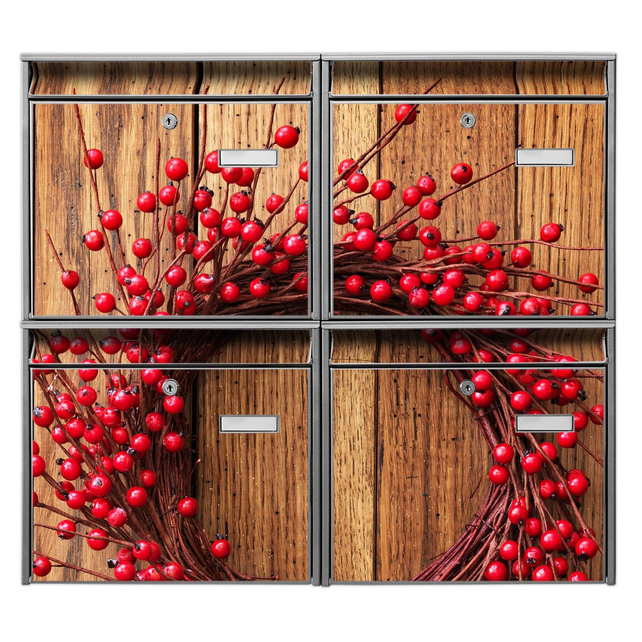 FUNKTION: Die Burg-Wächter Briefkastenanlage mit Motiv Weihnachtskranz bietet Ihnen ausreichend Fassungsvermögen um auch A4 und C4 Sendungen zu empfangen. Das integrierte Namensschild lässt sich individuell beschriften. Wählen Sie aus den Grundfarben weiß, silber und schwarz. DESIGN: Die 4 Briefkästen haben ein ansprechendes und zeitloses Design, ohne dabei auf Funktionalität zu verzichten. Das Material ist sehr stabil, wetterfest und rostfrei. Durch das Motiv Weihnachtskranz werden die Postkästen zu einem Blickfang. DETAILS: Die Postkästen bestehen aus verzinktem Stahl der zusätzlich mit Klarlack versiegelt wurde. Die Kästen sind gesamt 64,5cm hoch, 72,5cm breit und 10cm tief. Das Motiv besteht aus einer wetter- und UV-festen Folie, die Ihren Briefkasten zusätzlich vor Kratzern schützt. Die Postkästen werden mit Montagematerial, je einem Namensschild und je zwei Schlüsseln geliefert. NUTZEN: Das Briefkastenset eignet sich für die Wandmontage, die Größe bietet genügend Platz für Sendungen aller Art. Das zeitlose Design sowie die stabile Bauart bieten Ihnen einen treuen Begleiter für Ihre Post. BANJADO: