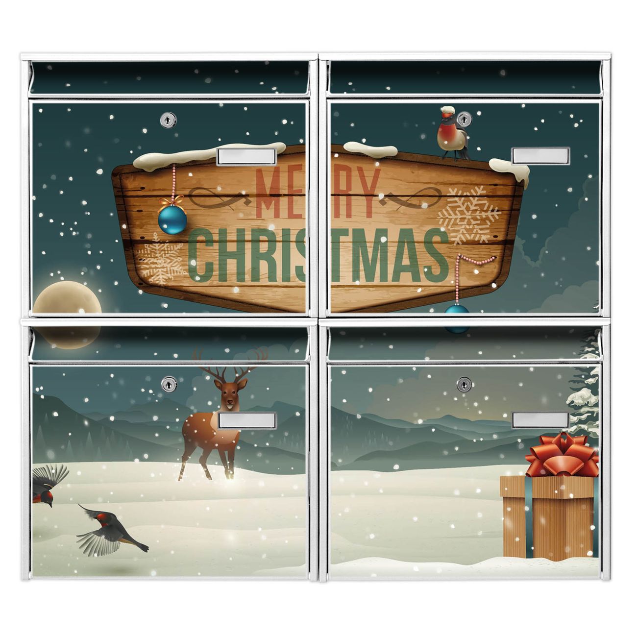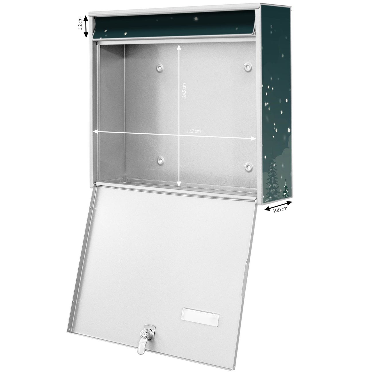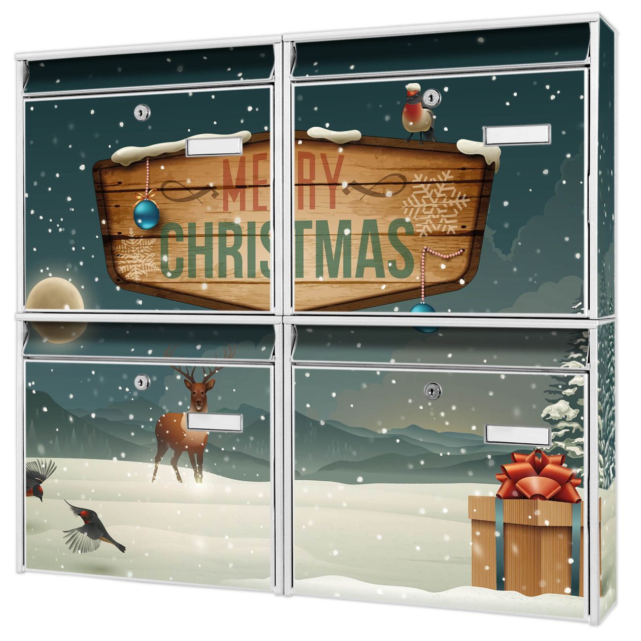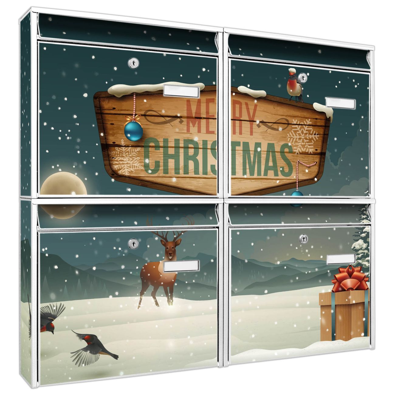 FUNKTION: Die Burg-Wächter Briefkastenanlage mit Motiv Weihnachtsland bietet Ihnen ausreichend Fassungsvermögen um auch A4 und C4 Sendungen zu empfangen. Das integrierte Namensschild lässt sich individuell beschriften. Wählen Sie aus den Grundfarben weiß, silber und schwarz. DESIGN: Die 4 Briefkästen haben ein ansprechendes und zeitloses Design, ohne dabei auf Funktionalität zu verzichten. Das Material ist sehr stabil, wetterfest und rostfrei. Durch das Motiv Weihnachtsland werden die Postkästen zu einem Blickfang. DETAILS: Die Postkästen bestehen aus verzinktem Stahl der zusätzlich mit Klarlack versiegelt wurde. Die Kästen sind gesamt 64,5cm hoch, 72,5cm breit und 10cm tief. Das Motiv besteht aus einer wetter- und UV-festen Folie, die Ihren Briefkasten zusätzlich vor Kratzern schützt. Die Postkästen werden mit Montagematerial, je einem Namensschild und je zwei Schlüsseln geliefert. NUTZEN: Das Briefkastenset eignet sich für die Wandmontage, die Größe bietet genügend Platz für Sendungen aller Art. Das zeitlose Design sowie die stabile Bauart bieten Ihnen einen treuen Begleiter für Ihre Post. BANJADO: