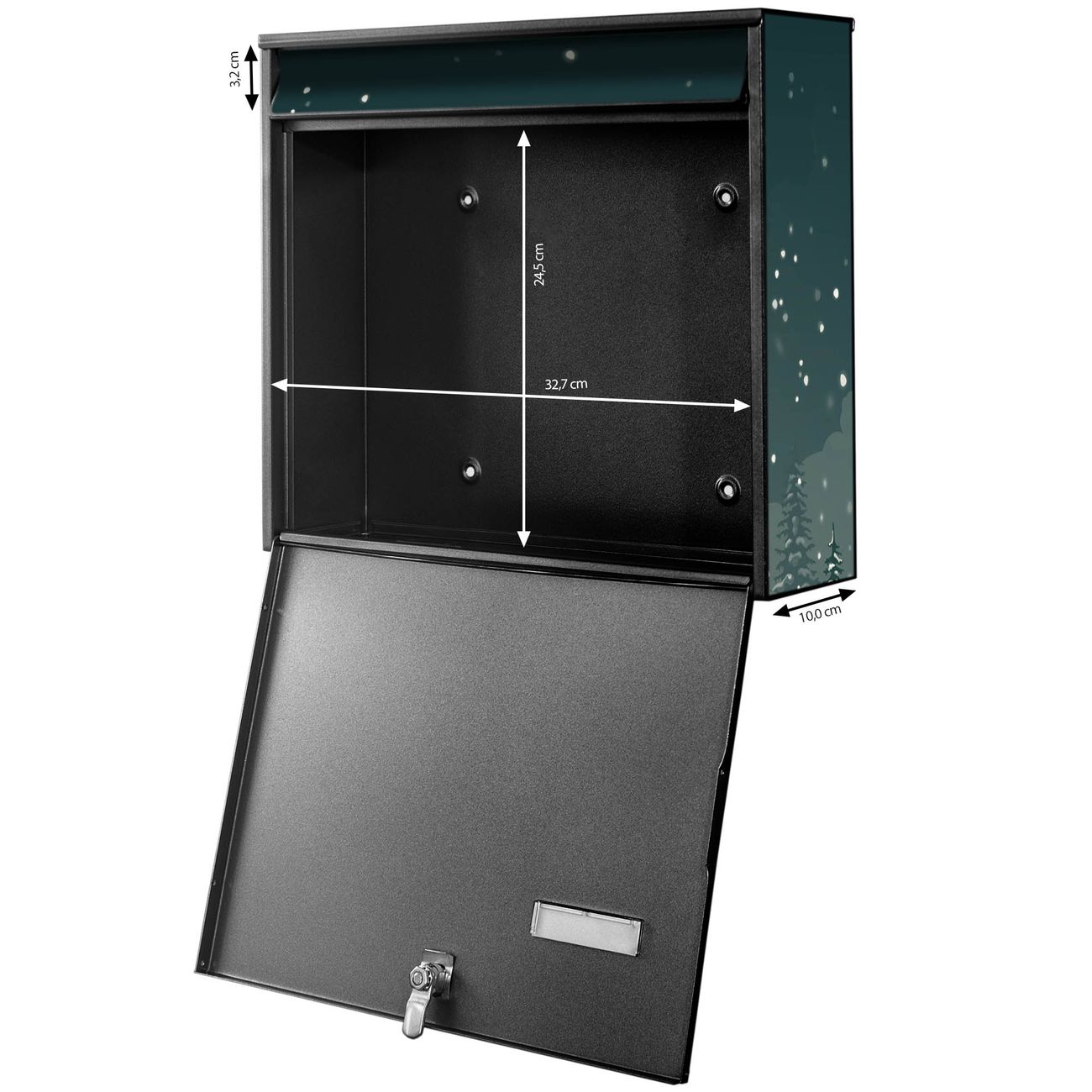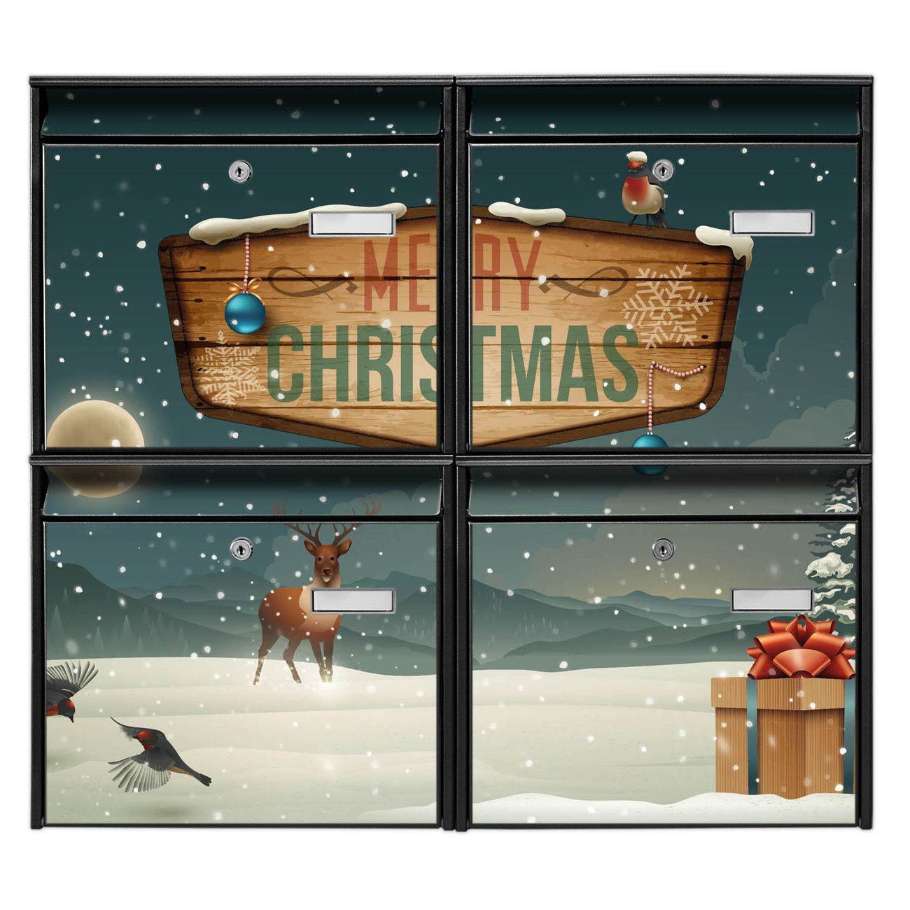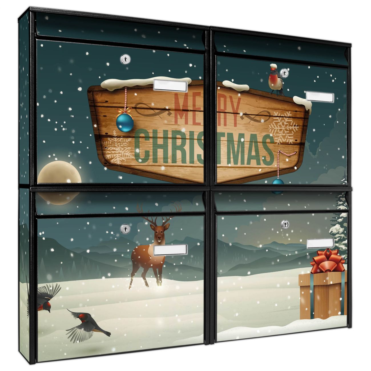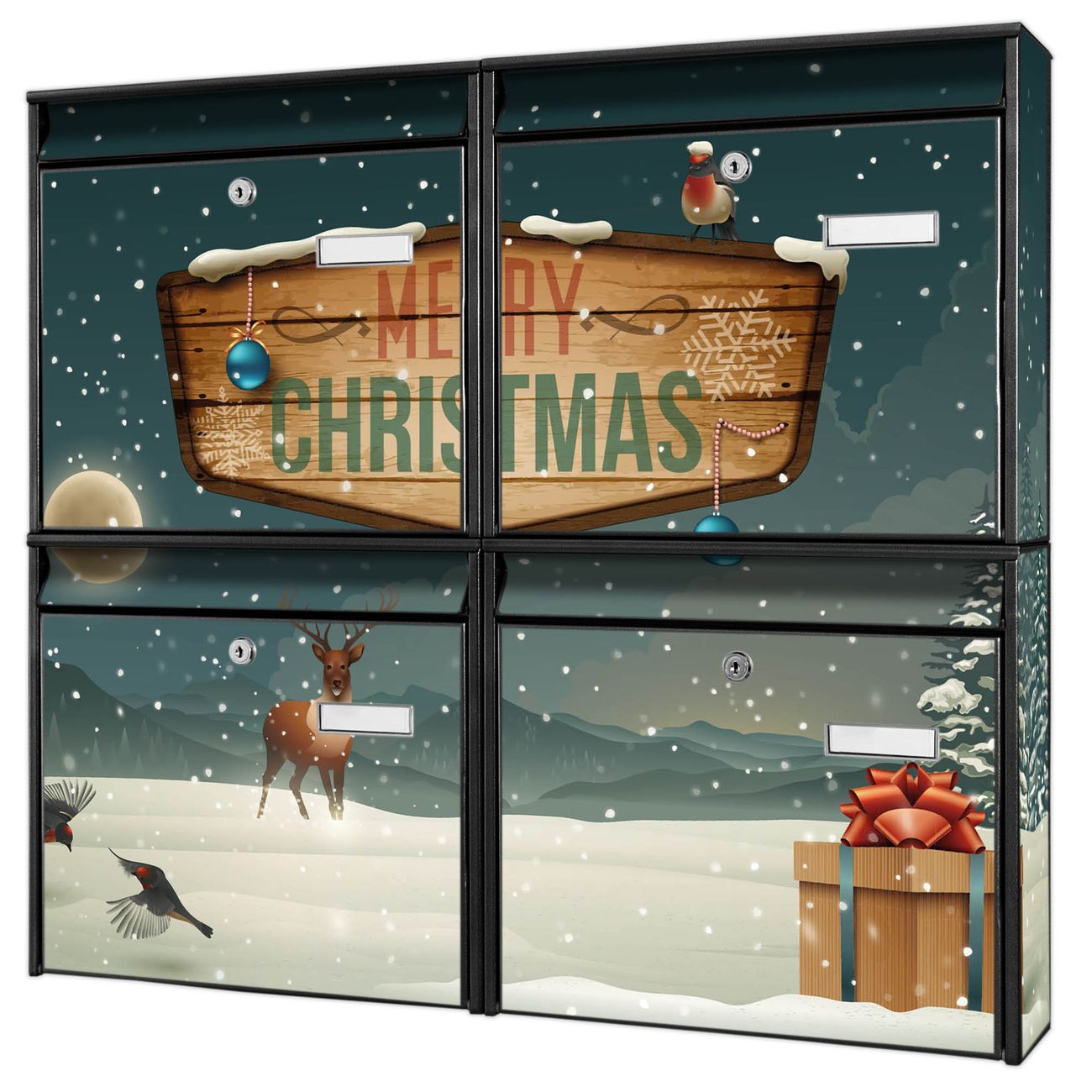 FUNKTION: Die Burg-Wächter Briefkastenanlage mit Motiv Weihnachtsland bietet Ihnen ausreichend Fassungsvermögen um auch A4 und C4 Sendungen zu empfangen. Das integrierte Namensschild lässt sich individuell beschriften. Wählen Sie aus den Grundfarben weiß, silber und schwarz. DESIGN: Die 4 Briefkästen haben ein ansprechendes und zeitloses Design, ohne dabei auf Funktionalität zu verzichten. Das Material ist sehr stabil, wetterfest und rostfrei. Durch das Motiv Weihnachtsland werden die Postkästen zu einem Blickfang. DETAILS: Die Postkästen bestehen aus verzinktem Stahl der zusätzlich mit Klarlack versiegelt wurde. Die Kästen sind gesamt 64,5cm hoch, 72,5cm breit und 10cm tief. Das Motiv besteht aus einer wetter- und UV-festen Folie, die Ihren Briefkasten zusätzlich vor Kratzern schützt. Die Postkästen werden mit Montagematerial, je einem Namensschild und je zwei Schlüsseln geliefert. NUTZEN: Das Briefkastenset eignet sich für die Wandmontage, die Größe bietet genügend Platz für Sendungen aller Art. Das zeitlose Design sowie die stabile Bauart bieten Ihnen einen treuen Begleiter für Ihre Post. BANJADO: