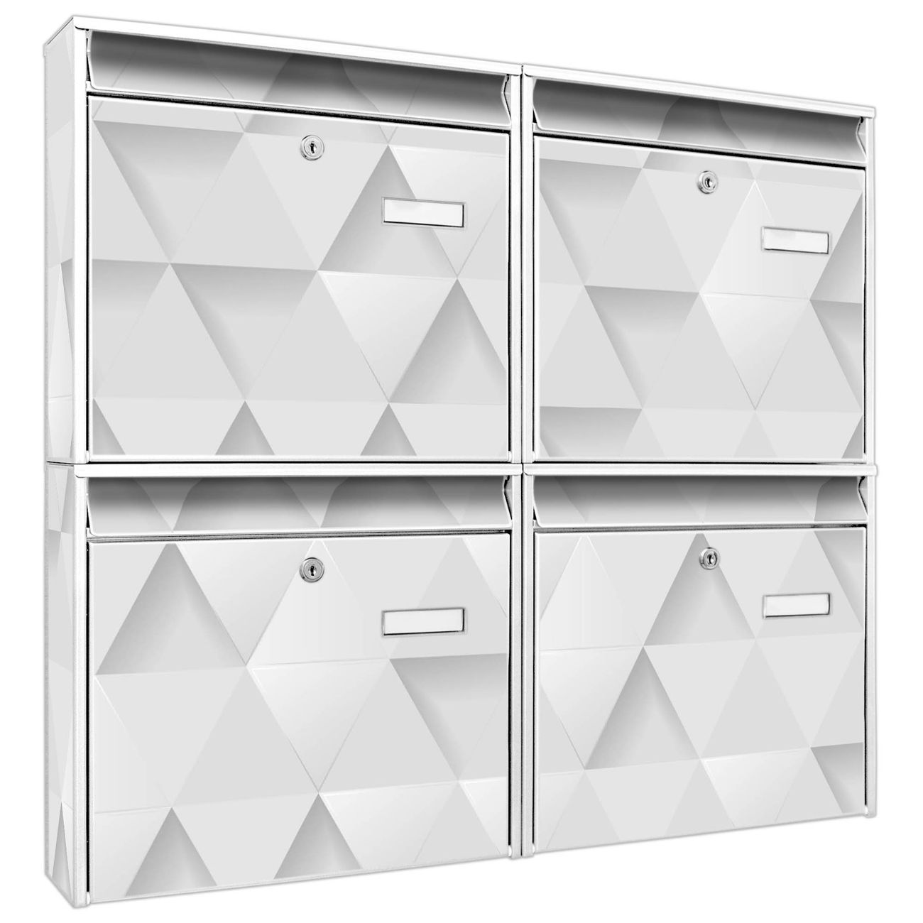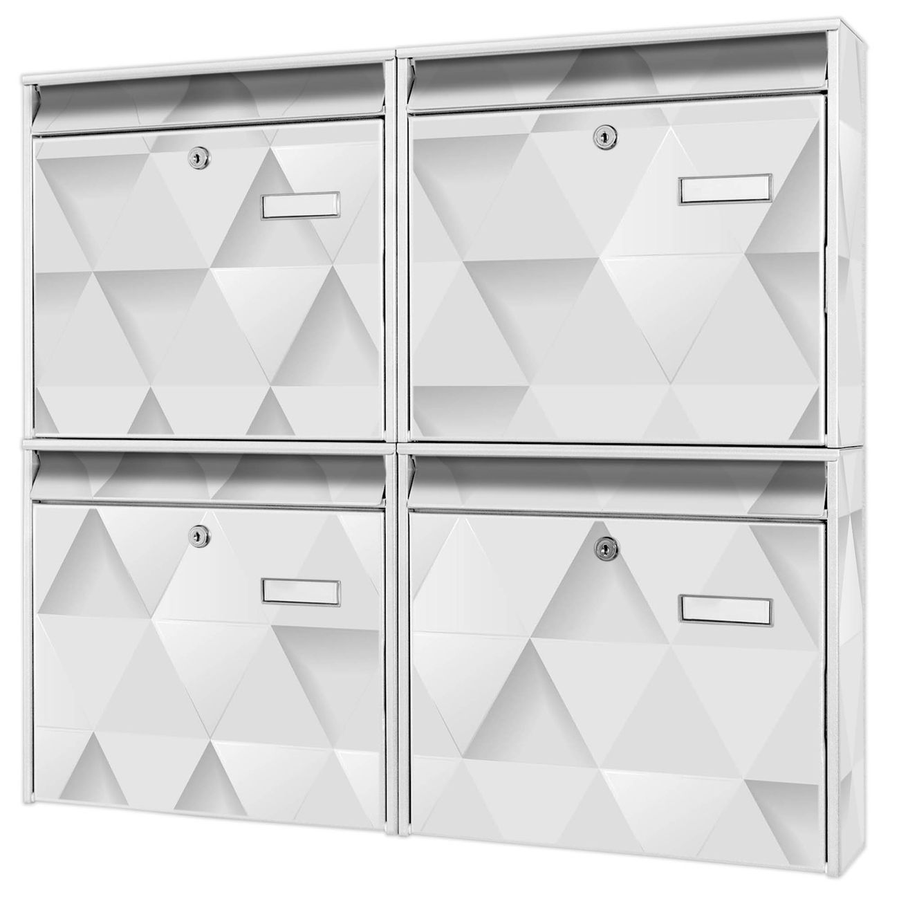 FUNKTION: Die Burg-Wächter Briefkastenanlage mit Motiv Weisse Dreiecke bietet Ihnen ausreichend Fassungsvermögen um auch A4 und C4 Sendungen zu empfangen. Das integrierte Namensschild lässt sich individuell beschriften. Wählen Sie aus den Grundfarben weiß, silber und schwarz. DESIGN: Die 4 Briefkästen haben ein ansprechendes und zeitloses Design, ohne dabei auf Funktionalität zu verzichten. Das Material ist sehr stabil, wetterfest und rostfrei. Durch das Motiv Weisse Dreiecke werden die Postkästen zu einem Blickfang. DETAILS: Die Postkästen bestehen aus verzinktem Stahl der zusätzlich mit Klarlack versiegelt wurde. Die Kästen sind gesamt 64,5cm hoch, 72,5cm breit und 10cm tief. Das Motiv besteht aus einer wetter- und UV-festen Folie, die Ihren Briefkasten zusätzlich vor Kratzern schützt. Die Postkästen werden mit Montagematerial, je einem Namensschild und je zwei Schlüsseln geliefert. NUTZEN: Das Briefkastenset eignet sich für die Wandmontage, die Größe bietet genügend Platz für Sendungen aller Art. Das zeitlose Design sowie die stabile Bauart bieten Ihnen einen treuen Begleiter für Ihre Post. BANJADO: