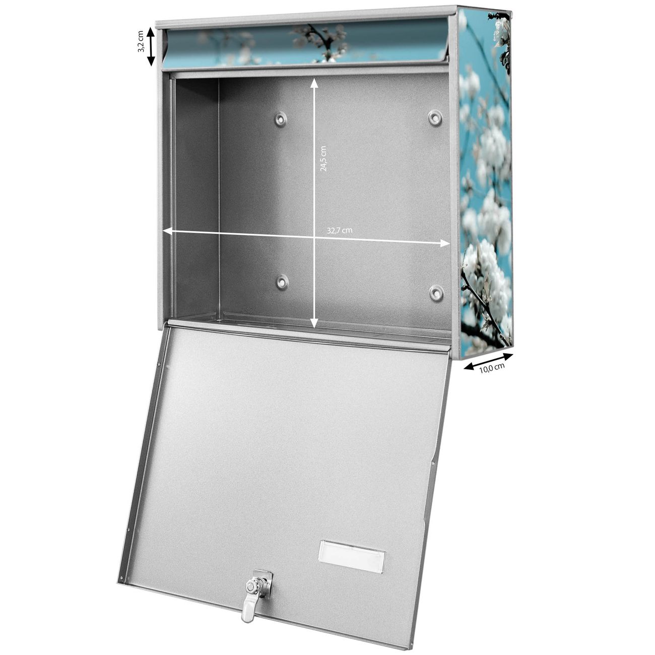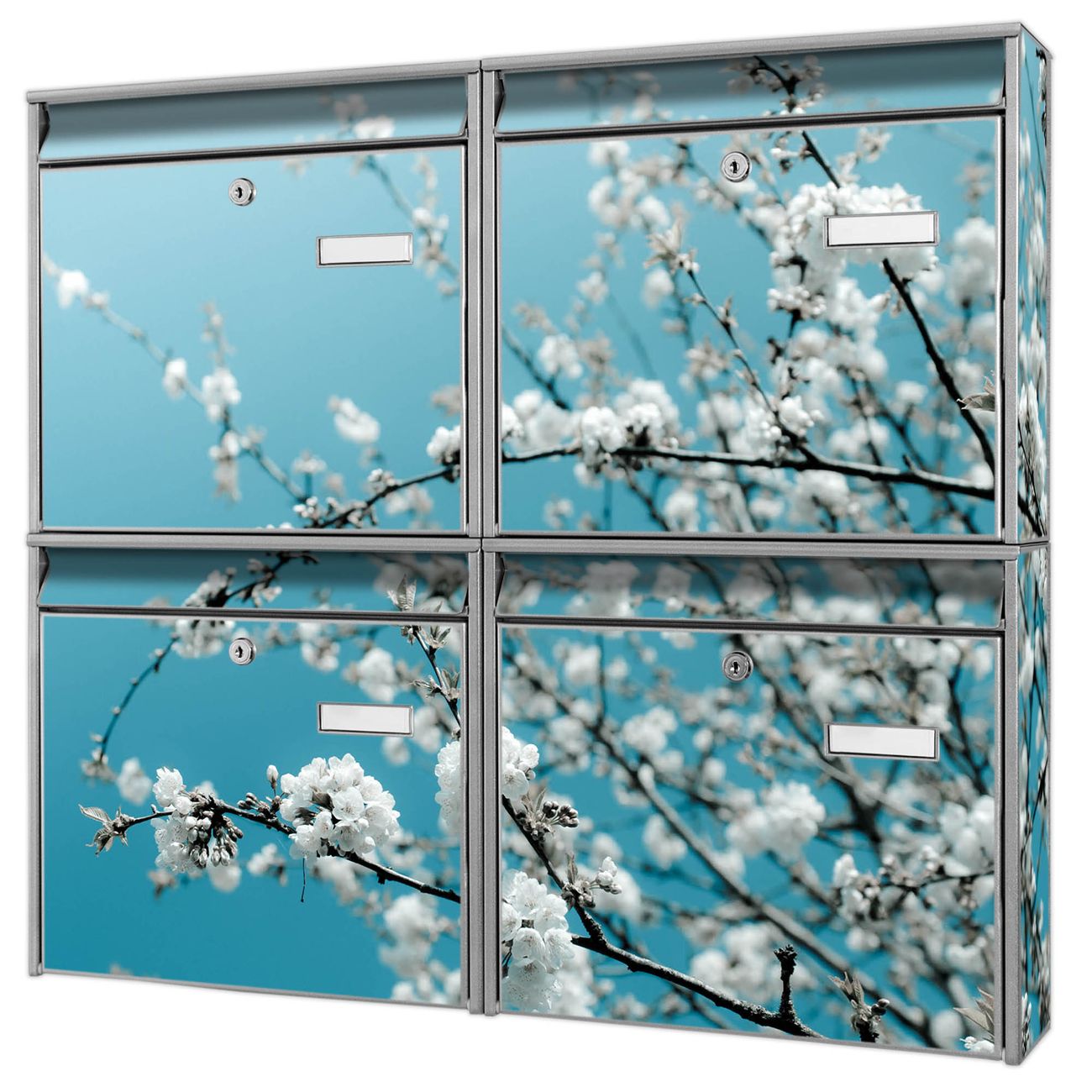 FUNKTION: Die Burg-Wächter Briefkastenanlage mit Motiv weiße Kirschblüten bietet Ihnen ausreichend Fassungsvermögen um auch A4 und C4 Sendungen zu empfangen. Das integrierte Namensschild lässt sich individuell beschriften. Wählen Sie aus den Grundfarben weiß, silber und schwarz. DESIGN: Die 4 Briefkästen haben ein ansprechendes und zeitloses Design, ohne dabei auf Funktionalität zu verzichten. Das Material ist sehr stabil, wetterfest und rostfrei. Durch das Motiv weiße Kirschblüten werden die Postkästen zu einem Blickfang. DETAILS: Die Postkästen bestehen aus verzinktem Stahl der zusätzlich mit Klarlack versiegelt wurde. Die Kästen sind gesamt 64,5cm hoch, 72,5cm breit und 10cm tief. Das Motiv besteht aus einer wetter- und UV-festen Folie, die Ihren Briefkasten zusätzlich vor Kratzern schützt. Die Postkästen werden mit Montagematerial, je einem Namensschild und je zwei Schlüsseln geliefert. NUTZEN: Das Briefkastenset eignet sich für die Wandmontage, die Größe bietet genügend Platz für Sendungen aller Art. Das zeitlose Design sowie die stabile Bauart bieten Ihnen einen treuen Begleiter für Ihre Post. BANJADO: