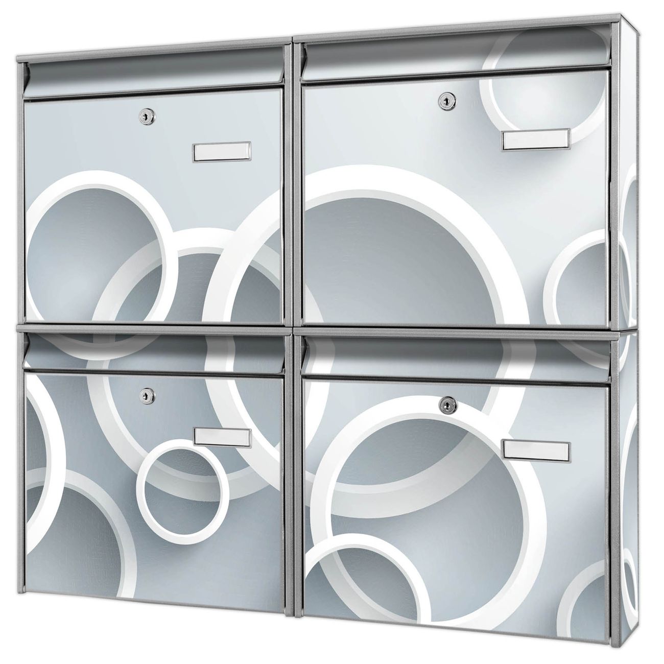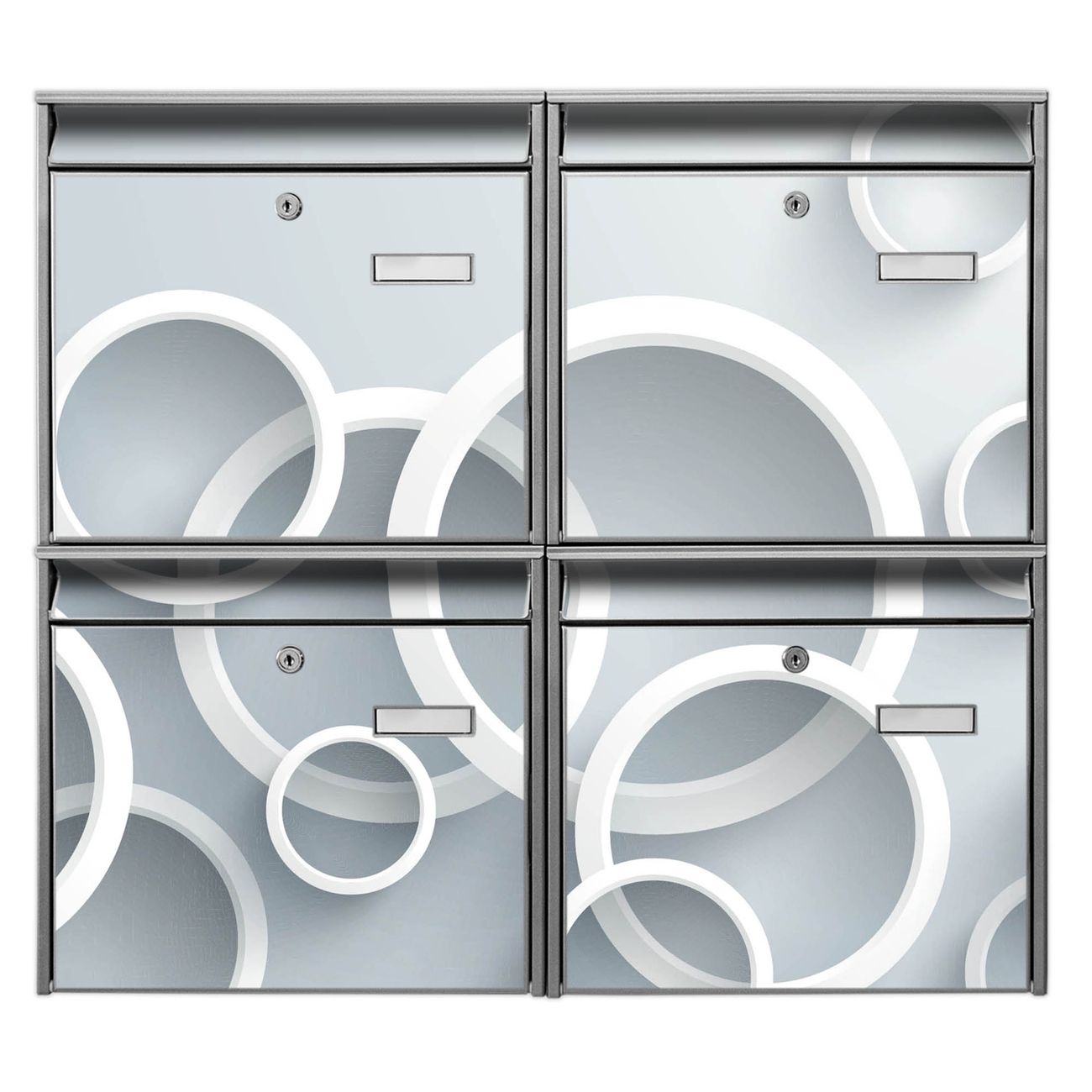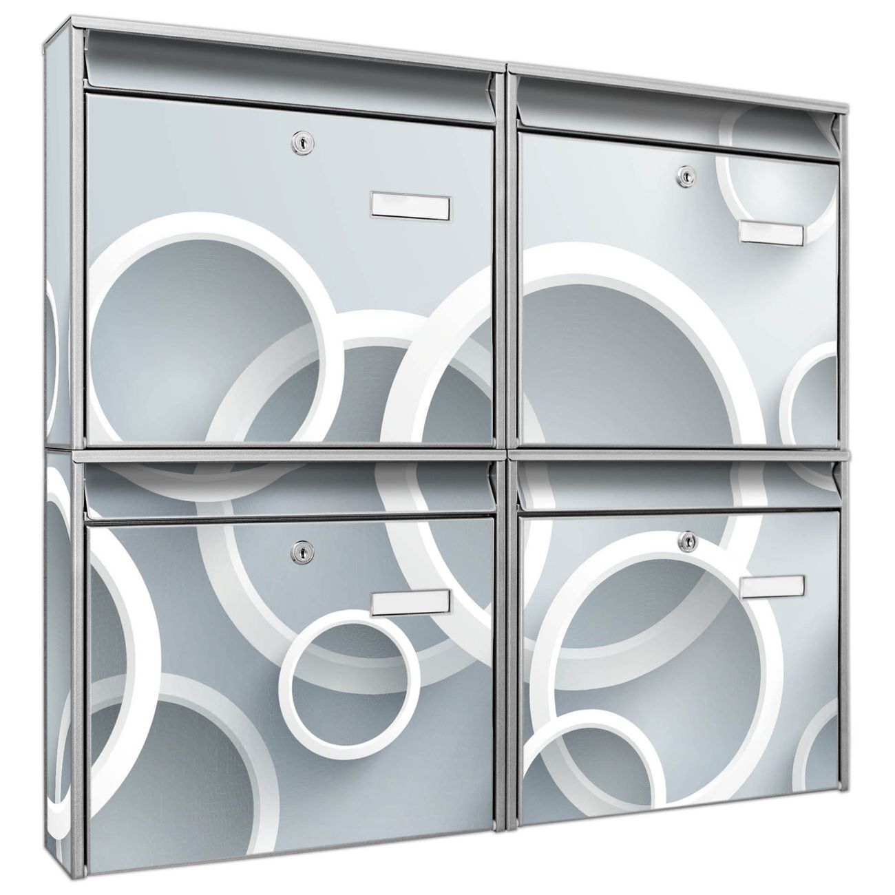 FUNKTION: Die Burg-Wächter Briefkastenanlage mit Motiv Weiße Ringe bietet Ihnen ausreichend Fassungsvermögen um auch A4 und C4 Sendungen zu empfangen. Das integrierte Namensschild lässt sich individuell beschriften. Wählen Sie aus den Grundfarben weiß, silber und schwarz. DESIGN: Die 4 Briefkästen haben ein ansprechendes und zeitloses Design, ohne dabei auf Funktionalität zu verzichten. Das Material ist sehr stabil, wetterfest und rostfrei. Durch das Motiv Weiße Ringe werden die Postkästen zu einem Blickfang. DETAILS: Die Postkästen bestehen aus verzinktem Stahl der zusätzlich mit Klarlack versiegelt wurde. Die Kästen sind gesamt 64,5cm hoch, 72,5cm breit und 10cm tief. Das Motiv besteht aus einer wetter- und UV-festen Folie, die Ihren Briefkasten zusätzlich vor Kratzern schützt. Die Postkästen werden mit Montagematerial, je einem Namensschild und je zwei Schlüsseln geliefert. NUTZEN: Das Briefkastenset eignet sich für die Wandmontage, die Größe bietet genügend Platz für Sendungen aller Art. Das zeitlose Design sowie die stabile Bauart bieten Ihnen einen treuen Begleiter für Ihre Post. BANJADO: