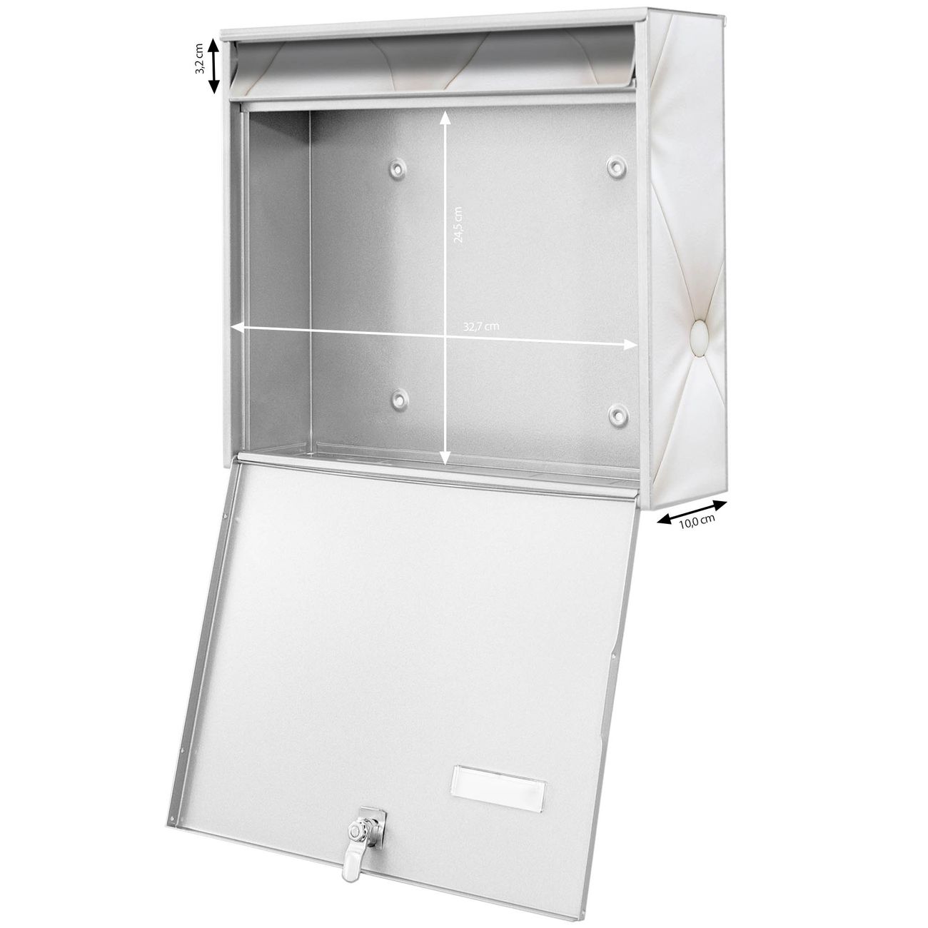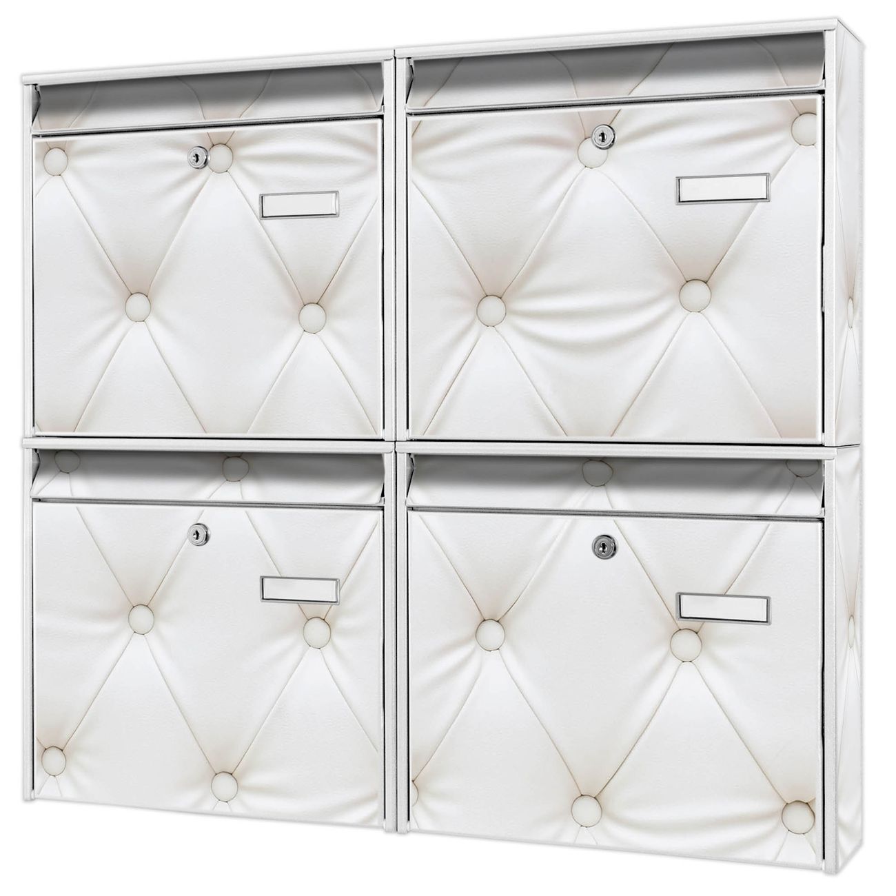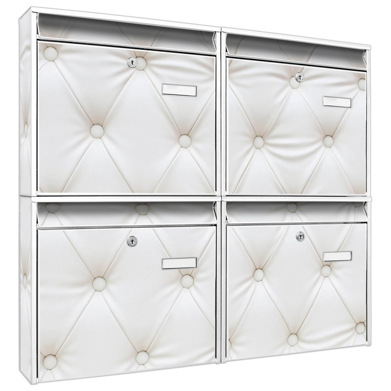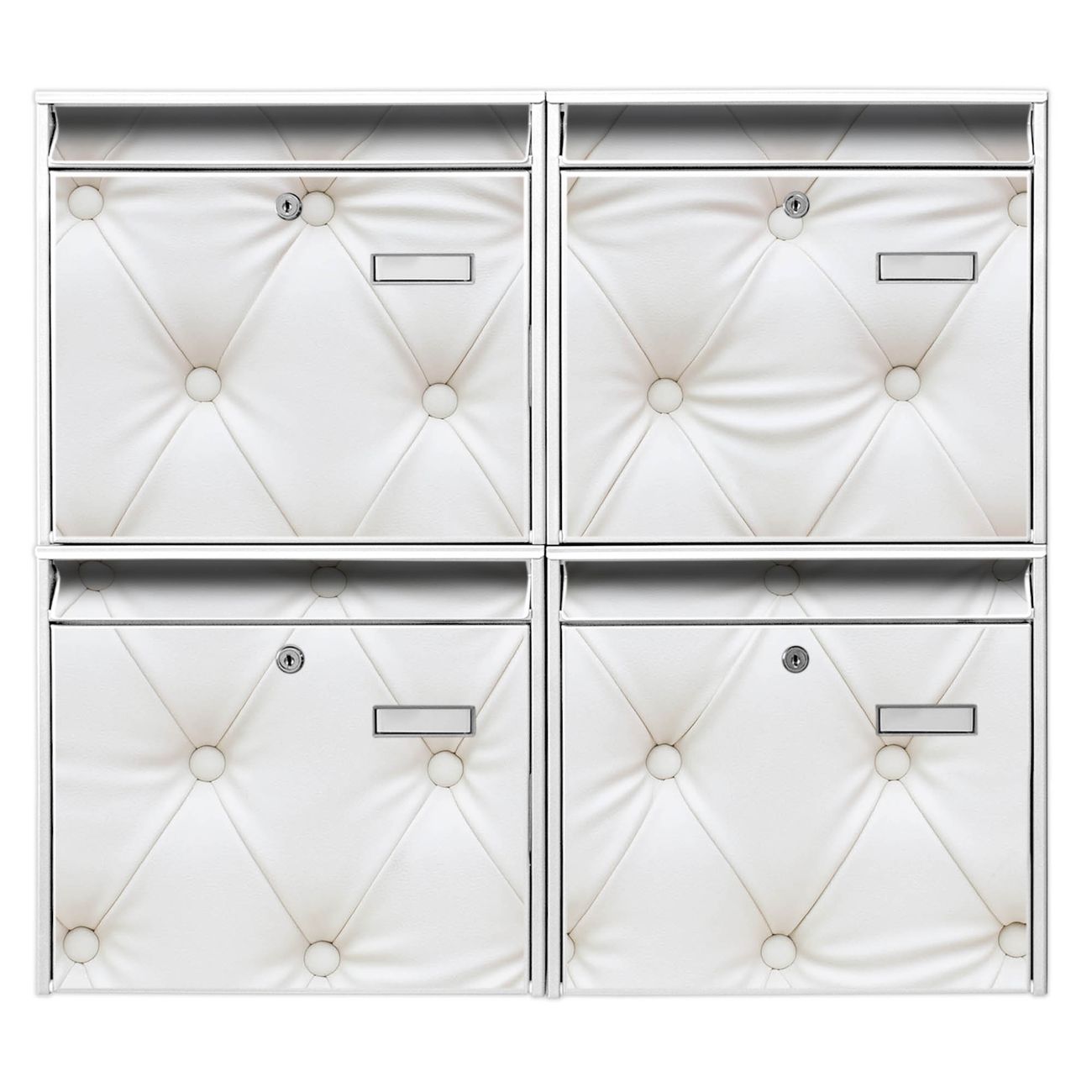 FUNKTION: Die Burg-Wächter Briefkastenanlage mit Motiv Weißes Polster bietet Ihnen ausreichend Fassungsvermögen um auch A4 und C4 Sendungen zu empfangen. Das integrierte Namensschild lässt sich individuell beschriften. Wählen Sie aus den Grundfarben weiß, silber und schwarz. DESIGN: Die 4 Briefkästen haben ein ansprechendes und zeitloses Design, ohne dabei auf Funktionalität zu verzichten. Das Material ist sehr stabil, wetterfest und rostfrei. Durch das Motiv Weißes Polster werden die Postkästen zu einem Blickfang. DETAILS: Die Postkästen bestehen aus verzinktem Stahl der zusätzlich mit Klarlack versiegelt wurde. Die Kästen sind gesamt 64,5cm hoch, 72,5cm breit und 10cm tief. Das Motiv besteht aus einer wetter- und UV-festen Folie, die Ihren Briefkasten zusätzlich vor Kratzern schützt. Die Postkästen werden mit Montagematerial, je einem Namensschild und je zwei Schlüsseln geliefert. NUTZEN: Das Briefkastenset eignet sich für die Wandmontage, die Größe bietet genügend Platz für Sendungen aller Art. Das zeitlose Design sowie die stabile Bauart bieten Ihnen einen treuen Begleiter für Ihre Post. BANJADO: