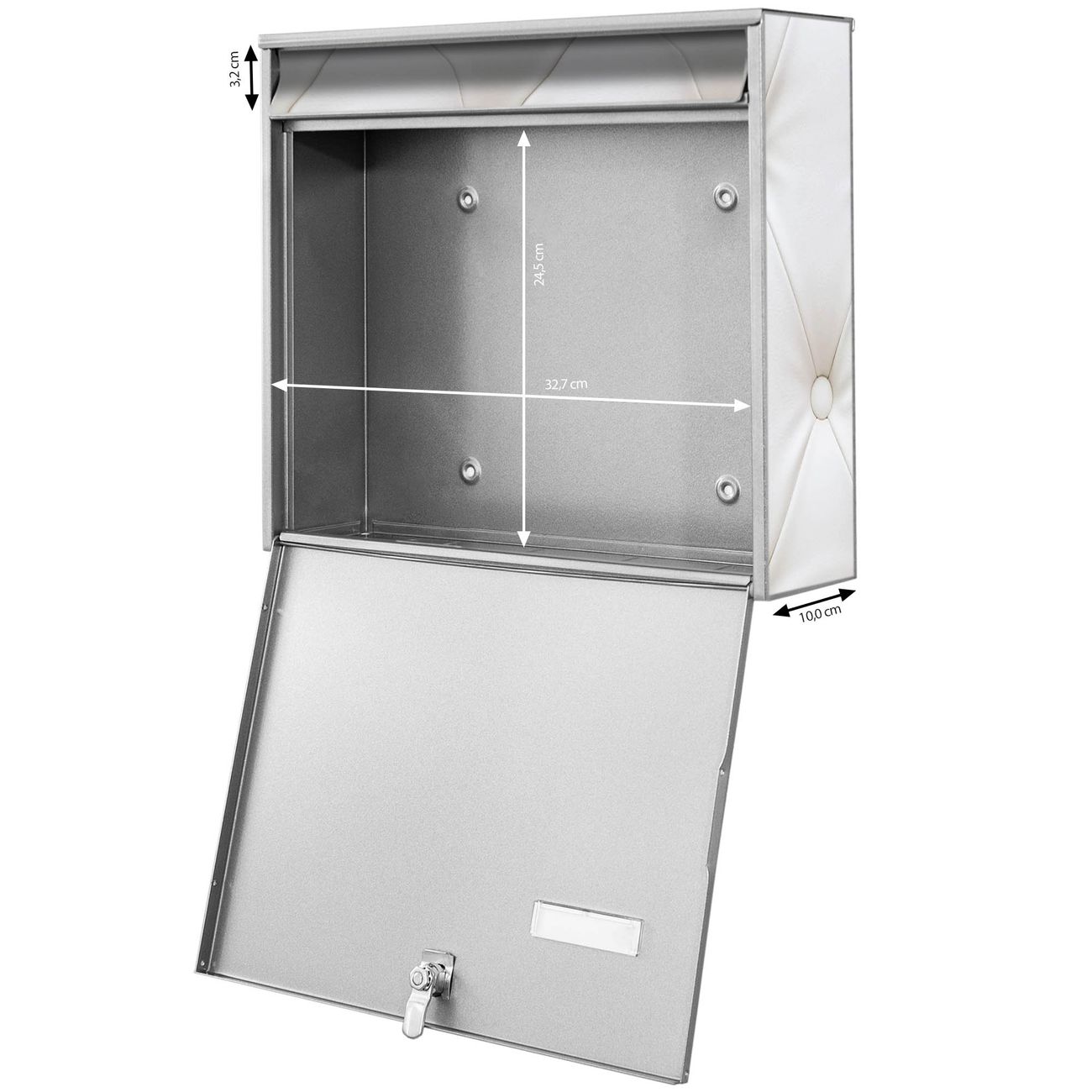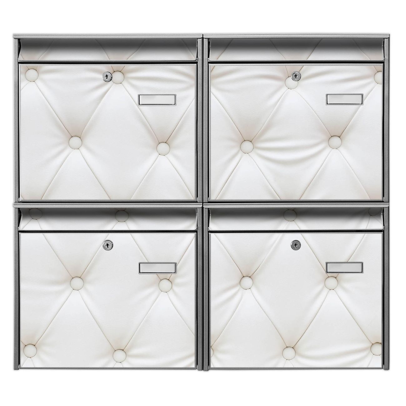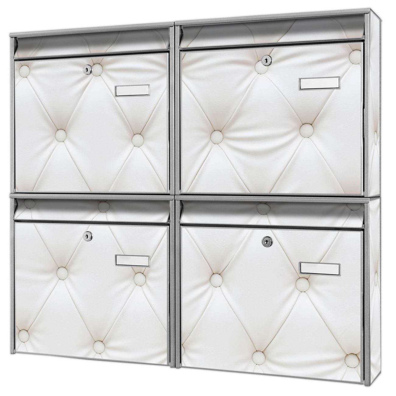 FUNKTION: Die Burg-Wächter Briefkastenanlage mit Motiv Weißes Polster bietet Ihnen ausreichend Fassungsvermögen um auch A4 und C4 Sendungen zu empfangen. Das integrierte Namensschild lässt sich individuell beschriften. Wählen Sie aus den Grundfarben weiß, silber und schwarz. DESIGN: Die 4 Briefkästen haben ein ansprechendes und zeitloses Design, ohne dabei auf Funktionalität zu verzichten. Das Material ist sehr stabil, wetterfest und rostfrei. Durch das Motiv Weißes Polster werden die Postkästen zu einem Blickfang. DETAILS: Die Postkästen bestehen aus verzinktem Stahl der zusätzlich mit Klarlack versiegelt wurde. Die Kästen sind gesamt 64,5cm hoch, 72,5cm breit und 10cm tief. Das Motiv besteht aus einer wetter- und UV-festen Folie, die Ihren Briefkasten zusätzlich vor Kratzern schützt. Die Postkästen werden mit Montagematerial, je einem Namensschild und je zwei Schlüsseln geliefert. NUTZEN: Das Briefkastenset eignet sich für die Wandmontage, die Größe bietet genügend Platz für Sendungen aller Art. Das zeitlose Design sowie die stabile Bauart bieten Ihnen einen treuen Begleiter für Ihre Post. BANJADO: