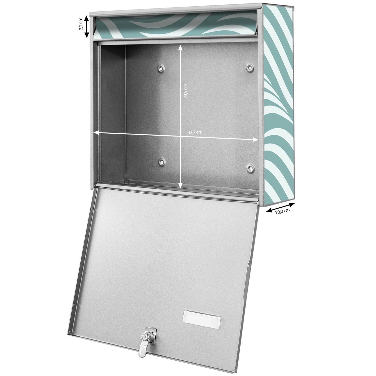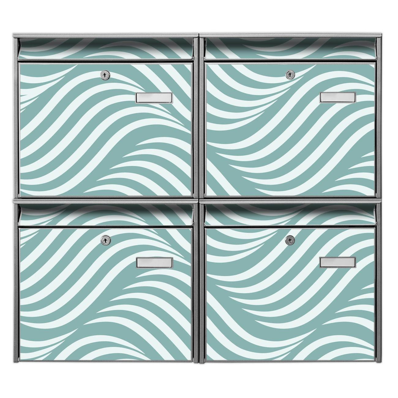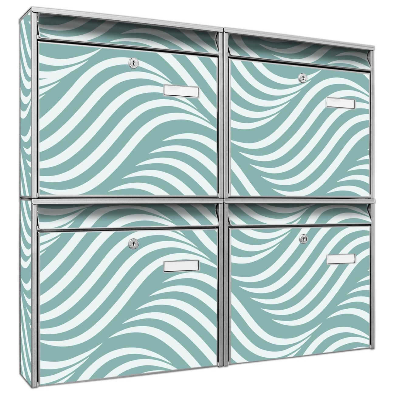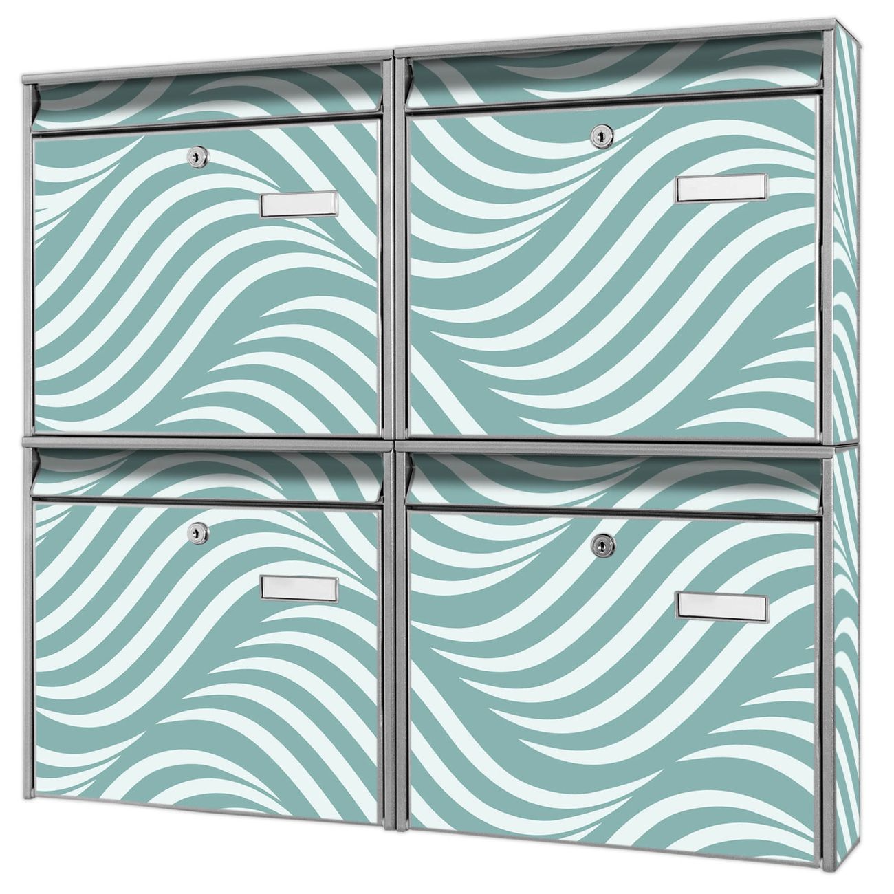 FUNKTION: Die Burg-Wächter Briefkastenanlage mit Motiv Wellen Lindgrün bietet Ihnen ausreichend Fassungsvermögen um auch A4 und C4 Sendungen zu empfangen. Das integrierte Namensschild lässt sich individuell beschriften. Wählen Sie aus den Grundfarben weiß, silber und schwarz. DESIGN: Die 4 Briefkästen haben ein ansprechendes und zeitloses Design, ohne dabei auf Funktionalität zu verzichten. Das Material ist sehr stabil, wetterfest und rostfrei. Durch das Motiv Wellen Lindgrün werden die Postkästen zu einem Blickfang. DETAILS: Die Postkästen bestehen aus verzinktem Stahl der zusätzlich mit Klarlack versiegelt wurde. Die Kästen sind gesamt 64,5cm hoch, 72,5cm breit und 10cm tief. Das Motiv besteht aus einer wetter- und UV-festen Folie, die Ihren Briefkasten zusätzlich vor Kratzern schützt. Die Postkästen werden mit Montagematerial, je einem Namensschild und je zwei Schlüsseln geliefert. NUTZEN: Das Briefkastenset eignet sich für die Wandmontage, die Größe bietet genügend Platz für Sendungen aller Art. Das zeitlose Design sowie die stabile Bauart bieten Ihnen einen treuen Begleiter für Ihre Post. BANJADO: