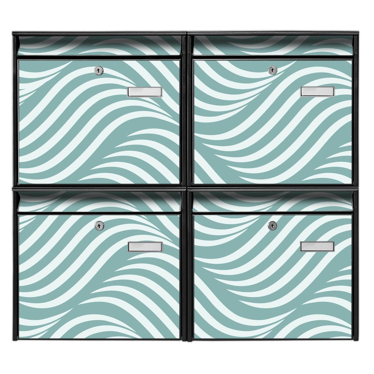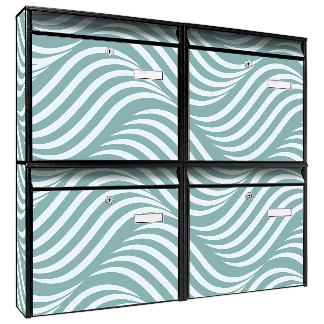 FUNKTION: Die Burg-Wächter Briefkastenanlage mit Motiv Wellen Lindgrün bietet Ihnen ausreichend Fassungsvermögen um auch A4 und C4 Sendungen zu empfangen. Das integrierte Namensschild lässt sich individuell beschriften. Wählen Sie aus den Grundfarben weiß, silber und schwarz. DESIGN: Die 4 Briefkästen haben ein ansprechendes und zeitloses Design, ohne dabei auf Funktionalität zu verzichten. Das Material ist sehr stabil, wetterfest und rostfrei. Durch das Motiv Wellen Lindgrün werden die Postkästen zu einem Blickfang. DETAILS: Die Postkästen bestehen aus verzinktem Stahl der zusätzlich mit Klarlack versiegelt wurde. Die Kästen sind gesamt 64,5cm hoch, 72,5cm breit und 10cm tief. Das Motiv besteht aus einer wetter- und UV-festen Folie, die Ihren Briefkasten zusätzlich vor Kratzern schützt. Die Postkästen werden mit Montagematerial, je einem Namensschild und je zwei Schlüsseln geliefert. NUTZEN: Das Briefkastenset eignet sich für die Wandmontage, die Größe bietet genügend Platz für Sendungen aller Art. Das zeitlose Design sowie die stabile Bauart bieten Ihnen einen treuen Begleiter für Ihre Post. BANJADO: