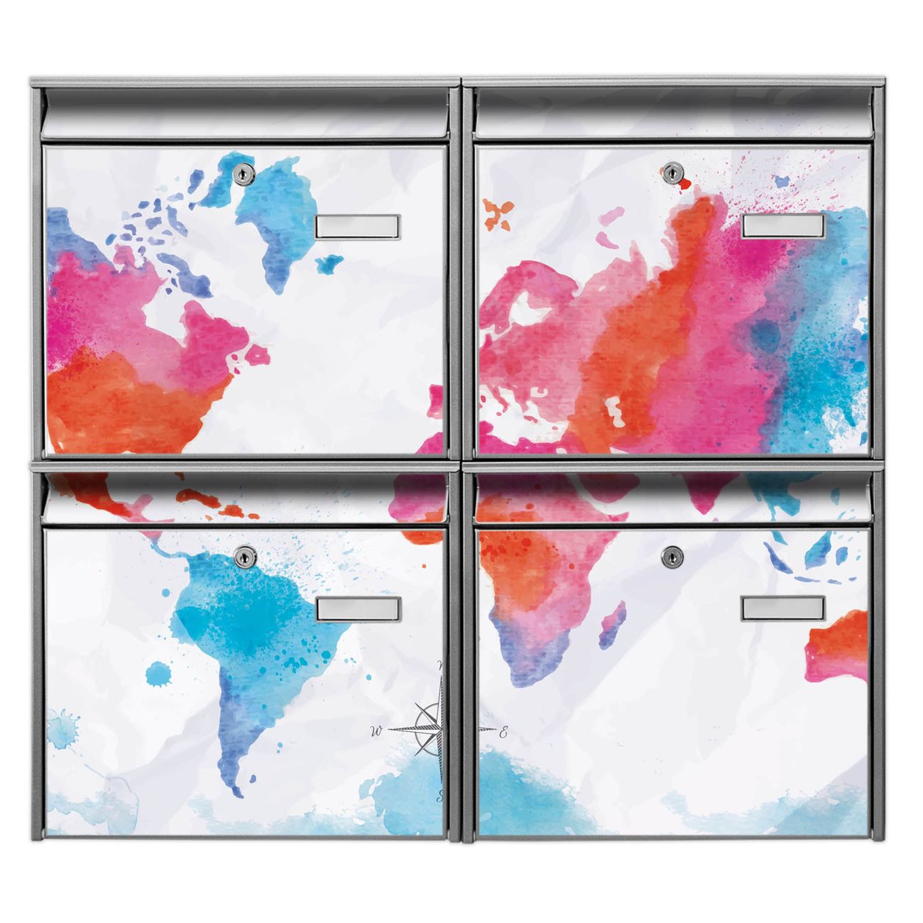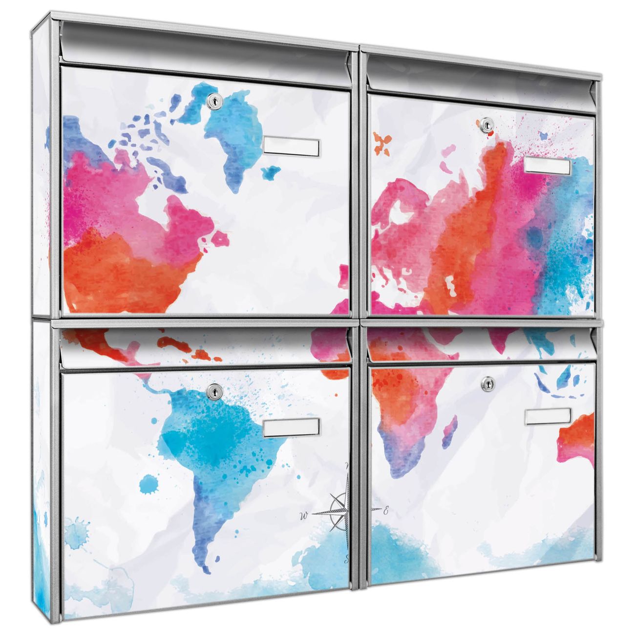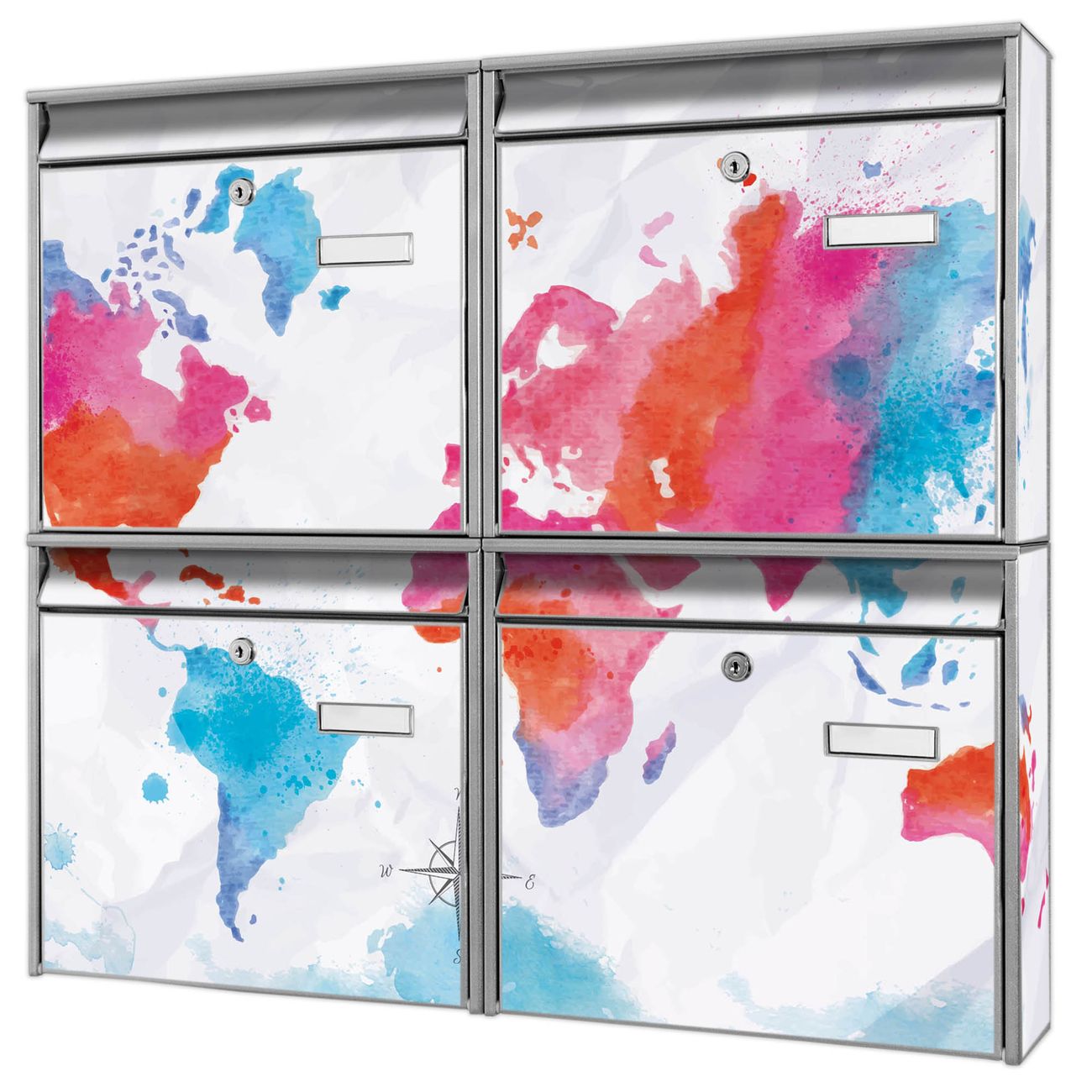 FUNKTION: Die Burg-Wächter Briefkastenanlage mit Motiv Weltkarte pastell bietet Ihnen ausreichend Fassungsvermögen um auch A4 und C4 Sendungen zu empfangen. Das integrierte Namensschild lässt sich individuell beschriften. Wählen Sie aus den Grundfarben weiß, silber und schwarz. DESIGN: Die 4 Briefkästen haben ein ansprechendes und zeitloses Design, ohne dabei auf Funktionalität zu verzichten. Das Material ist sehr stabil, wetterfest und rostfrei. Durch das Motiv Weltkarte pastell werden die Postkästen zu einem Blickfang. DETAILS: Die Postkästen bestehen aus verzinktem Stahl der zusätzlich mit Klarlack versiegelt wurde. Die Kästen sind gesamt 64,5cm hoch, 72,5cm breit und 10cm tief. Das Motiv besteht aus einer wetter- und UV-festen Folie, die Ihren Briefkasten zusätzlich vor Kratzern schützt. Die Postkästen werden mit Montagematerial, je einem Namensschild und je zwei Schlüsseln geliefert. NUTZEN: Das Briefkastenset eignet sich für die Wandmontage, die Größe bietet genügend Platz für Sendungen aller Art. Das zeitlose Design sowie die stabile Bauart bieten Ihnen einen treuen Begleiter für Ihre Post. BANJADO: