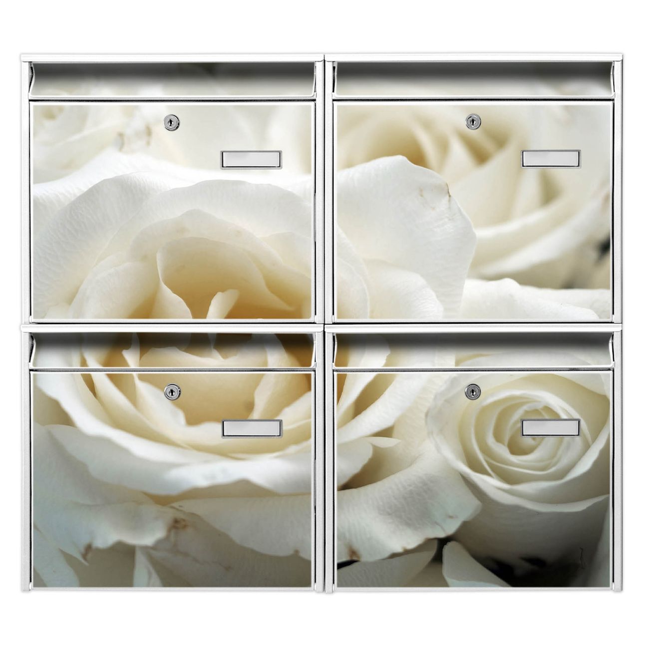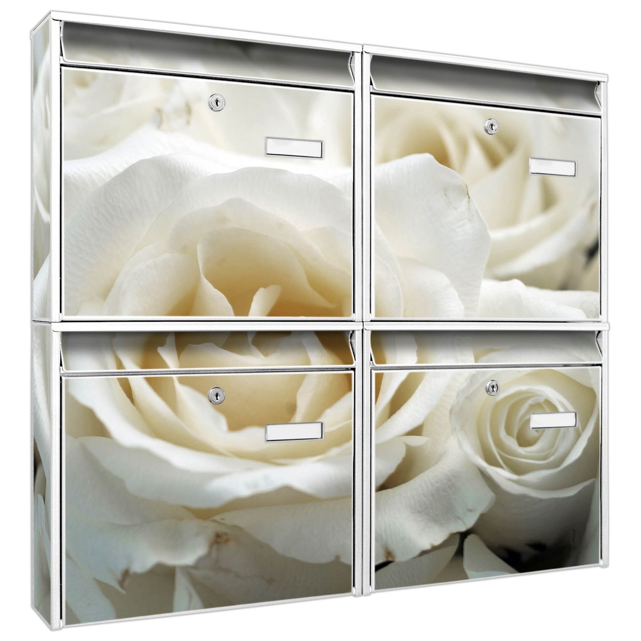 FUNKTION: Die Burg-Wächter Briefkastenanlage mit Motiv White Roses bietet Ihnen ausreichend Fassungsvermögen um auch A4 und C4 Sendungen zu empfangen. Das integrierte Namensschild lässt sich individuell beschriften. Wählen Sie aus den Grundfarben weiß, silber und schwarz. DESIGN: Die 4 Briefkästen haben ein ansprechendes und zeitloses Design, ohne dabei auf Funktionalität zu verzichten. Das Material ist sehr stabil, wetterfest und rostfrei. Durch das Motiv White Roses werden die Postkästen zu einem Blickfang. DETAILS: Die Postkästen bestehen aus verzinktem Stahl der zusätzlich mit Klarlack versiegelt wurde. Die Kästen sind gesamt 64,5cm hoch, 72,5cm breit und 10cm tief. Das Motiv besteht aus einer wetter- und UV-festen Folie, die Ihren Briefkasten zusätzlich vor Kratzern schützt. Die Postkästen werden mit Montagematerial, je einem Namensschild und je zwei Schlüsseln geliefert. NUTZEN: Das Briefkastenset eignet sich für die Wandmontage, die Größe bietet genügend Platz für Sendungen aller Art. Das zeitlose Design sowie die stabile Bauart bieten Ihnen einen treuen Begleiter für Ihre Post. BANJADO: