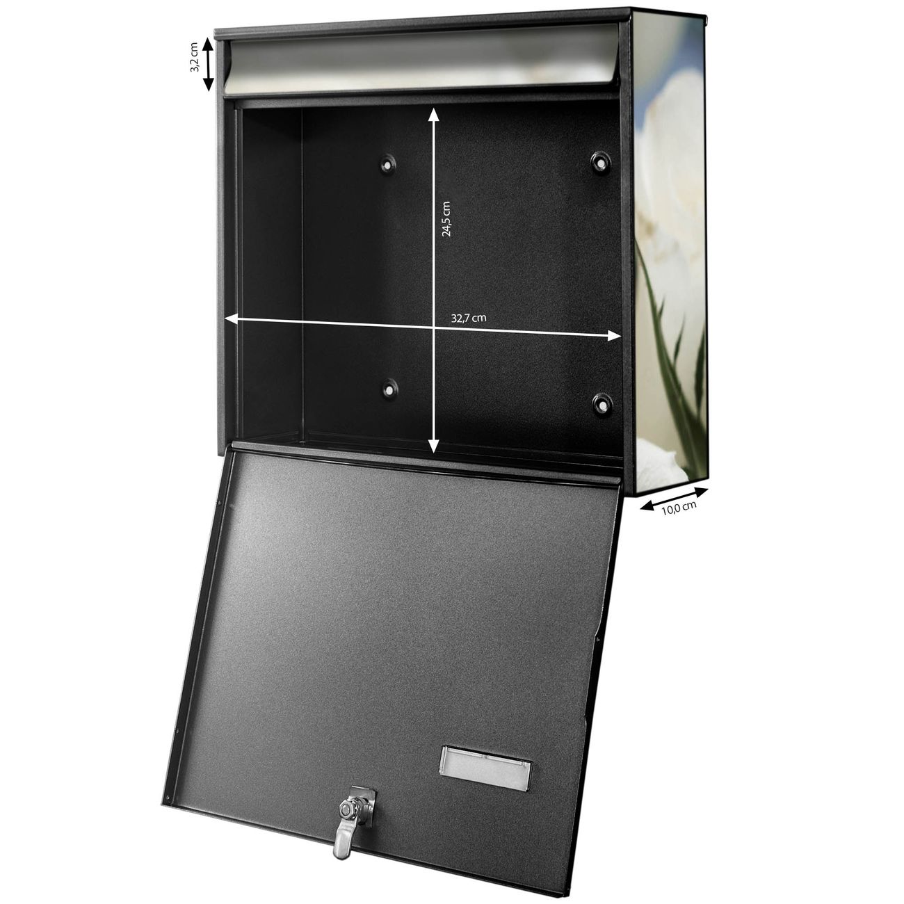 FUNKTION: Die Burg-Wächter Briefkastenanlage mit Motiv White Roses bietet Ihnen ausreichend Fassungsvermögen um auch A4 und C4 Sendungen zu empfangen. Das integrierte Namensschild lässt sich individuell beschriften. Wählen Sie aus den Grundfarben weiß, silber und schwarz. DESIGN: Die 4 Briefkästen haben ein ansprechendes und zeitloses Design, ohne dabei auf Funktionalität zu verzichten. Das Material ist sehr stabil, wetterfest und rostfrei. Durch das Motiv White Roses werden die Postkästen zu einem Blickfang. DETAILS: Die Postkästen bestehen aus verzinktem Stahl der zusätzlich mit Klarlack versiegelt wurde. Die Kästen sind gesamt 64,5cm hoch, 72,5cm breit und 10cm tief. Das Motiv besteht aus einer wetter- und UV-festen Folie, die Ihren Briefkasten zusätzlich vor Kratzern schützt. Die Postkästen werden mit Montagematerial, je einem Namensschild und je zwei Schlüsseln geliefert. NUTZEN: Das Briefkastenset eignet sich für die Wandmontage, die Größe bietet genügend Platz für Sendungen aller Art. Das zeitlose Design sowie die stabile Bauart bieten Ihnen einen treuen Begleiter für Ihre Post. BANJADO: