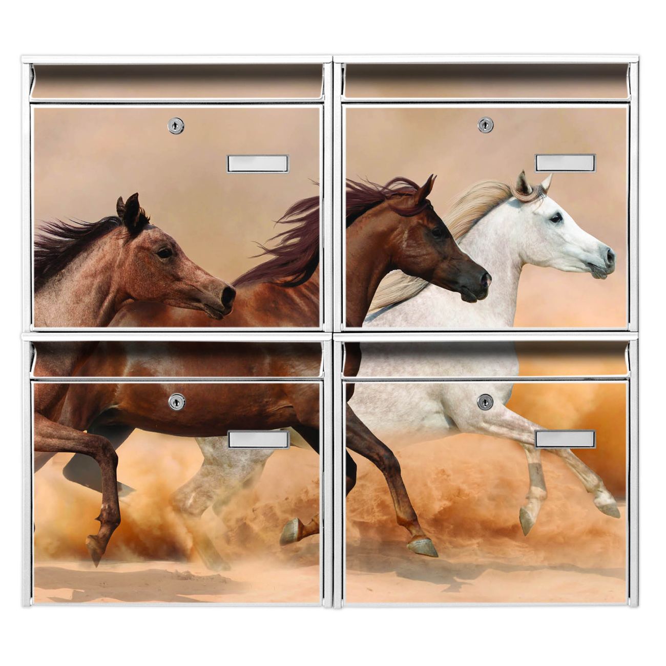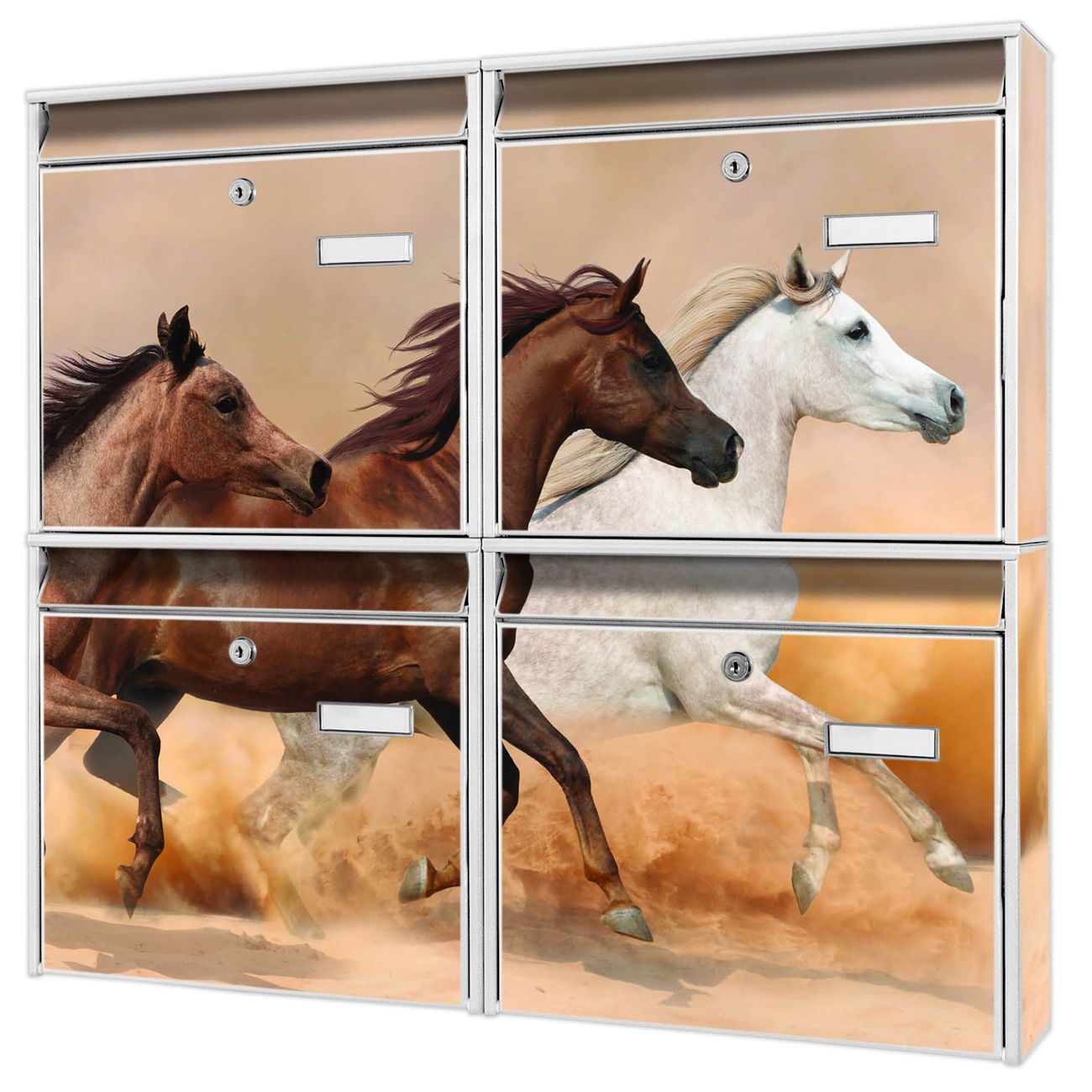 FUNKTION: Die Burg-Wächter Briefkastenanlage mit Motiv Wilde Pferde bietet Ihnen ausreichend Fassungsvermögen um auch A4 und C4 Sendungen zu empfangen. Das integrierte Namensschild lässt sich individuell beschriften. Wählen Sie aus den Grundfarben weiß, silber und schwarz. DESIGN: Die 4 Briefkästen haben ein ansprechendes und zeitloses Design, ohne dabei auf Funktionalität zu verzichten. Das Material ist sehr stabil, wetterfest und rostfrei. Durch das Motiv Wilde Pferde werden die Postkästen zu einem Blickfang. DETAILS: Die Postkästen bestehen aus verzinktem Stahl der zusätzlich mit Klarlack versiegelt wurde. Die Kästen sind gesamt 64,5cm hoch, 72,5cm breit und 10cm tief. Das Motiv besteht aus einer wetter- und UV-festen Folie, die Ihren Briefkasten zusätzlich vor Kratzern schützt. Die Postkästen werden mit Montagematerial, je einem Namensschild und je zwei Schlüsseln geliefert. NUTZEN: Das Briefkastenset eignet sich für die Wandmontage, die Größe bietet genügend Platz für Sendungen aller Art. Das zeitlose Design sowie die stabile Bauart bieten Ihnen einen treuen Begleiter für Ihre Post. BANJADO: