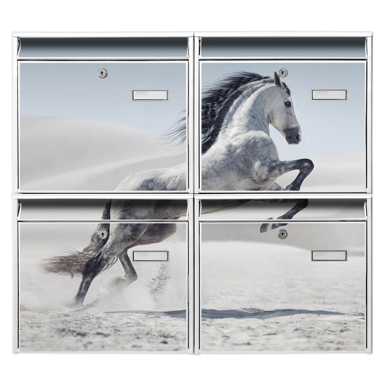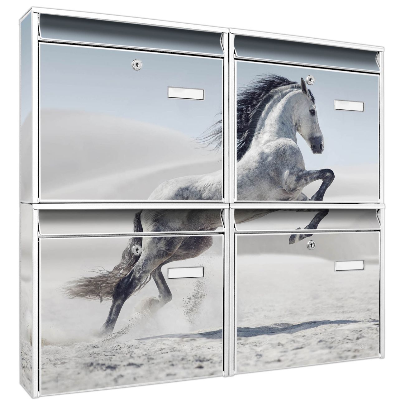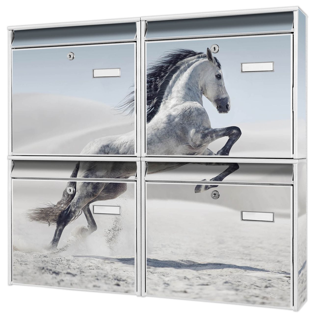 FUNKTION: Die Burg-Wächter Briefkastenanlage mit Motiv Wildes Pferd bietet Ihnen ausreichend Fassungsvermögen um auch A4 und C4 Sendungen zu empfangen. Das integrierte Namensschild lässt sich individuell beschriften. Wählen Sie aus den Grundfarben weiß, silber und schwarz. DESIGN: Die 4 Briefkästen haben ein ansprechendes und zeitloses Design, ohne dabei auf Funktionalität zu verzichten. Das Material ist sehr stabil, wetterfest und rostfrei. Durch das Motiv Wildes Pferd werden die Postkästen zu einem Blickfang. DETAILS: Die Postkästen bestehen aus verzinktem Stahl der zusätzlich mit Klarlack versiegelt wurde. Die Kästen sind gesamt 64,5cm hoch, 72,5cm breit und 10cm tief. Das Motiv besteht aus einer wetter- und UV-festen Folie, die Ihren Briefkasten zusätzlich vor Kratzern schützt. Die Postkästen werden mit Montagematerial, je einem Namensschild und je zwei Schlüsseln geliefert. NUTZEN: Das Briefkastenset eignet sich für die Wandmontage, die Größe bietet genügend Platz für Sendungen aller Art. Das zeitlose Design sowie die stabile Bauart bieten Ihnen einen treuen Begleiter für Ihre Post. BANJADO:
