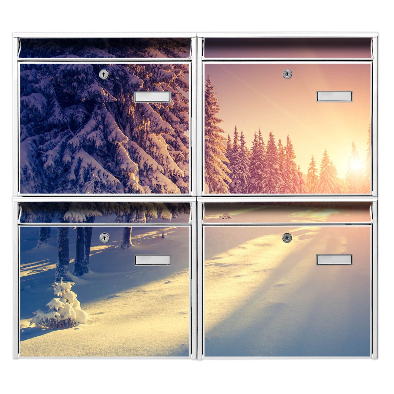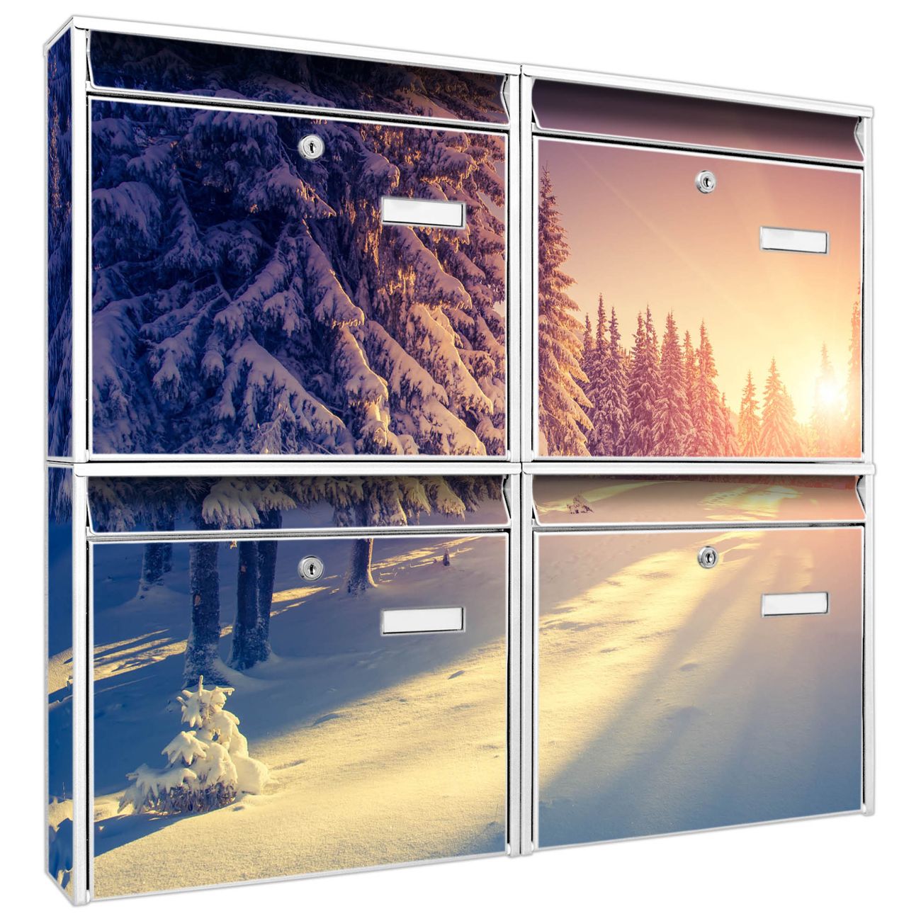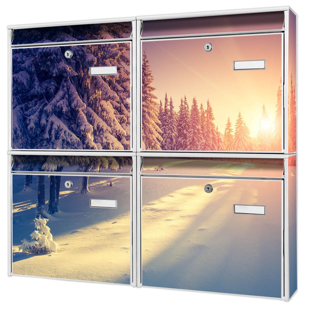 FUNKTION: Die Burg-Wächter Briefkastenanlage mit Motiv Winterabend bietet Ihnen ausreichend Fassungsvermögen um auch A4 und C4 Sendungen zu empfangen. Das integrierte Namensschild lässt sich individuell beschriften. Wählen Sie aus den Grundfarben weiß, silber und schwarz. DESIGN: Die 4 Briefkästen haben ein ansprechendes und zeitloses Design, ohne dabei auf Funktionalität zu verzichten. Das Material ist sehr stabil, wetterfest und rostfrei. Durch das Motiv Winterabend werden die Postkästen zu einem Blickfang. DETAILS: Die Postkästen bestehen aus verzinktem Stahl der zusätzlich mit Klarlack versiegelt wurde. Die Kästen sind gesamt 64,5cm hoch, 72,5cm breit und 10cm tief. Das Motiv besteht aus einer wetter- und UV-festen Folie, die Ihren Briefkasten zusätzlich vor Kratzern schützt. Die Postkästen werden mit Montagematerial, je einem Namensschild und je zwei Schlüsseln geliefert. NUTZEN: Das Briefkastenset eignet sich für die Wandmontage, die Größe bietet genügend Platz für Sendungen aller Art. Das zeitlose Design sowie die stabile Bauart bieten Ihnen einen treuen Begleiter für Ihre Post. BANJADO: