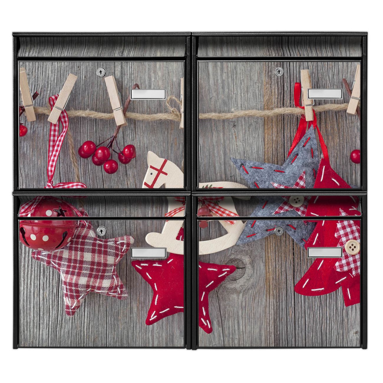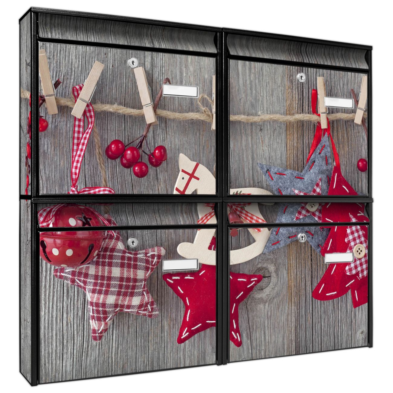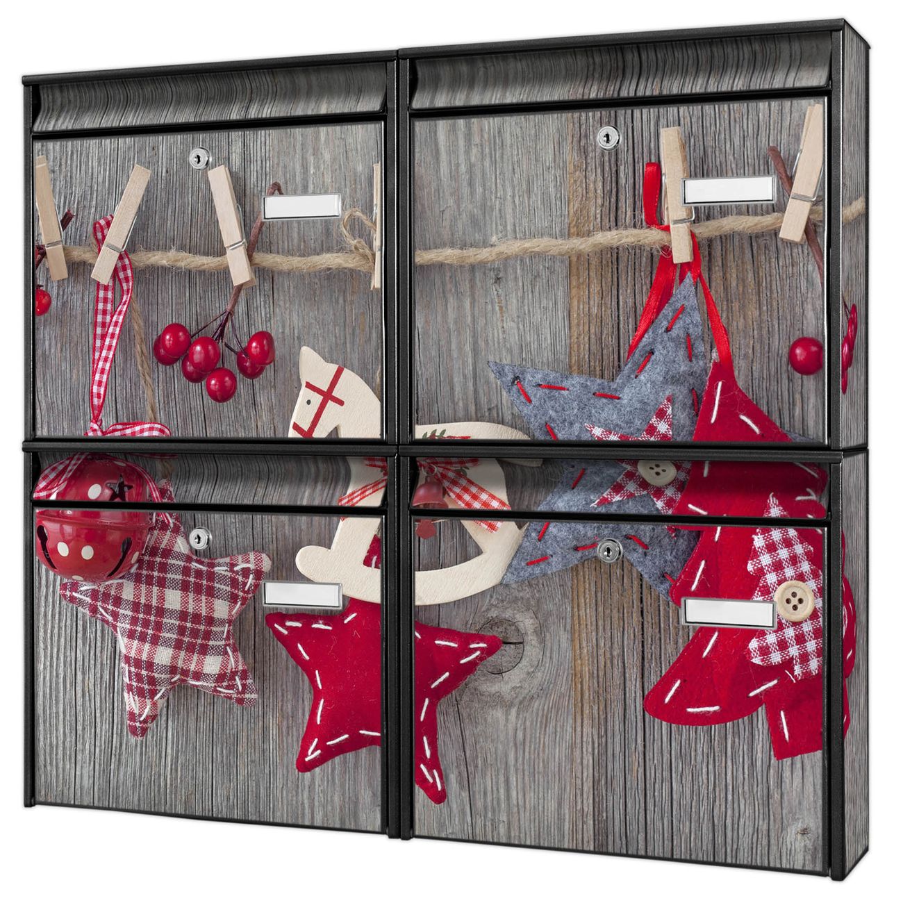 FUNKTION: Die Burg-Wächter Briefkastenanlage mit Motiv Winterdekoration bietet Ihnen ausreichend Fassungsvermögen um auch A4 und C4 Sendungen zu empfangen. Das integrierte Namensschild lässt sich individuell beschriften. Wählen Sie aus den Grundfarben weiß, silber und schwarz. DESIGN: Die 4 Briefkästen haben ein ansprechendes und zeitloses Design, ohne dabei auf Funktionalität zu verzichten. Das Material ist sehr stabil, wetterfest und rostfrei. Durch das Motiv Winterdekoration werden die Postkästen zu einem Blickfang. DETAILS: Die Postkästen bestehen aus verzinktem Stahl der zusätzlich mit Klarlack versiegelt wurde. Die Kästen sind gesamt 64,5cm hoch, 72,5cm breit und 10cm tief. Das Motiv besteht aus einer wetter- und UV-festen Folie, die Ihren Briefkasten zusätzlich vor Kratzern schützt. Die Postkästen werden mit Montagematerial, je einem Namensschild und je zwei Schlüsseln geliefert. NUTZEN: Das Briefkastenset eignet sich für die Wandmontage, die Größe bietet genügend Platz für Sendungen aller Art. Das zeitlose Design sowie die stabile Bauart bieten Ihnen einen treuen Begleiter für Ihre Post. BANJADO: