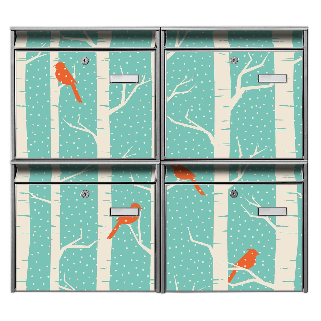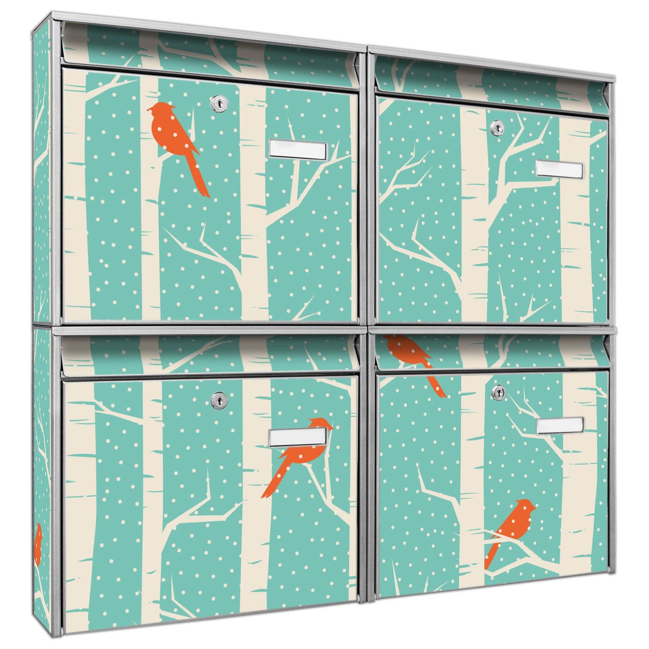 FUNKTION: Die Burg-Wächter Briefkastenanlage mit Motiv Wintervögel bietet Ihnen ausreichend Fassungsvermögen um auch A4 und C4 Sendungen zu empfangen. Das integrierte Namensschild lässt sich individuell beschriften. Wählen Sie aus den Grundfarben weiß, silber und schwarz. DESIGN: Die 4 Briefkästen haben ein ansprechendes und zeitloses Design, ohne dabei auf Funktionalität zu verzichten. Das Material ist sehr stabil, wetterfest und rostfrei. Durch das Motiv Wintervögel werden die Postkästen zu einem Blickfang. DETAILS: Die Postkästen bestehen aus verzinktem Stahl der zusätzlich mit Klarlack versiegelt wurde. Die Kästen sind gesamt 64,5cm hoch, 72,5cm breit und 10cm tief. Das Motiv besteht aus einer wetter- und UV-festen Folie, die Ihren Briefkasten zusätzlich vor Kratzern schützt. Die Postkästen werden mit Montagematerial, je einem Namensschild und je zwei Schlüsseln geliefert. NUTZEN: Das Briefkastenset eignet sich für die Wandmontage, die Größe bietet genügend Platz für Sendungen aller Art. Das zeitlose Design sowie die stabile Bauart bieten Ihnen einen treuen Begleiter für Ihre Post. BANJADO: